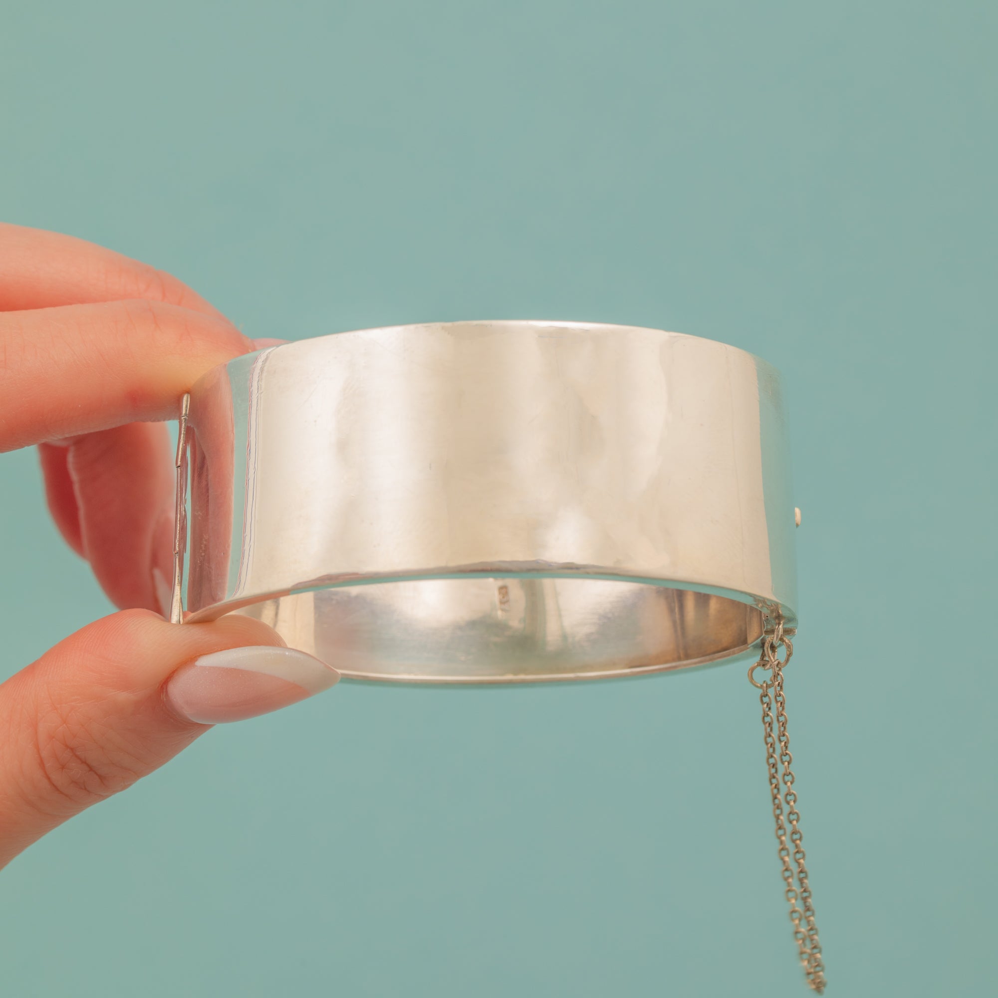Crafted from wonderfully glossy Sterling Silver, this wide bangle provides great wrist coverage. If you are looking for some statement wrist candy, this antique Silver cuff bangle is a top choice.