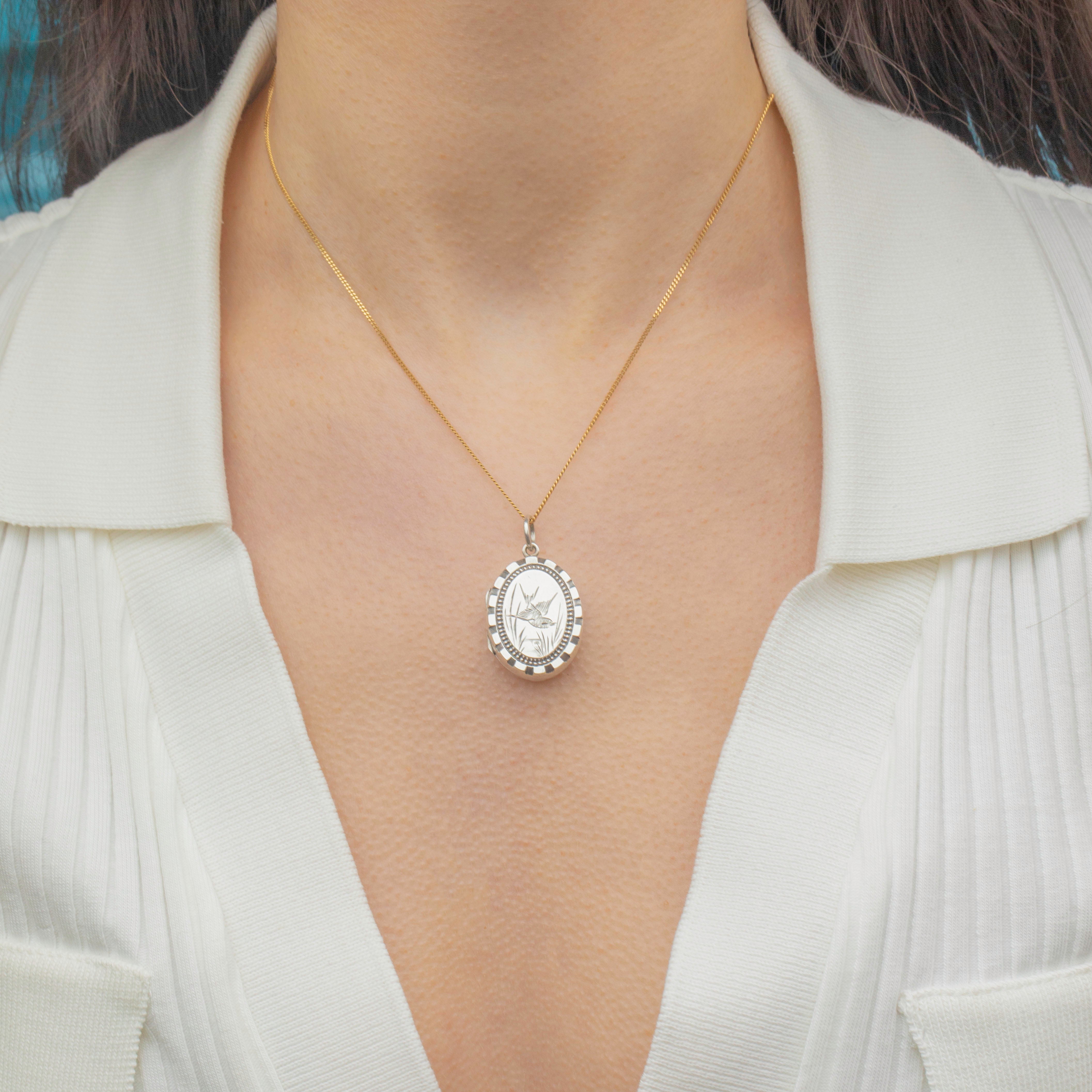 This Victorian Aesthetic Silver engraved swallow locket has a striking and bold design! Crafted from Sterling Silver and petite in size, this antique locket is the perfect choice for everyday wear.
