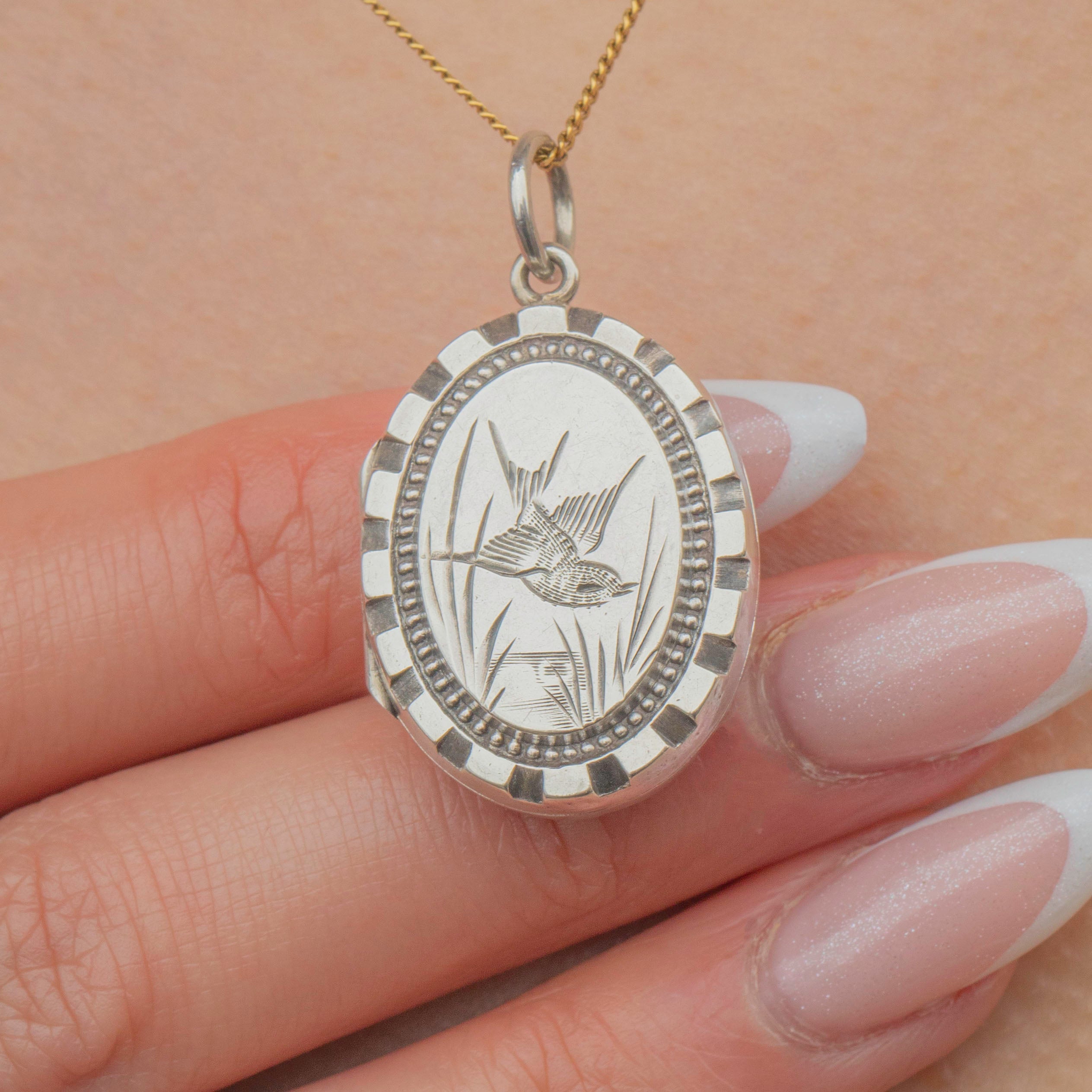 Victorian Aesthetic Silver Engraved Swallow Locket c.1884