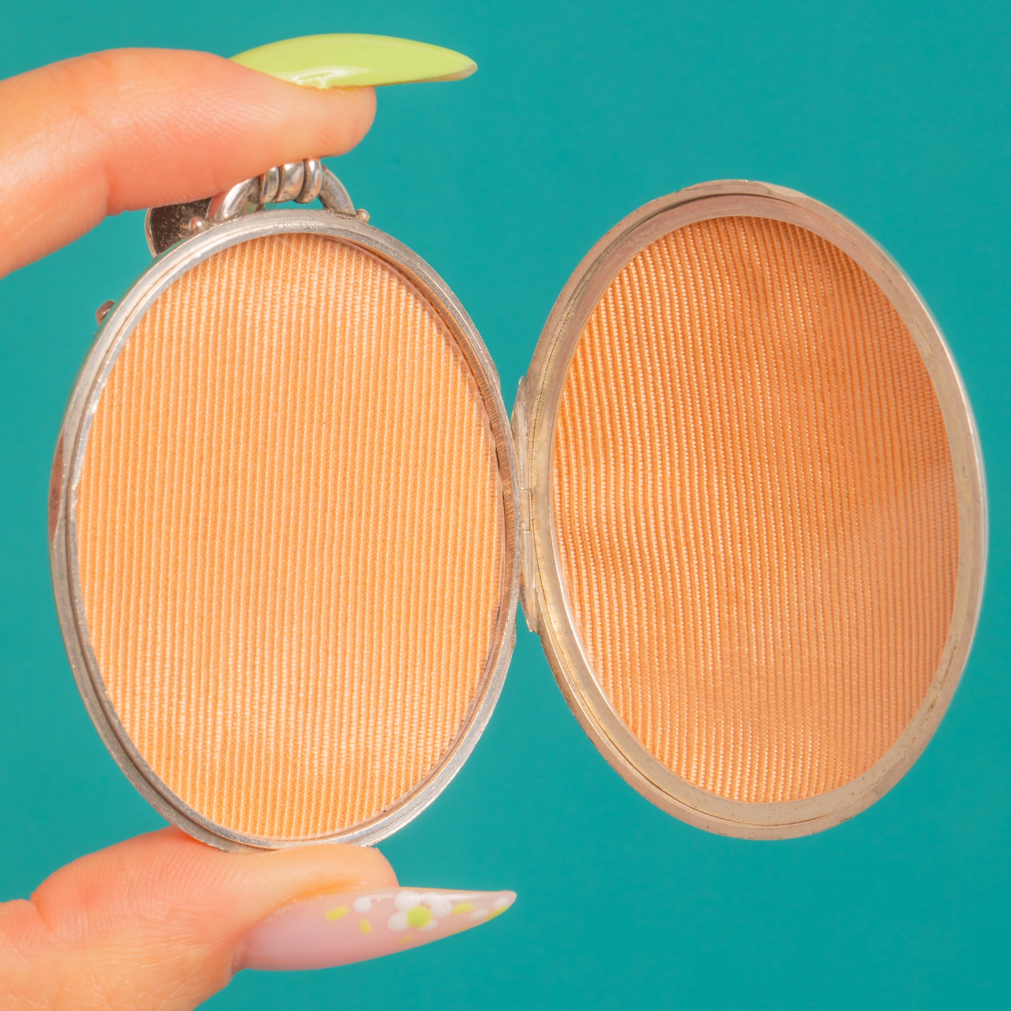 優れた状態:シルバー表面にはごく浅いヘアライン傷や、経年に伴うわずかな擦れが見られるのみで、ローズゴールドとイエローゴールドのハイライト部分も柔らかく美しい風合いを保っています。エッジ部分もきれいで、ごく小さな表面的な傷のみです。ヒンジとスナップ式の留め具はしっかりと機能し、内側の写真フレームも残っています。目立つ修理跡や改変はありません。