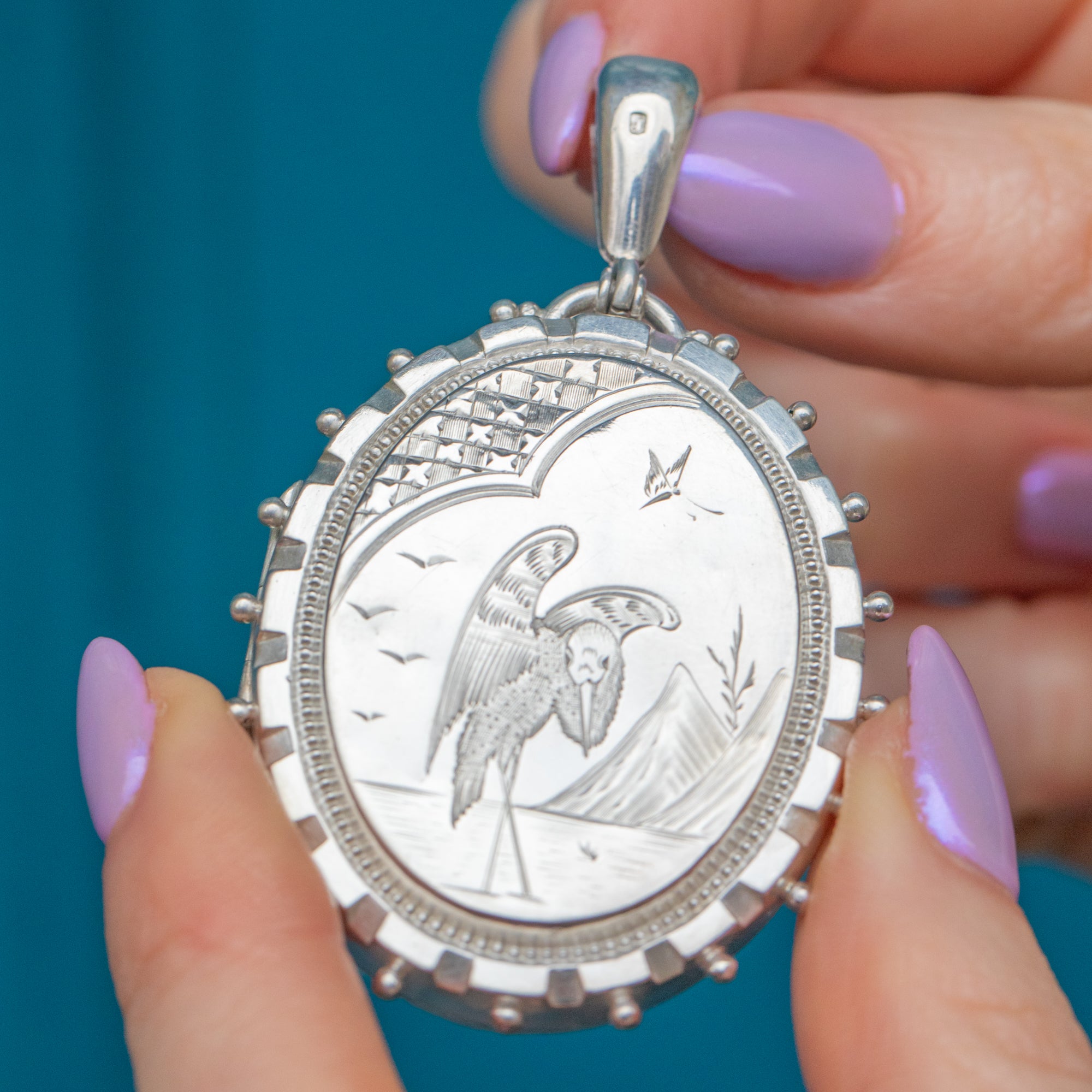 This Victorian Aesthetic Silver locket is an impressive piece guaranteed to bring you joy! The lustrous Sterling Silver has been intricately engraved, depicting a mountainous landscape with a stork foraging amongst wetlands surrounded by flying birds and a fluttering butterfly.