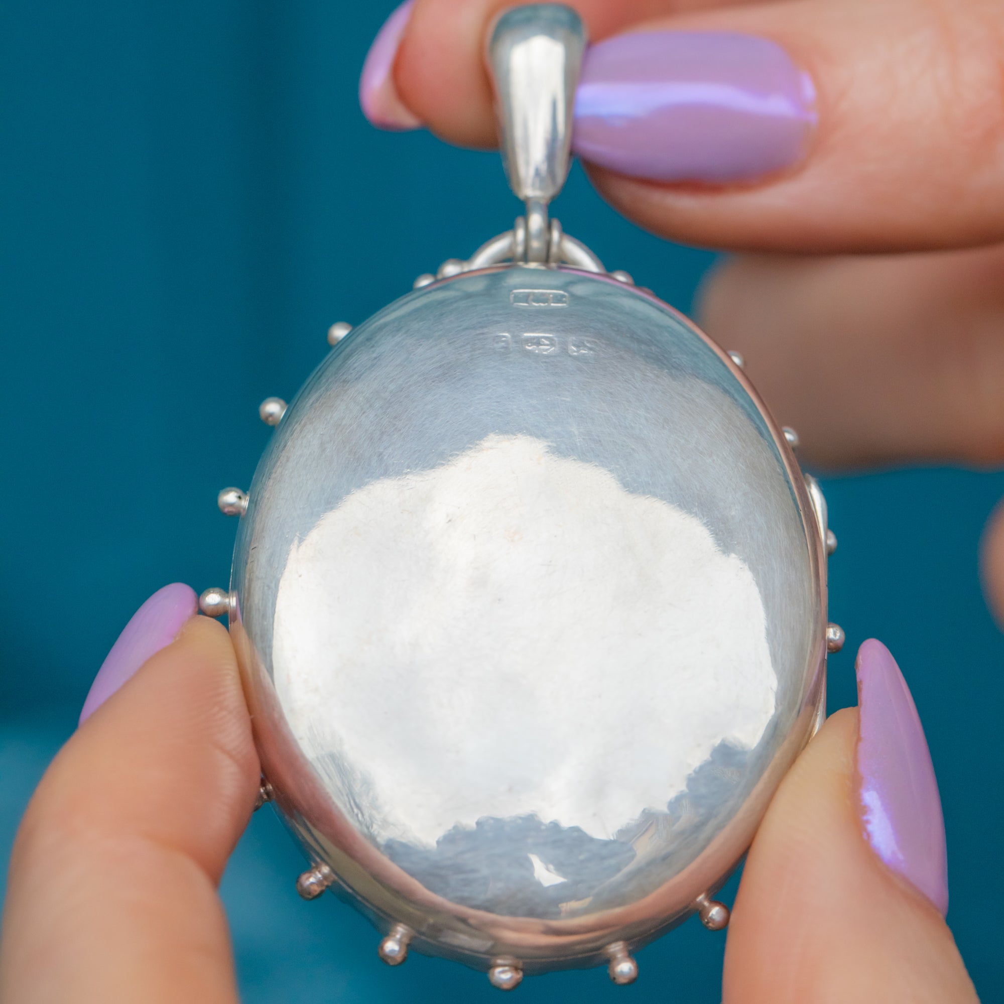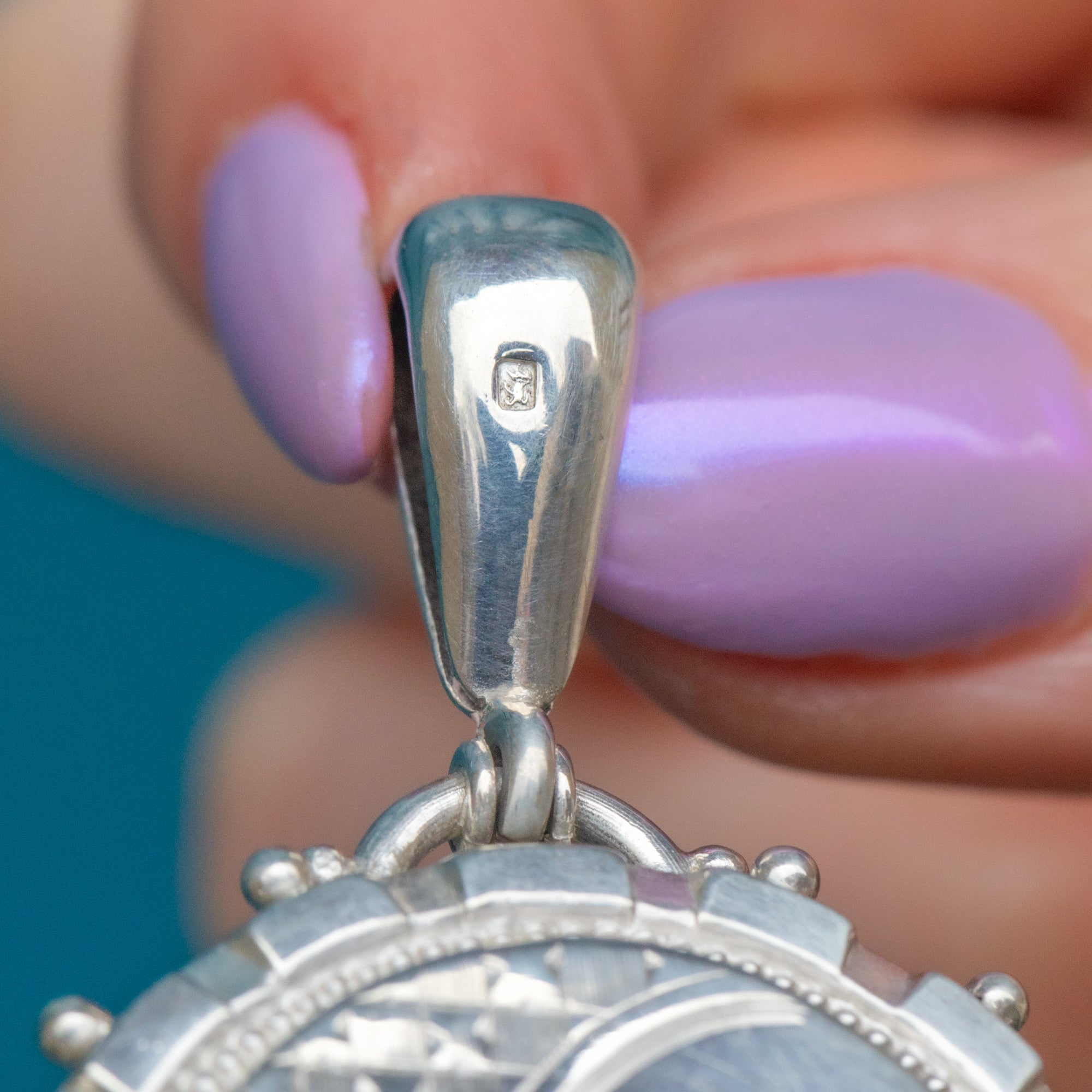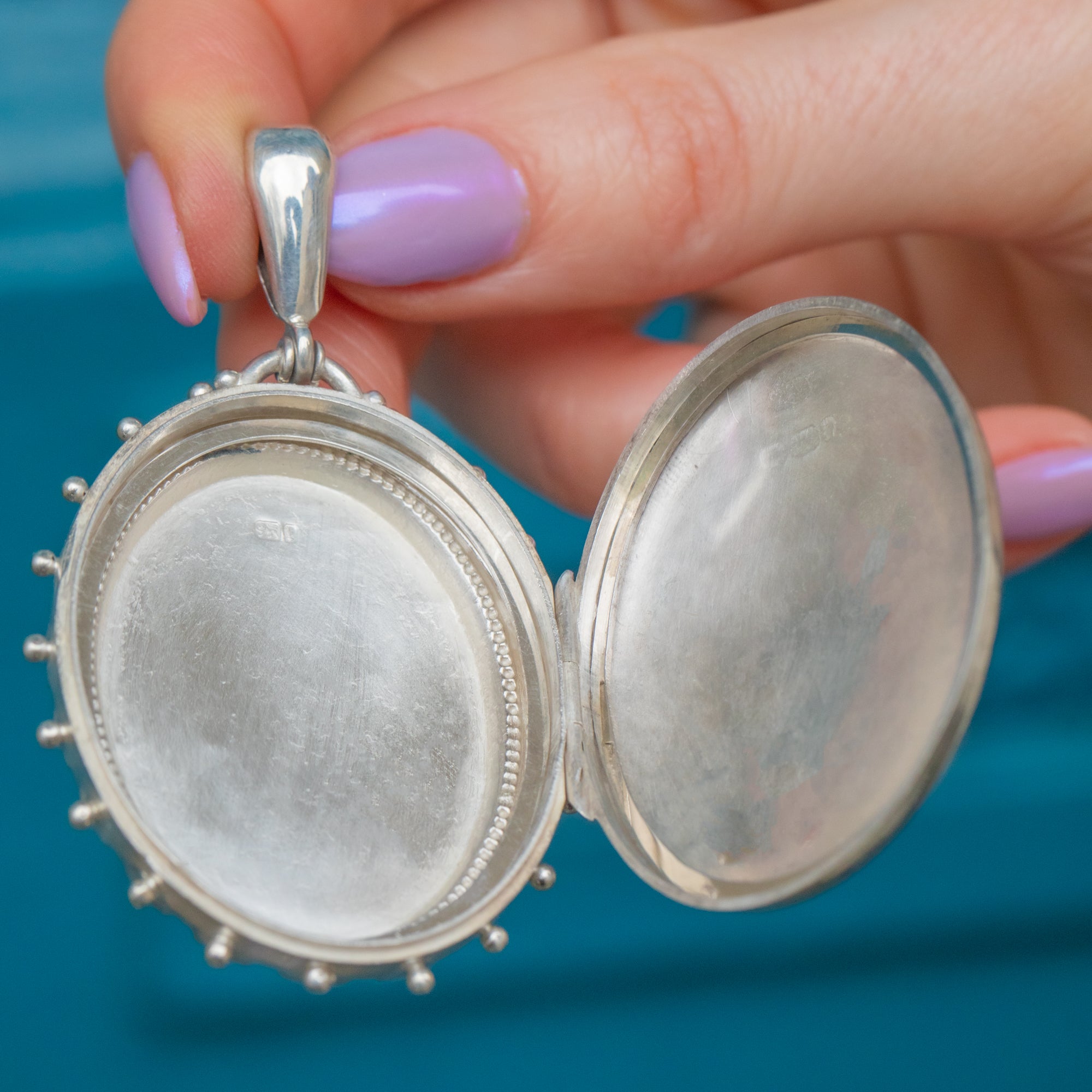 VERY GOOD. This Victorian Aesthetic Silver locket is in very good condition. The Silver is bright with only minor surface wear, including a little ding on the back of the locket. The engraved details are gorgeous and have all remained defined, and the beads around the edge of the locket are all present. With two frames, you can securely place your most cherished photographs inside!