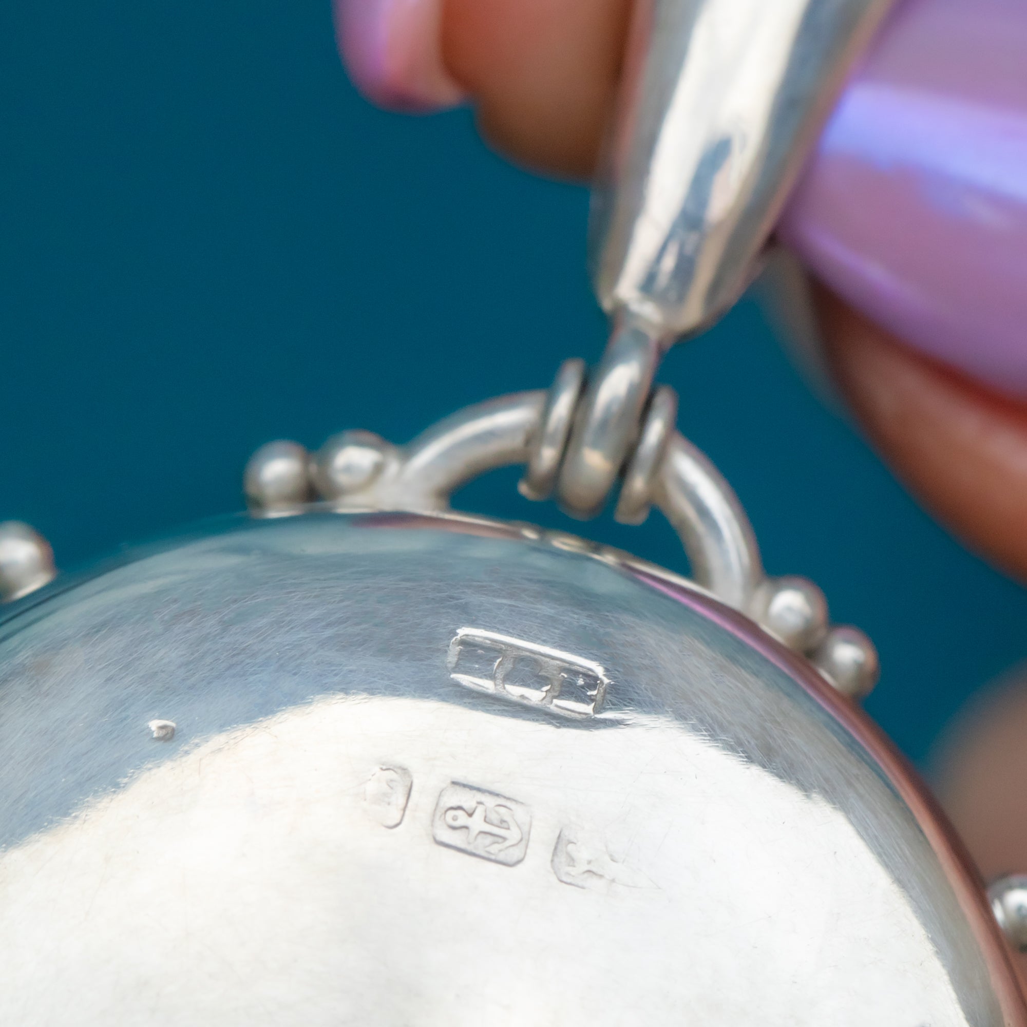 HALLMARKS: H&E Makers mark, Birmingham Anchor, Lion Passant, Date letter f for 1880. Lion Passant on inside frame.