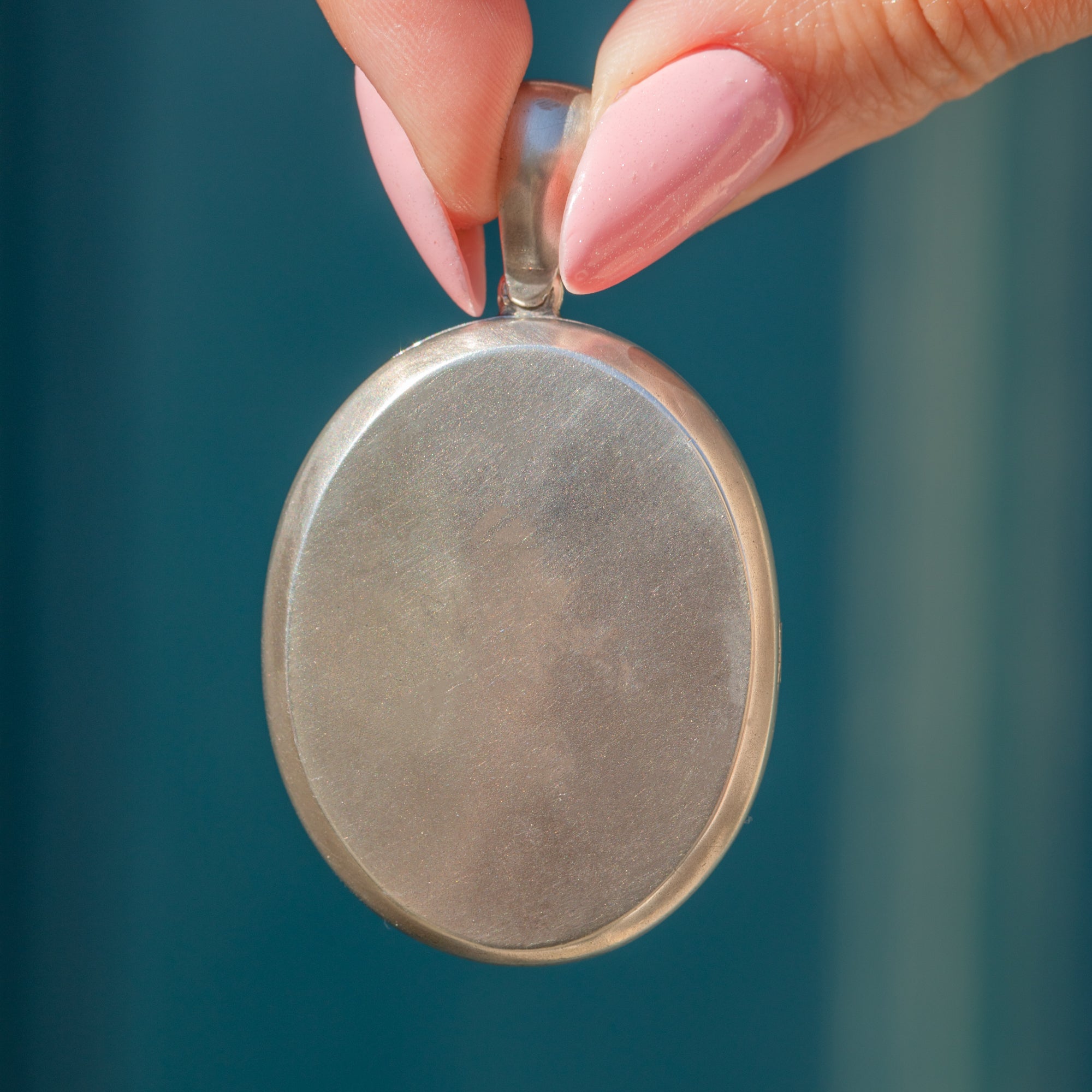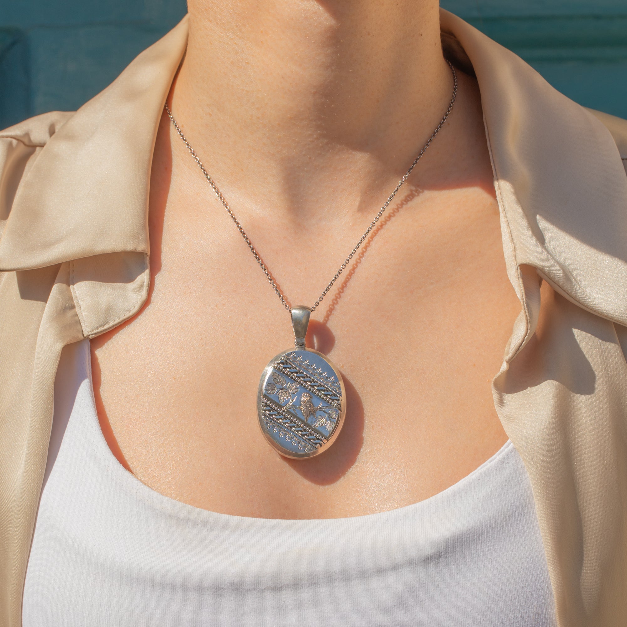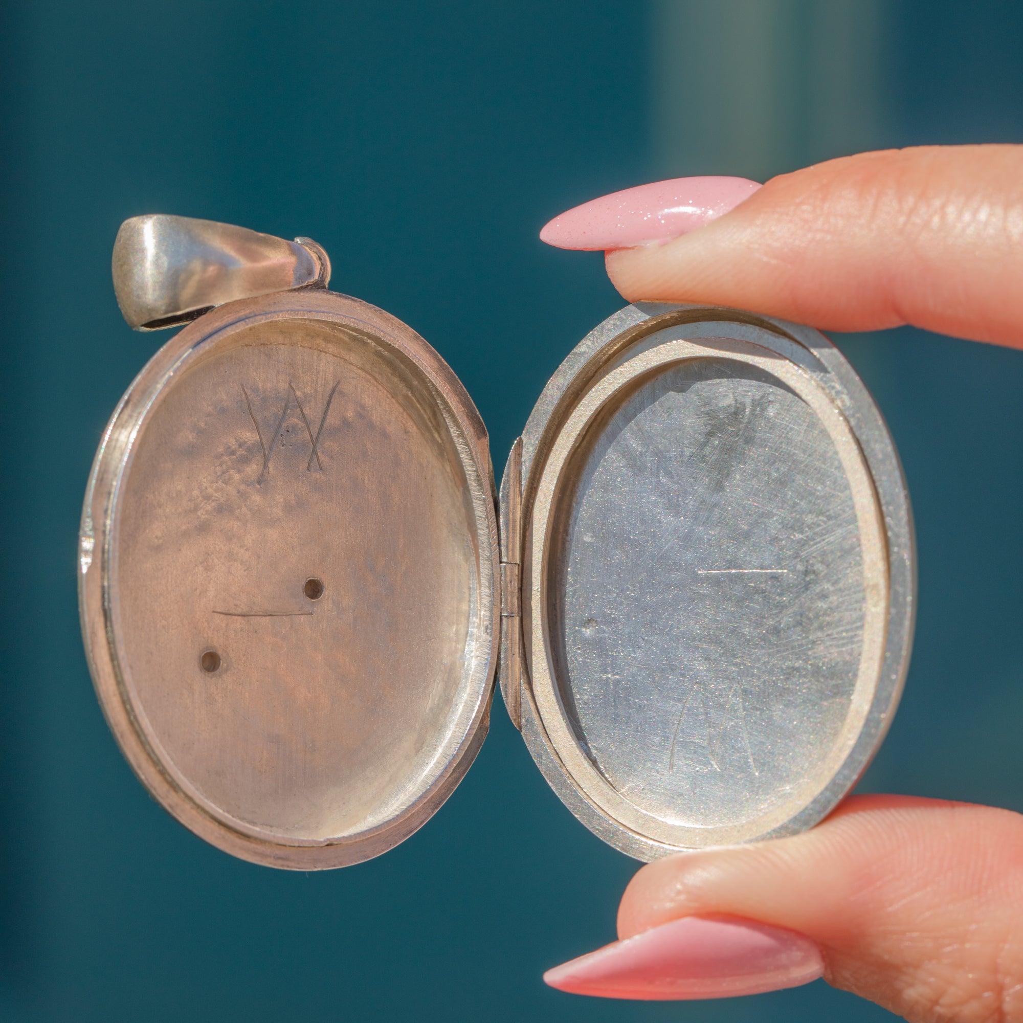 VERY GOOD-EXCELLENT: This Victorian Aesthetic Silver oval locket is in wonderful condition. The Silver is lustrous and the details have all remained crisp and defined. The bale has a minor split but is still robust, and there is some mild surface wear on the back and inside the locket. This wear is commensurate with age and does not impact the beauty or wearability of the piece. Most importantly, the front is immaculate and the locket closes securely, allowing you to keep your memories safely inside. With a large bale, you can easily suspend this outstanding Victorian Aesthetic locket from a chain of your choice!