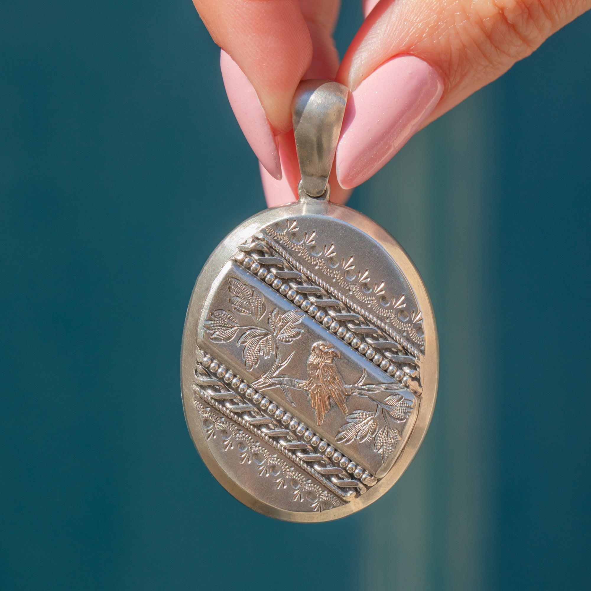 Victorian Aesthetic Silver Oval Locket with 9ct Gold Bird