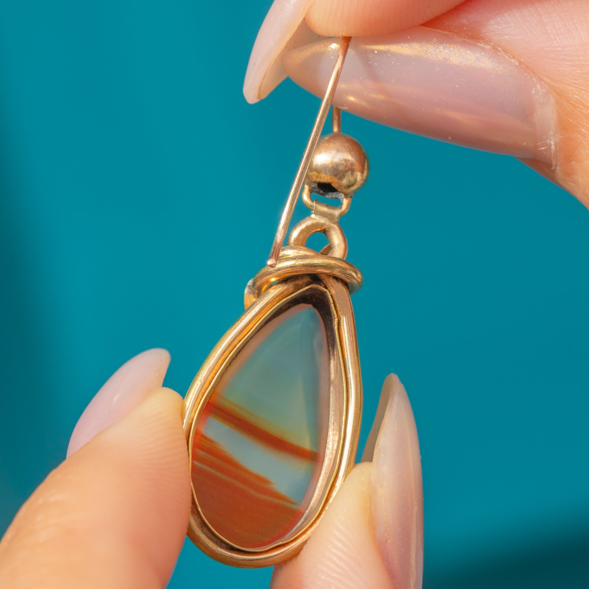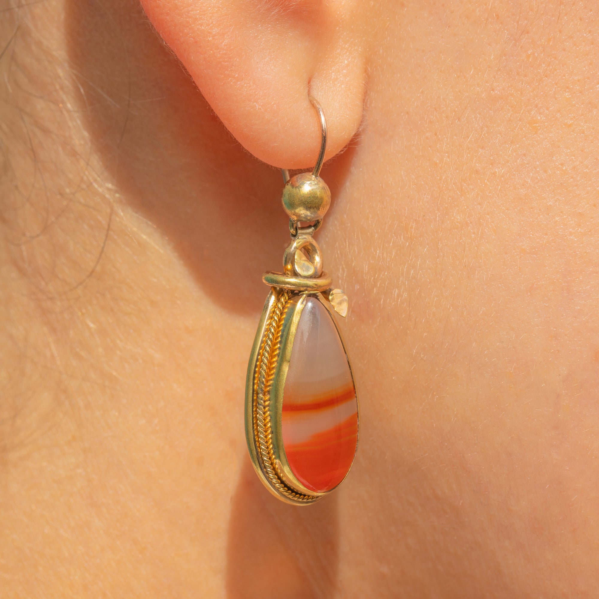A striking pair of Antique Victorian teardrop earrings set with beautifully banded Agates in painterly tones of russet, orange, and milky white. Each natural cabochon is mounted in a rich Pinchbeck bezel with a rope border detail, enhanced by delicate foliate and bead motifs at the tops. The warm, earthy palette of the Agates gives these earrings a unique character and a timeless natural beauty.