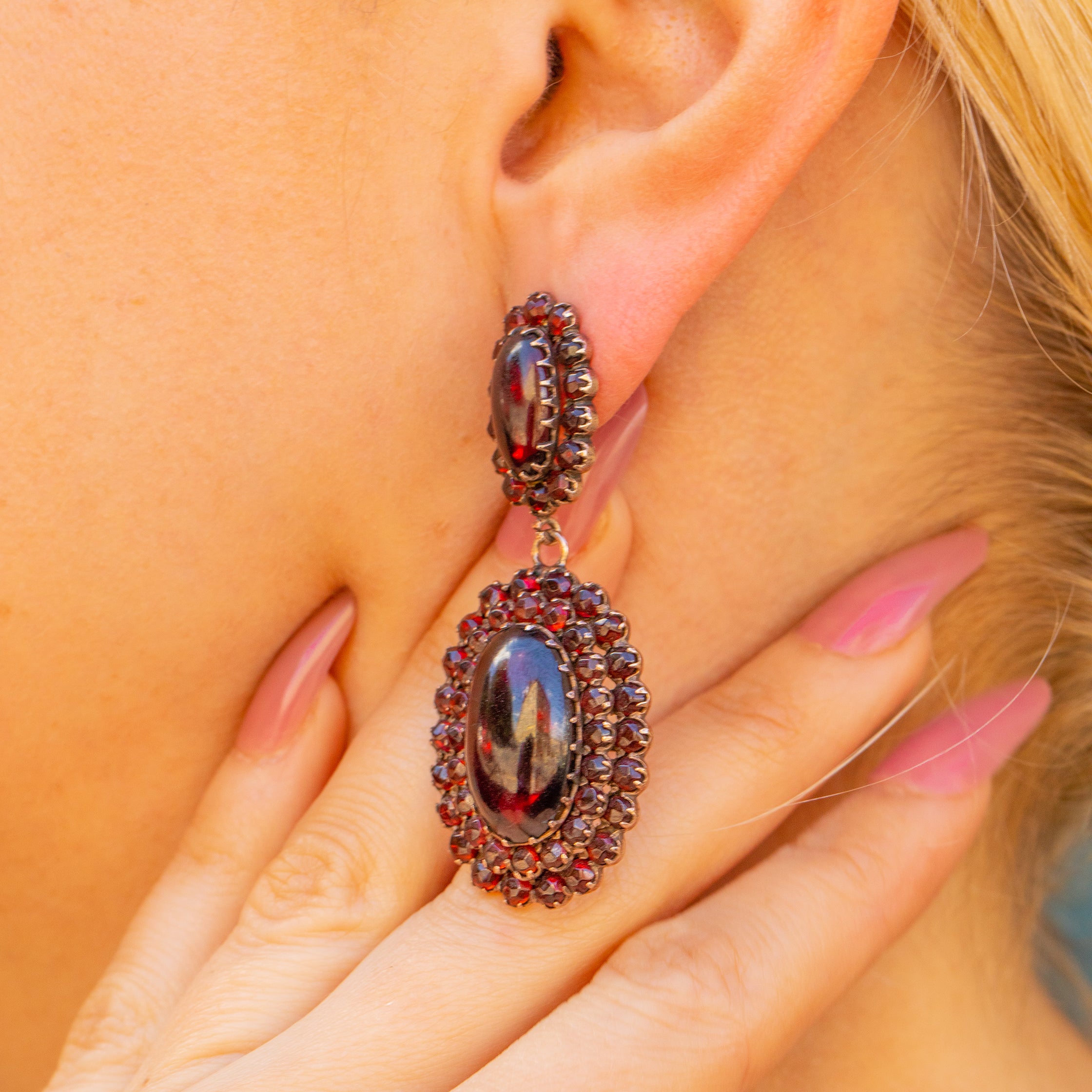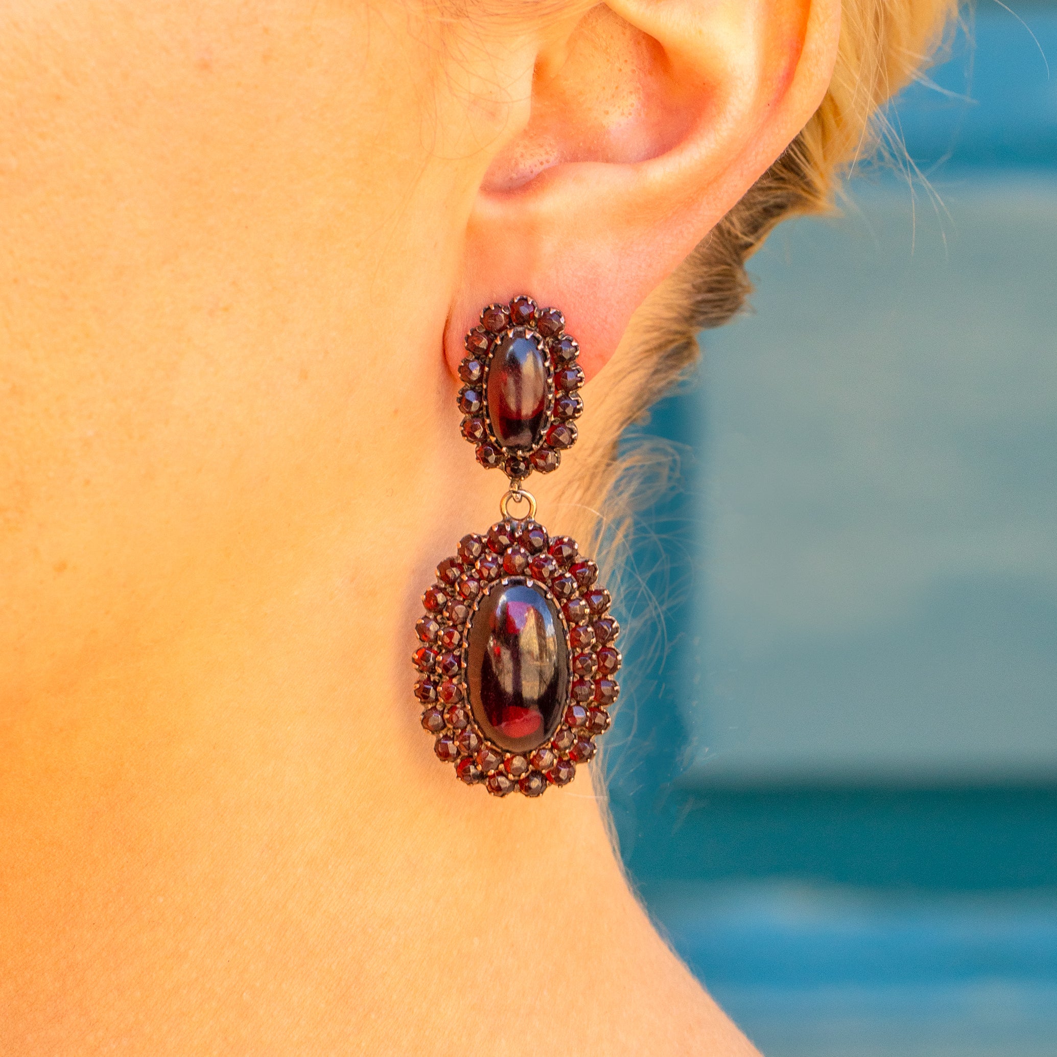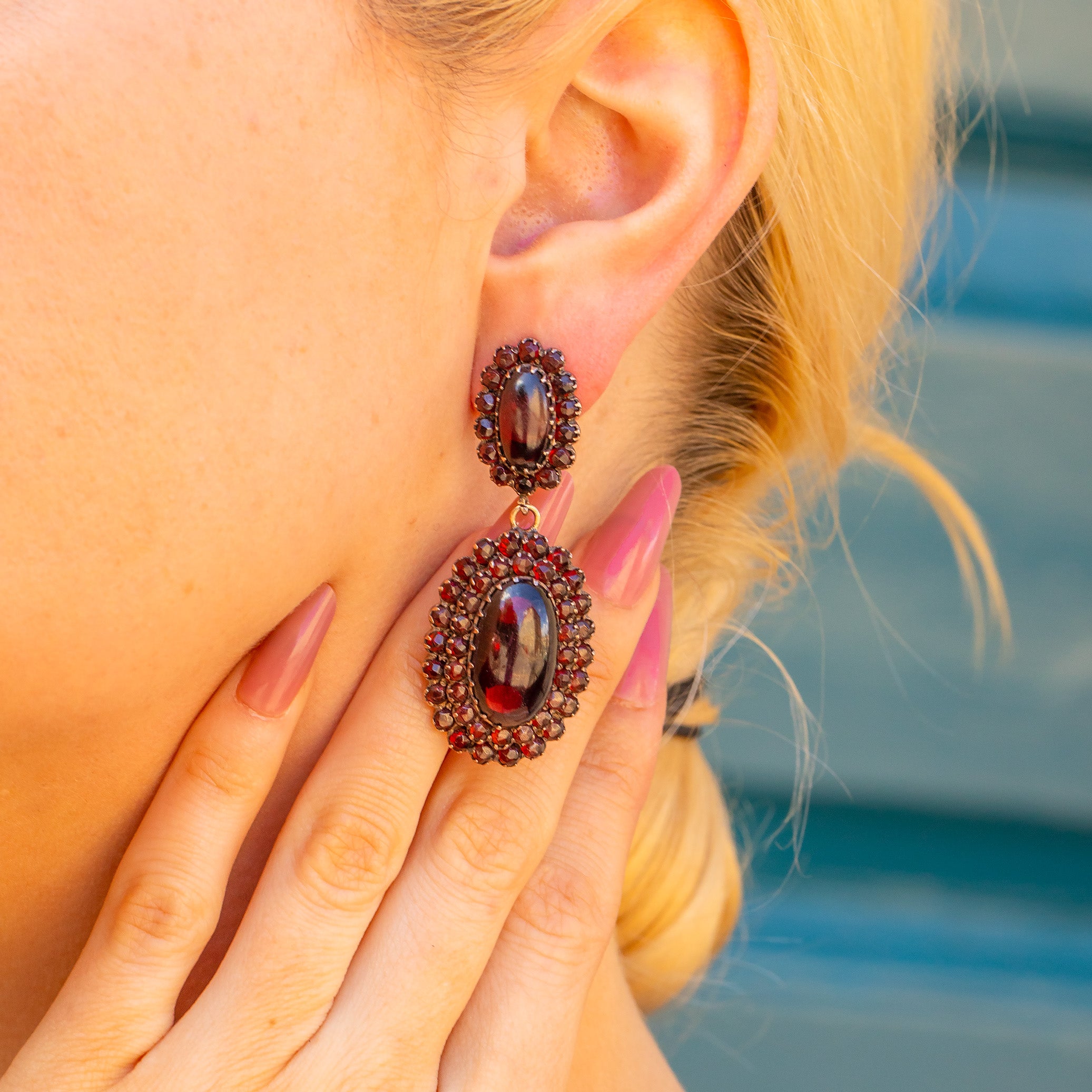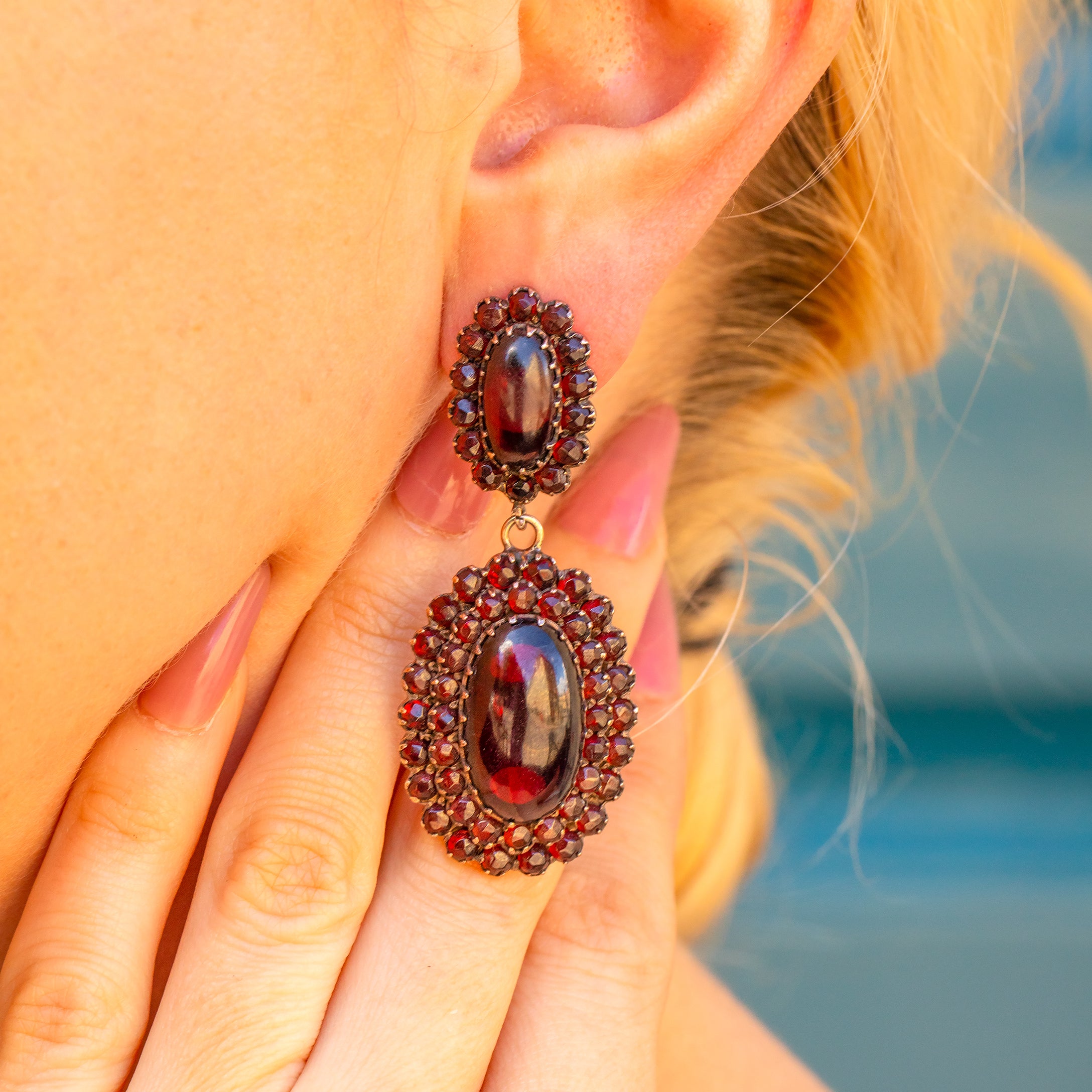 These Victorian Bohemian Garnet drop earrings ooze gothic glamour! Originating from Bohemia, the Garnets set within these Victorian earrings are renowned for their deep red hue, with their rose-cuts providing sparkle in abundance.