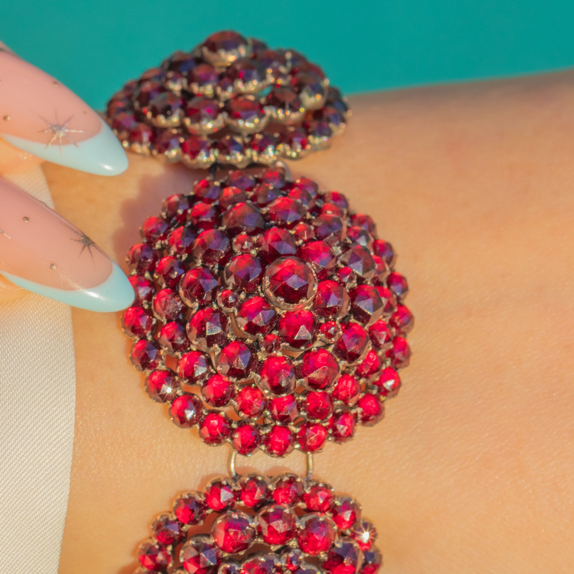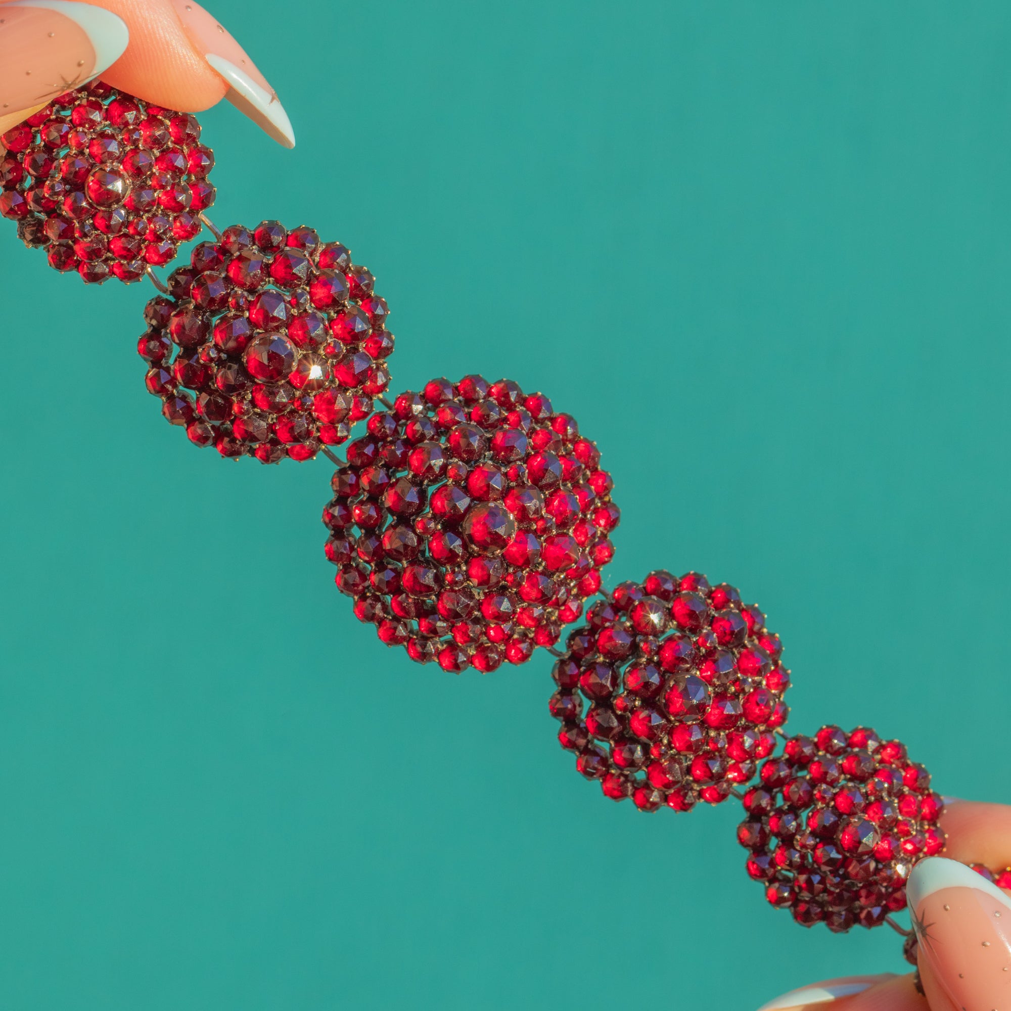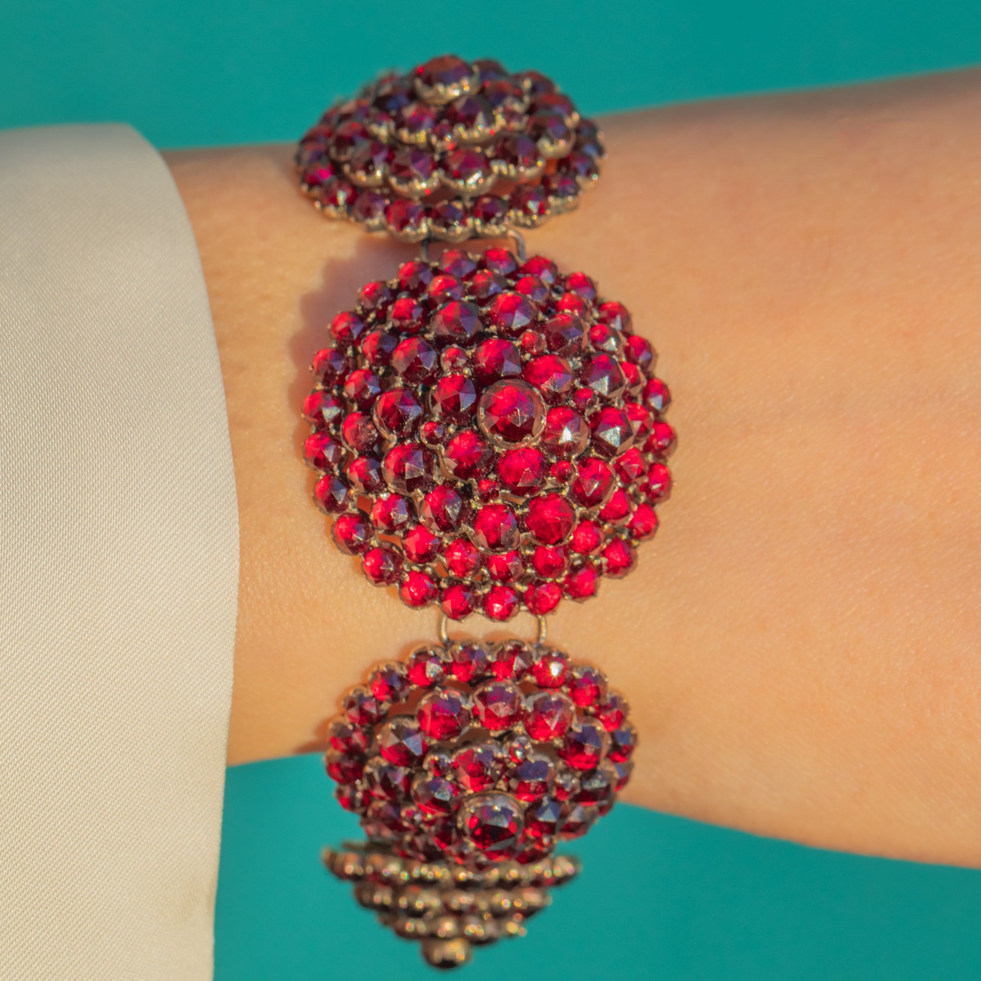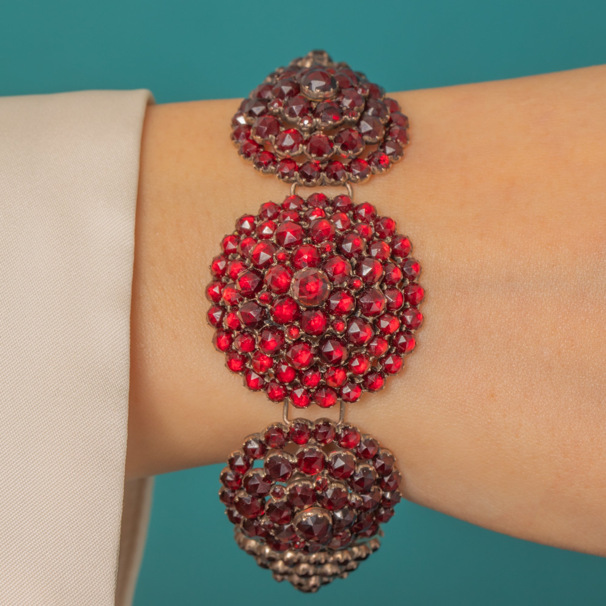 A sumptuous Victorian Bohemian rose-cut Garnet bracelet composed of graduated, domed rosette panels, each packed with glowing Garnets arranged in concentric halos. The rich crimson sparkle dances across the wrist, enhanced by closed-back cluster settings and the warm hue of Garnet Gold. Articulated links lend graceful movement and comfort, while an integrated rosette box clasp with a neat side safety keeps everything secure.