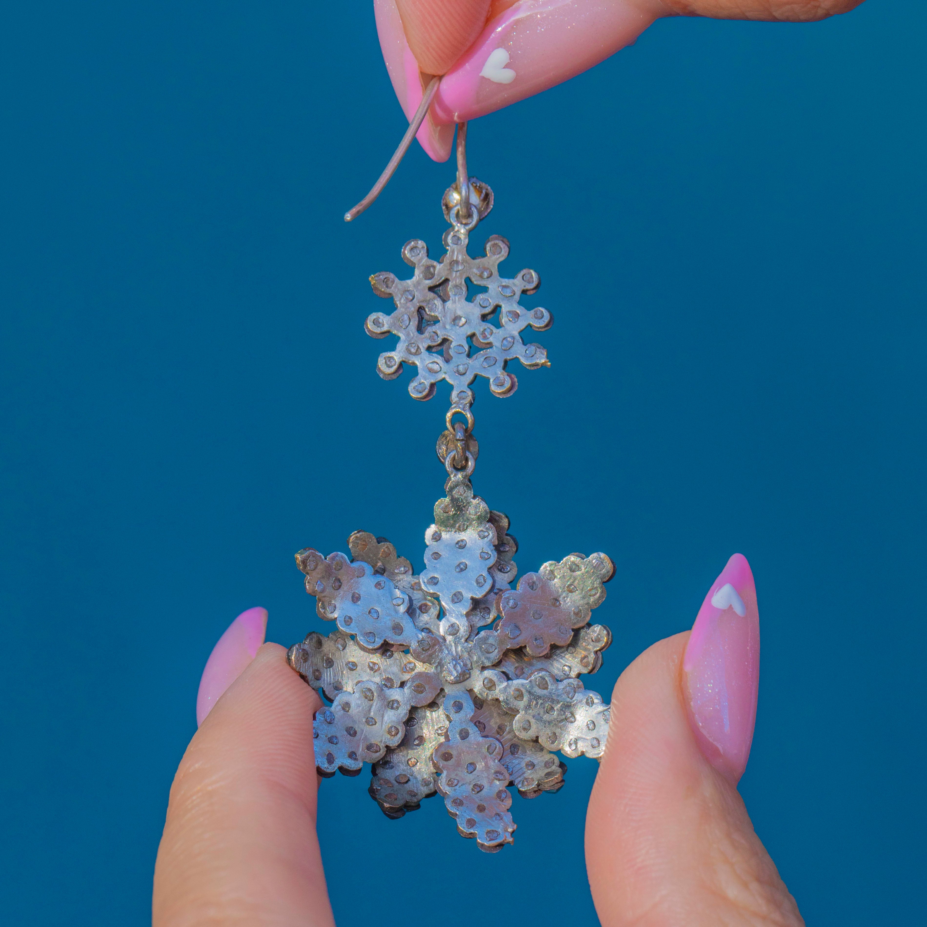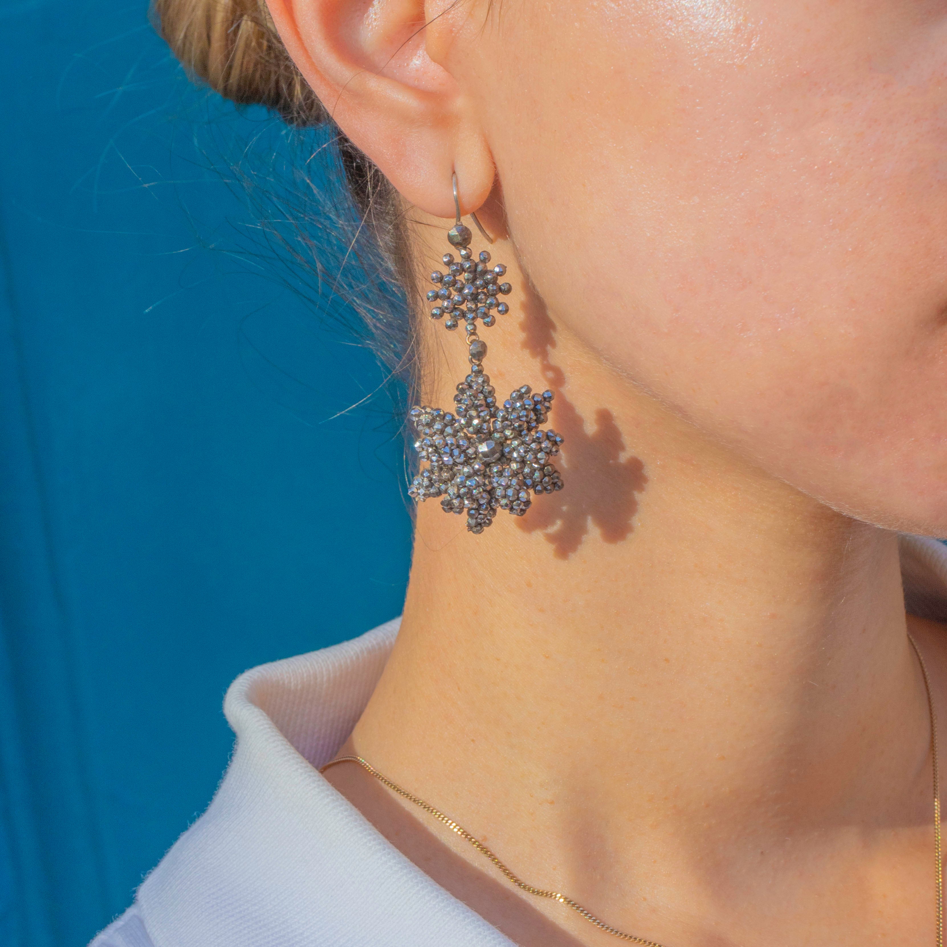 Magnificent Victorian star drop earrings crafted from sparkling Cut Steel, dating to circa 1860. Each earring features two articulated star motifs, a smaller accent star at the top and a larger, dazzling star below, suspended from Sterling Silver French hooks for comfortable wear.