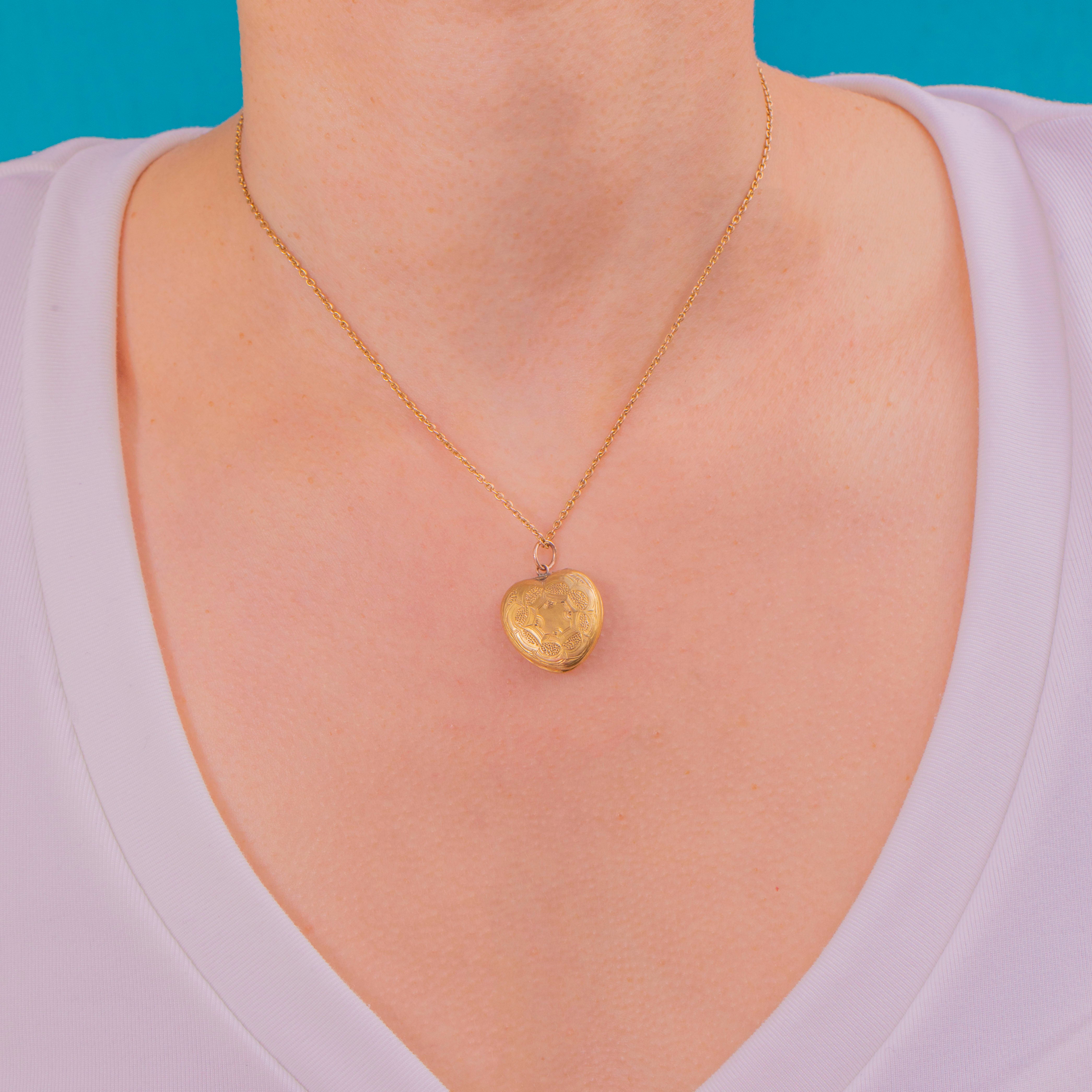 Victorian時代のロマンスを象徴する繊細なハートロケット。艶やかな15ctゴールドで丁寧に仕立てられ、美しい手彫りの装飾が施されています。中央には、繊細な星やロゼットが柔らかな槌目模様とパネル状のテクスチャーの上に輝き、動くたびに光を受けてきらめきます。エレガントで時を超えた魅力を持ち、心に寄り添う愛らしい記念品です。
