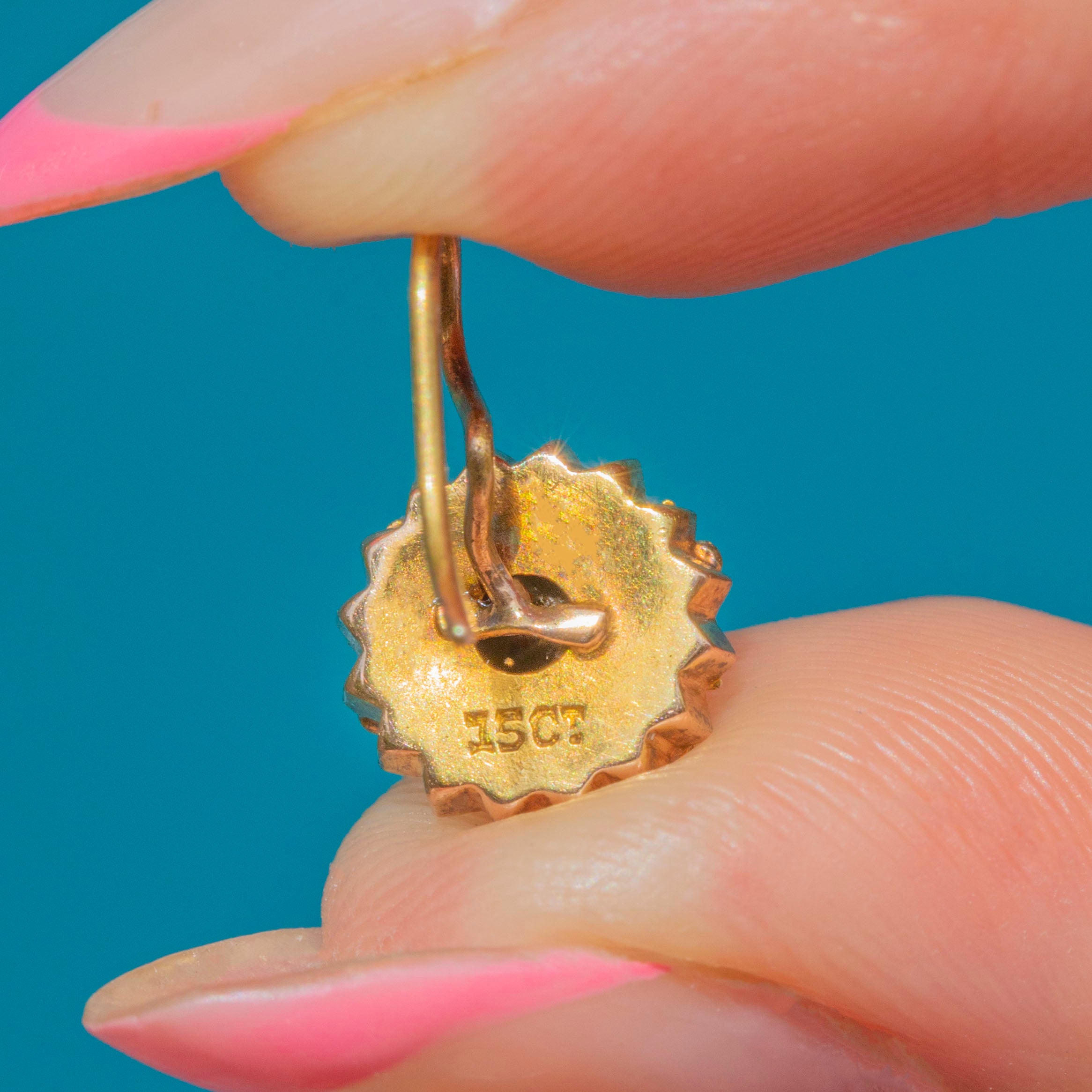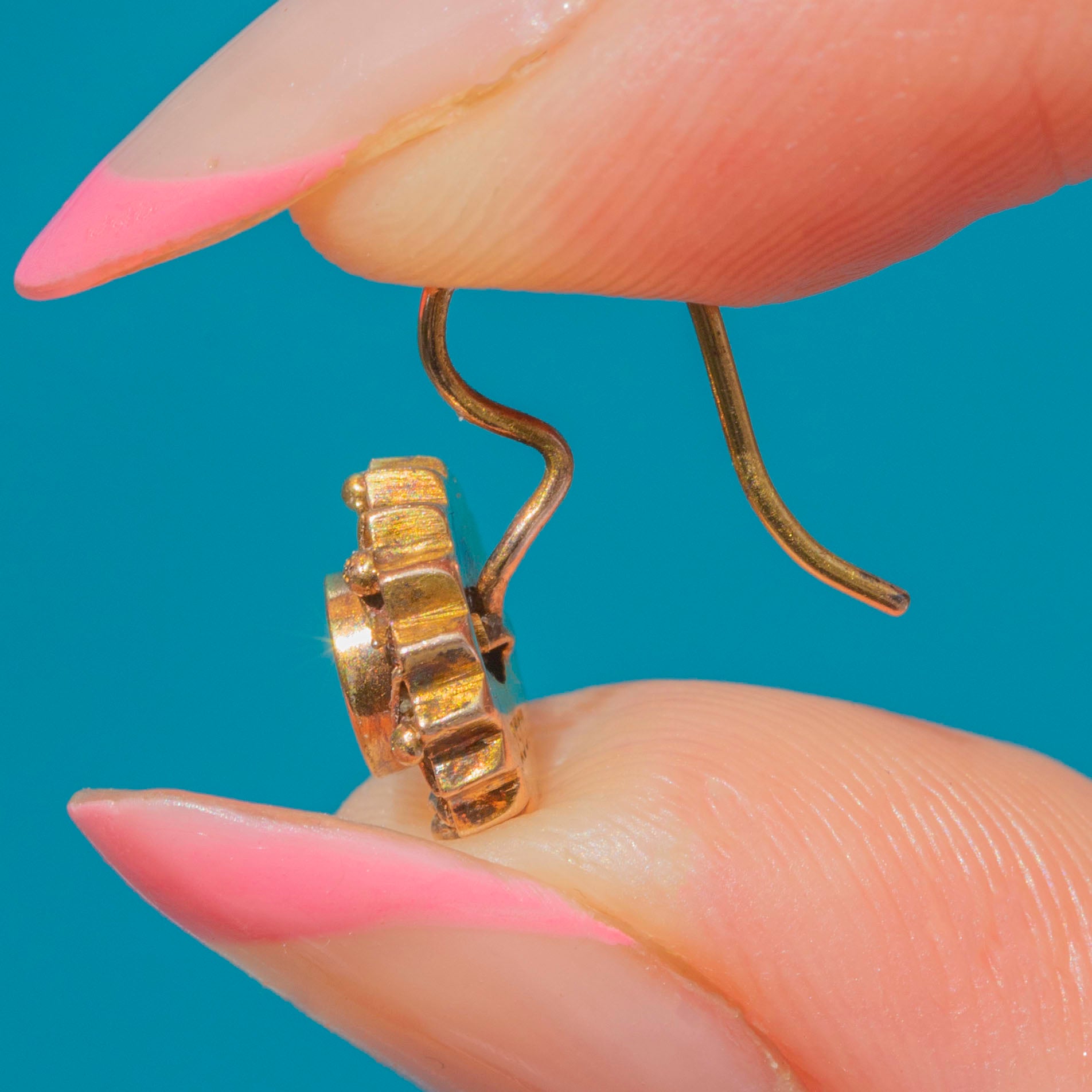 VERY GOOD: These Victorian Etruscan revival 15ct Gold Diamond earrings are in very good condition. Each earring has been crafted wonderfully and holds its rose-cut Diamond securely. There are some signs of wear to the Gold, including discolouration throughout, though this is expected with age. With a warm, golden hue, these Victorian earrings are a must-have pair!