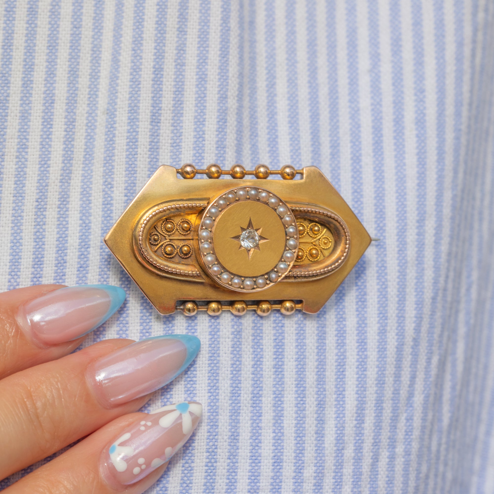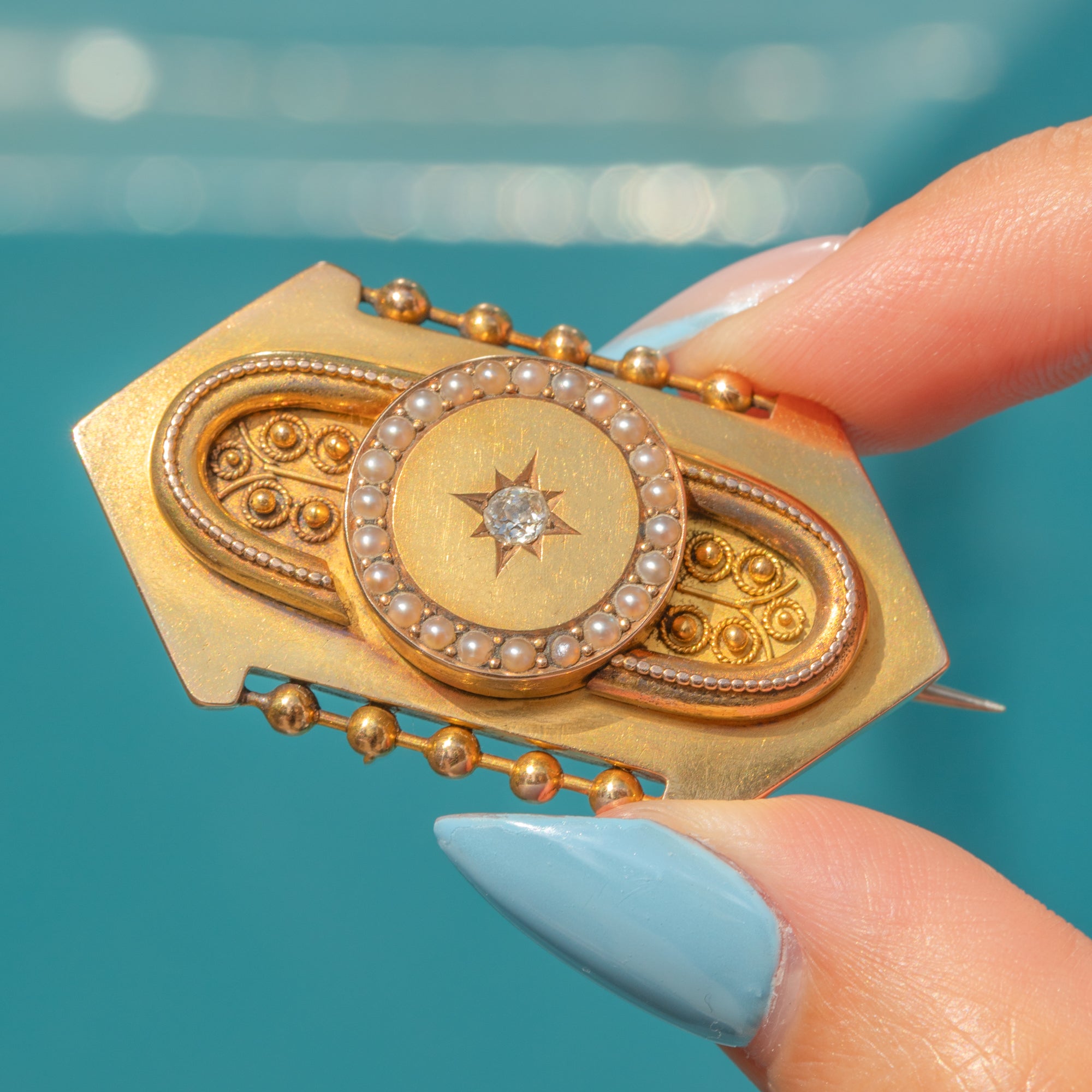 This brightly saturated 18ct Gold brooch is a fine example of Etruscan revival jewellery! The brooch's striking geometric form is inlaid with a glimmering 0.10ct Diamond centre, displayed within a distinct star setting, and is encircled by lusturous Seed Pearls.