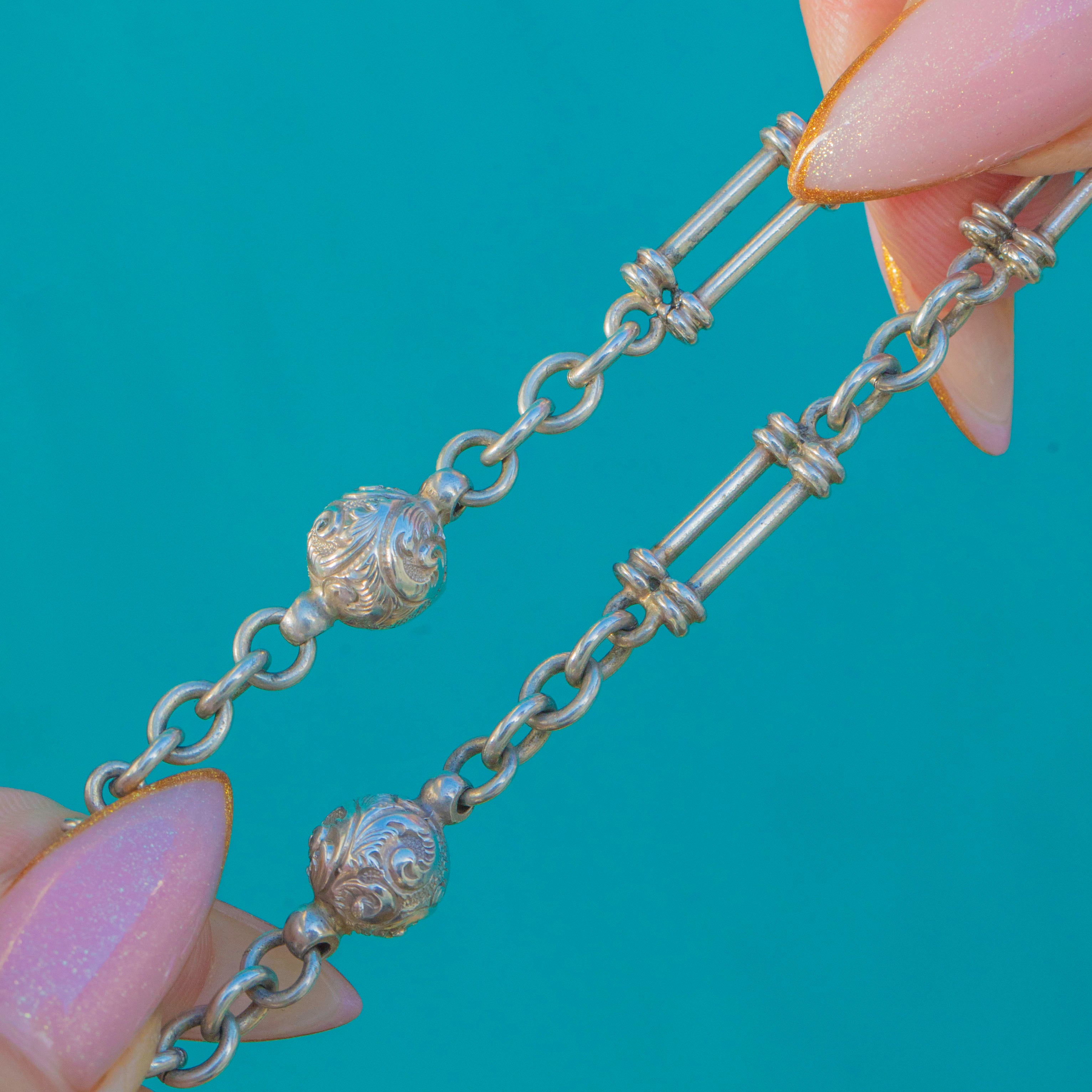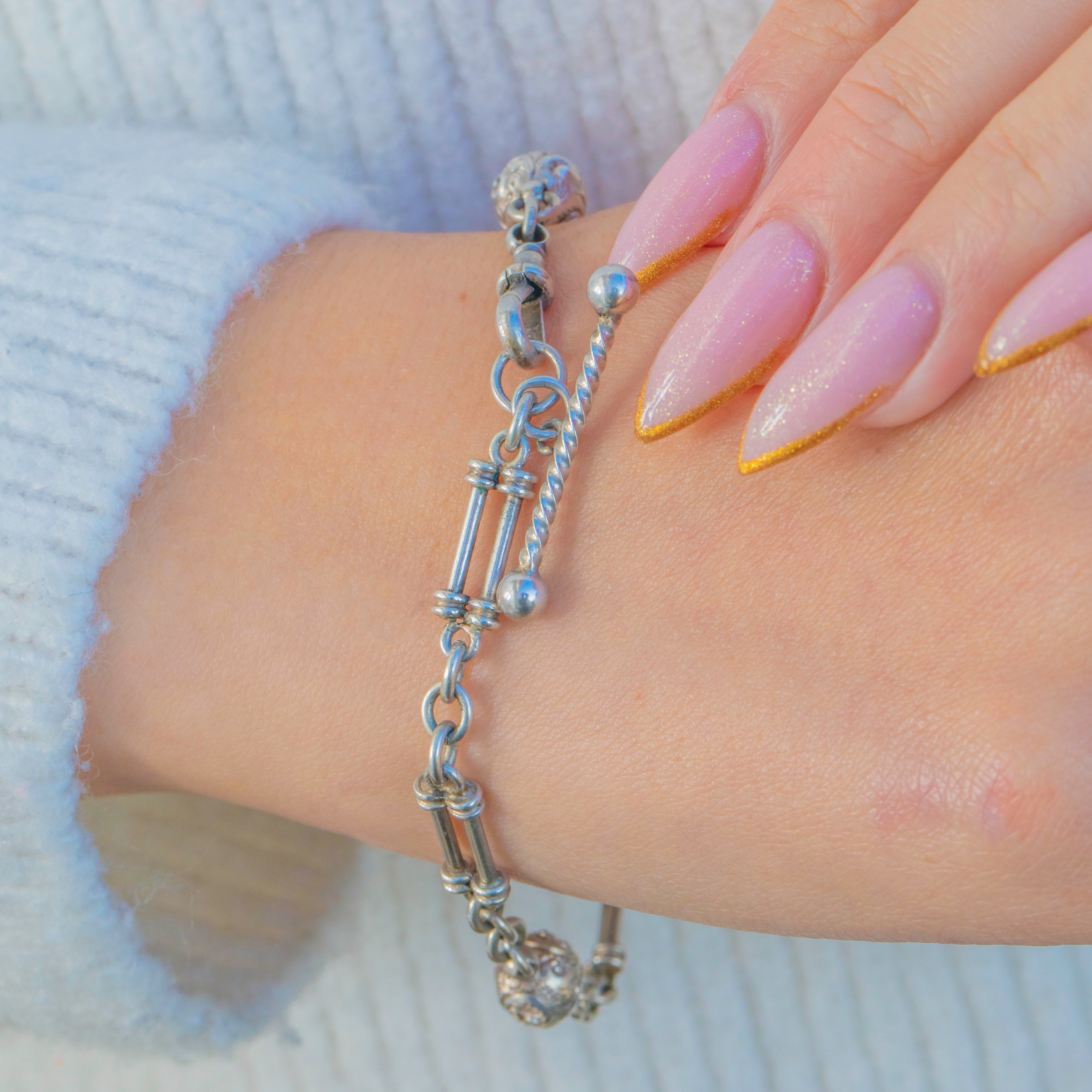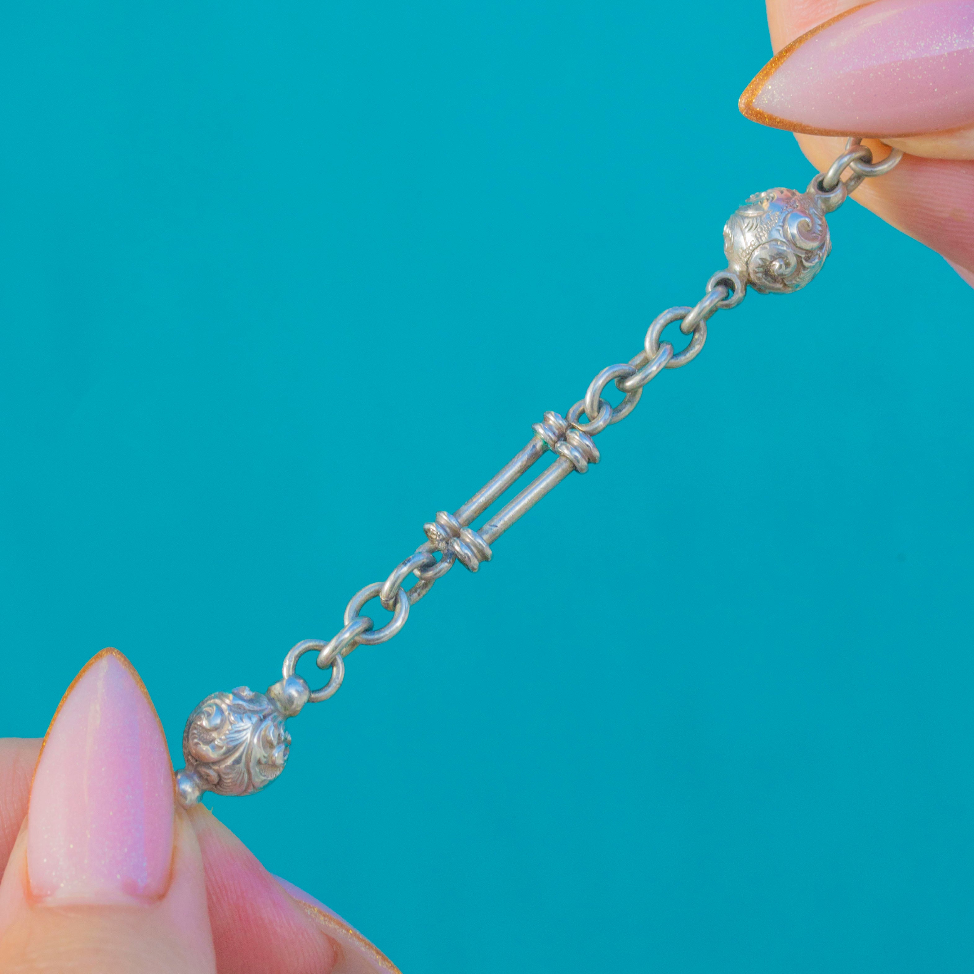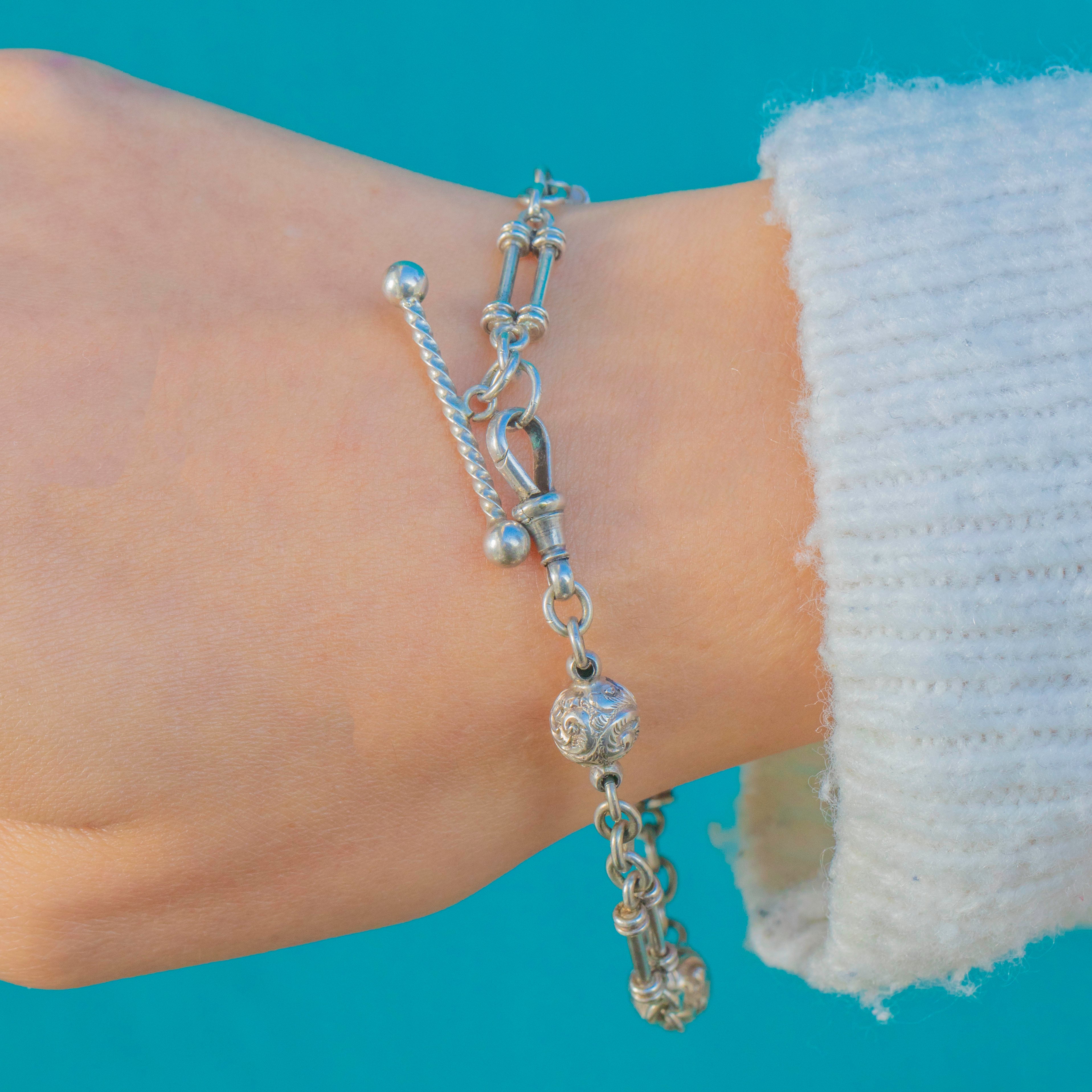 ヴィクトリアン ファンシー ボールとリンクのシルバー アルベルティーナ チェーン ブレスレット、ドッグクリップとTバー付き