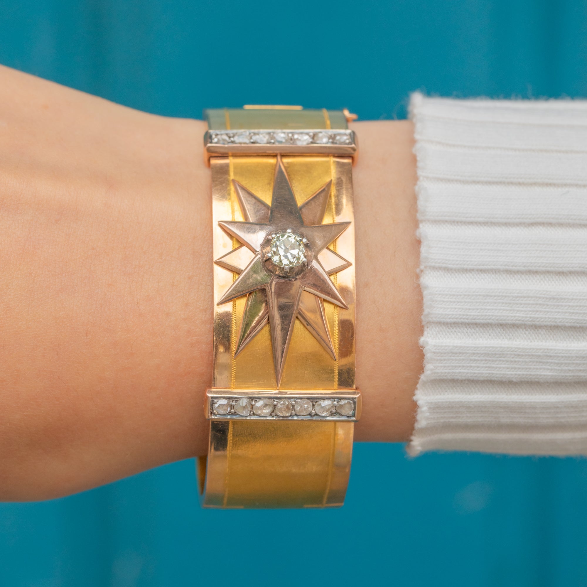 VERY GOOD. An excellent Victorian French 18ct Gold old-cut Diamond star cuff bangle is in excellent condition! The Gold has a rich saturation throughout and has held its form well, it remains a robust piece that can be worn regularly with confidence. There is some surface wear on the back of the bangle, with some very light imperfections / surface scratches to note, but this isn't immediately noticeable and does not distract from the overall impact of the piece.