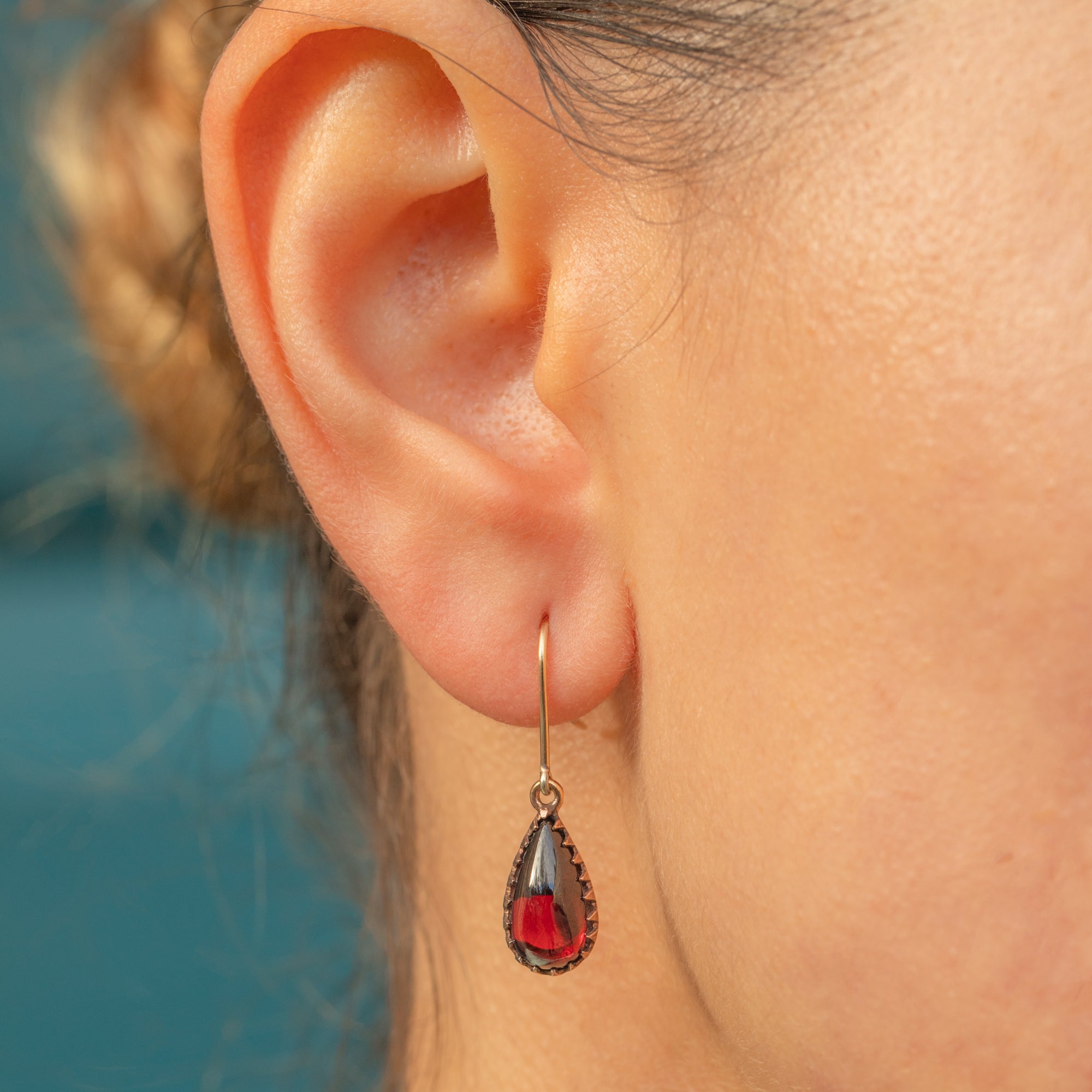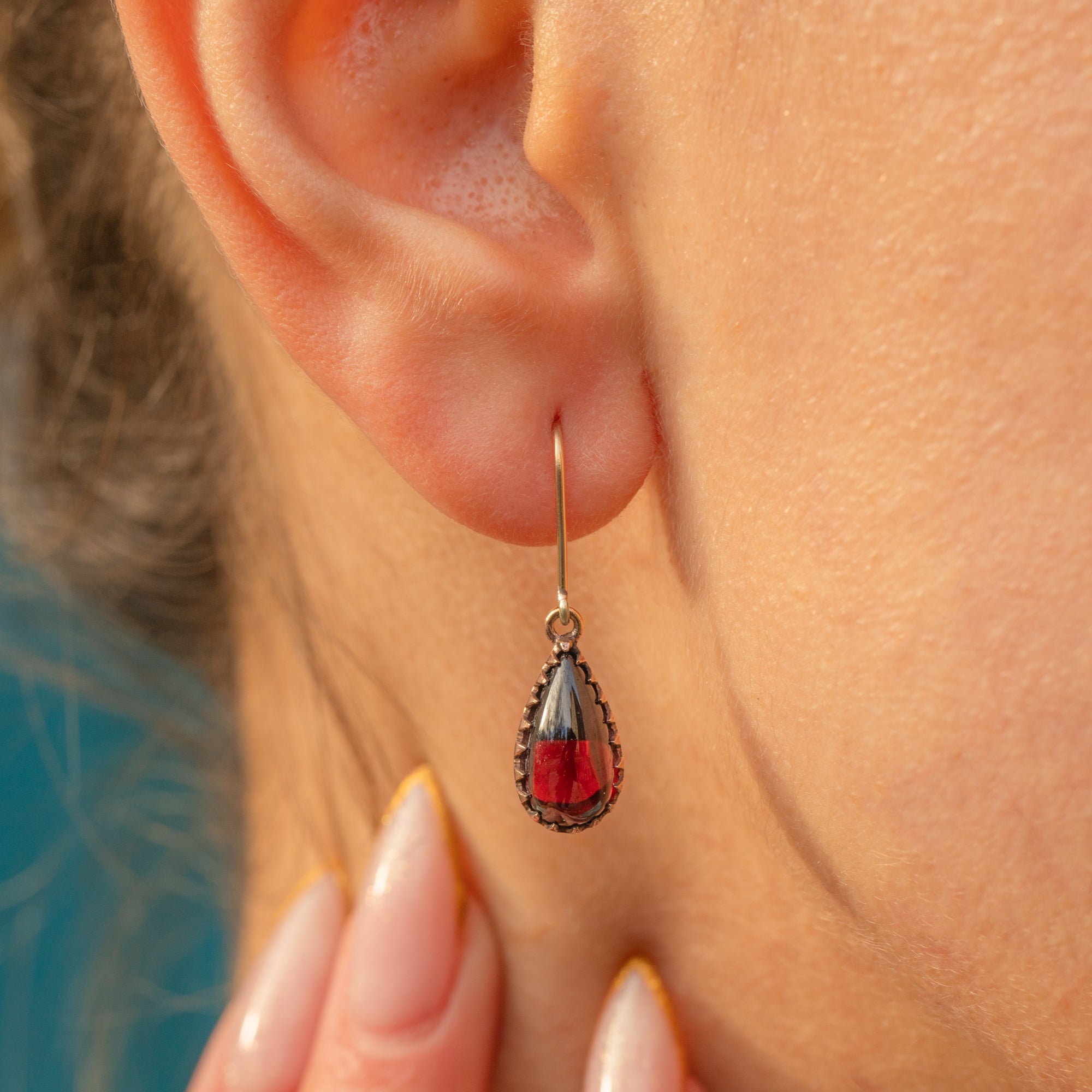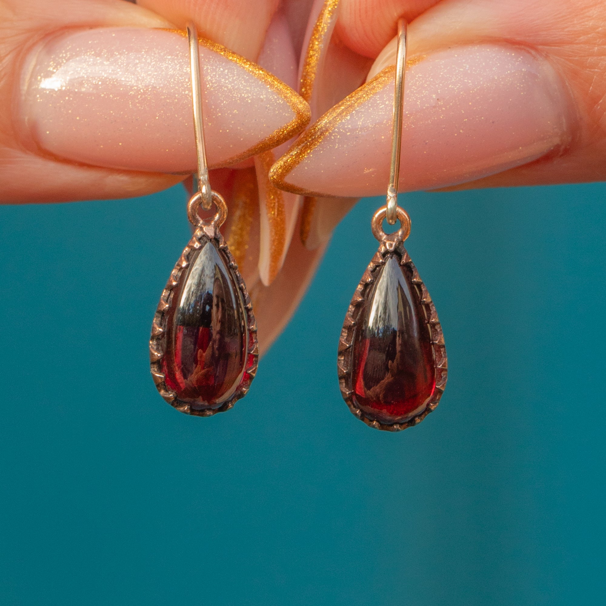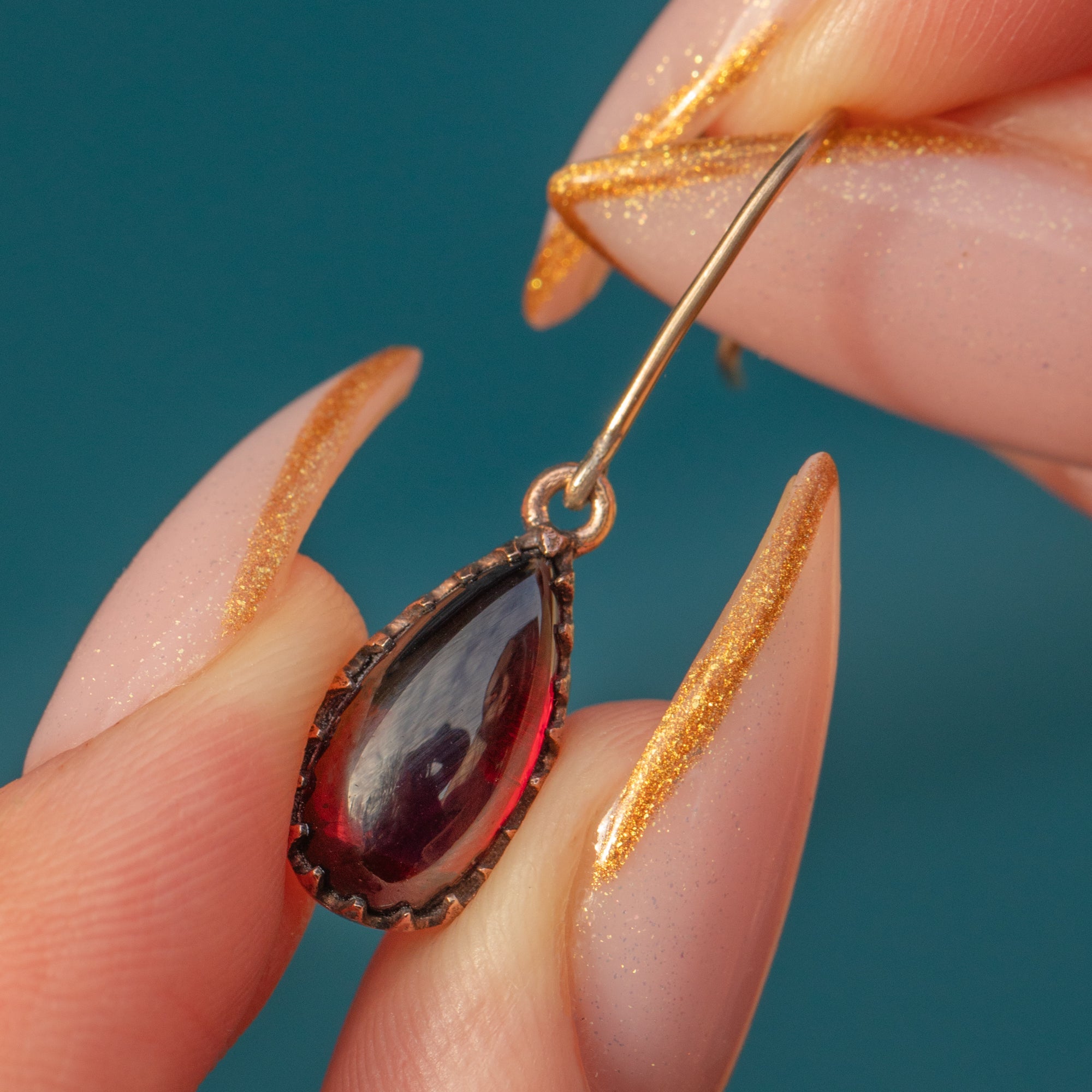 Victorian ガーネット カボション ドロップ ピアス - 9ct ゴールド フック