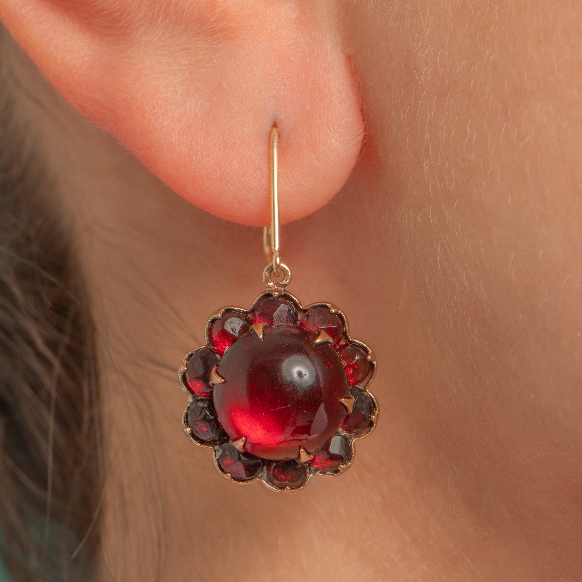 EXCELLENT: The Garnet glass cabochons and surrounding facets are bright with only light, superficial surface wear visible under close inspection. Settings and hooks are secure with a gentle, even patina in keeping with age. No missing stones or evidence of later repair observed.
