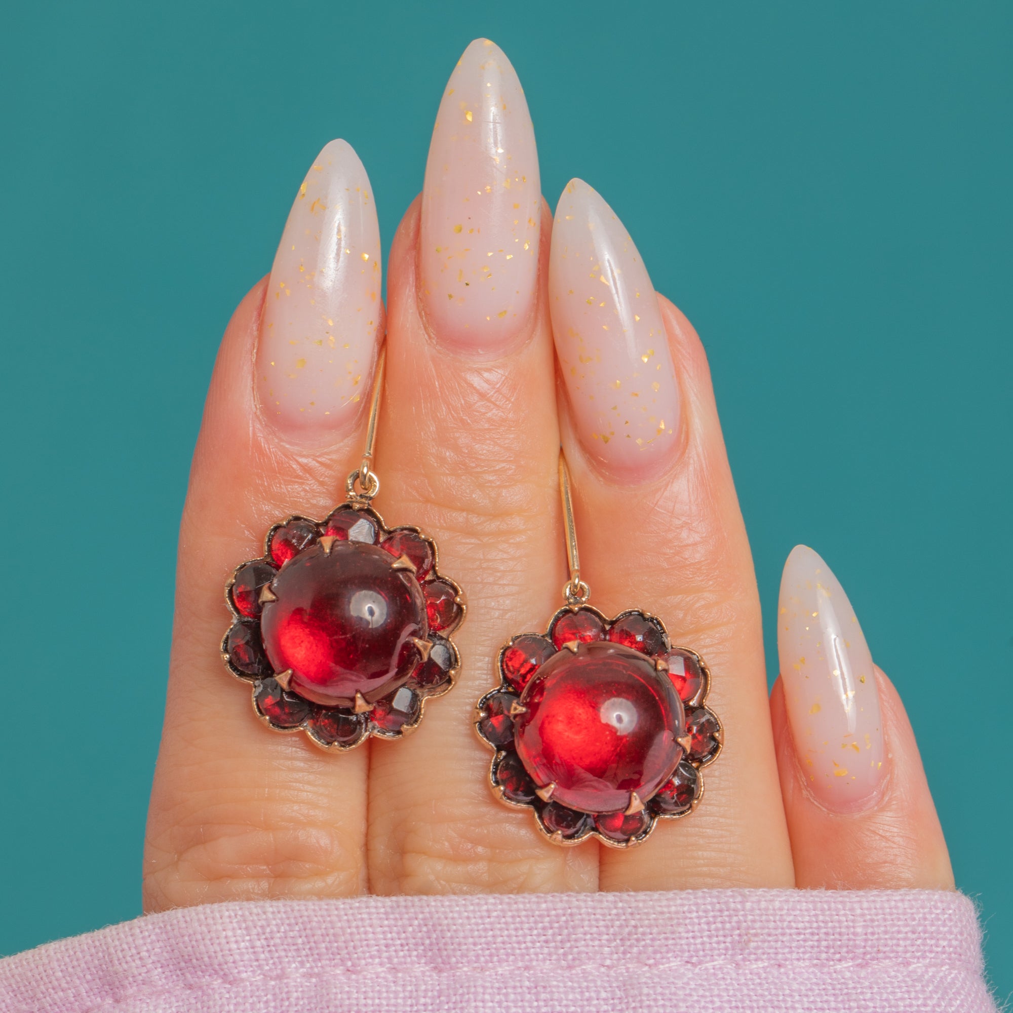Radiant and romantic, these Victorian Garnet glass flower earrings glow with a deep pomegranate hue. Each earring centres a high-domed Garnet glass cabochon, framed by a halo of petite faceted Garnet glass in a scalloped, rosette silhouette. The rich reds are beautifully complemented by warm Gold tone settings, with elegant 9ct Gold shepherd hooks for comfortable, graceful wear.