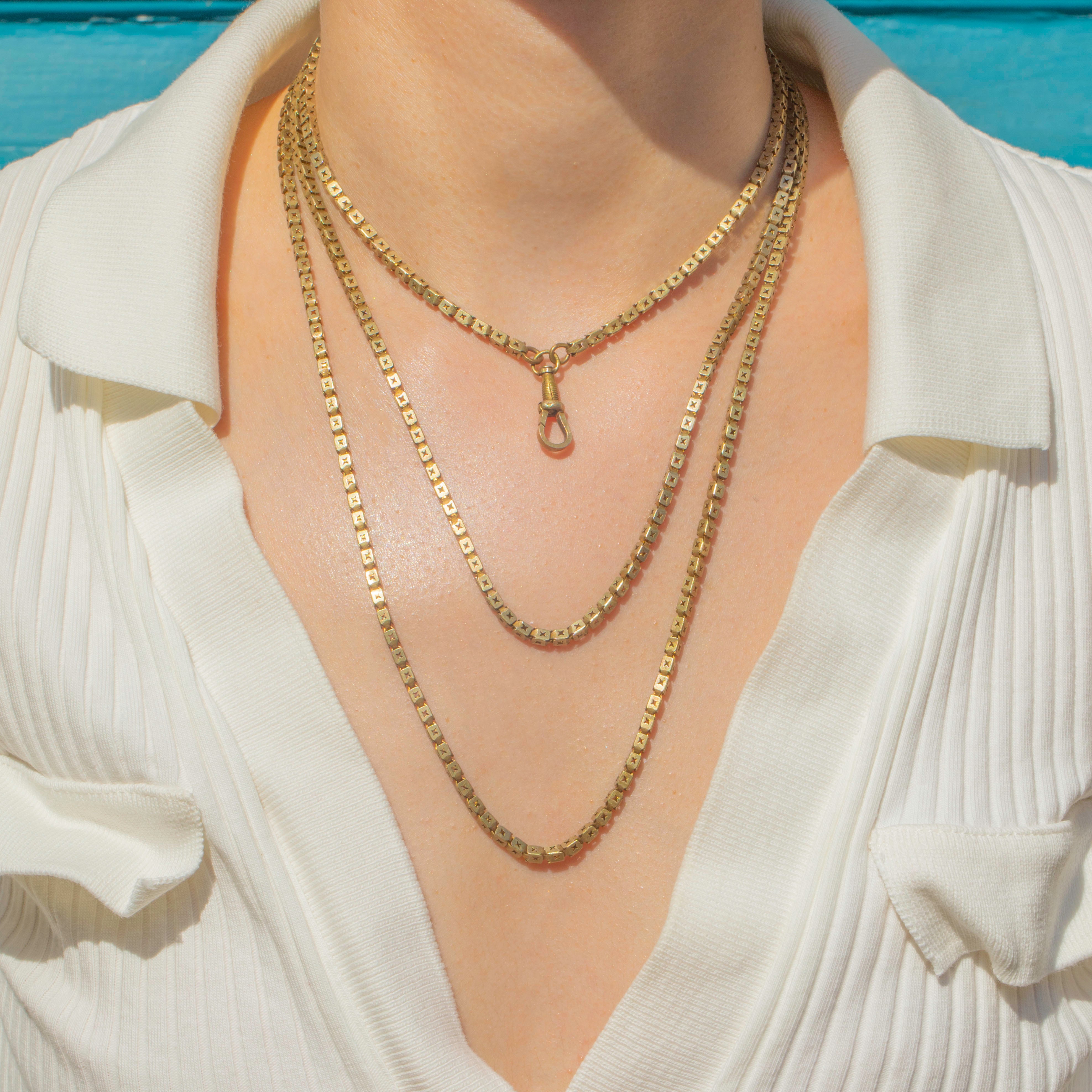 The chain comes complete with a versatile dog-clip, that will allow you to style this Victorian chain in an array of different ways. The generous length will instantly give you a sumptuous layered look, and the dog-clip can easily be used to suspend a charm or pendant!
