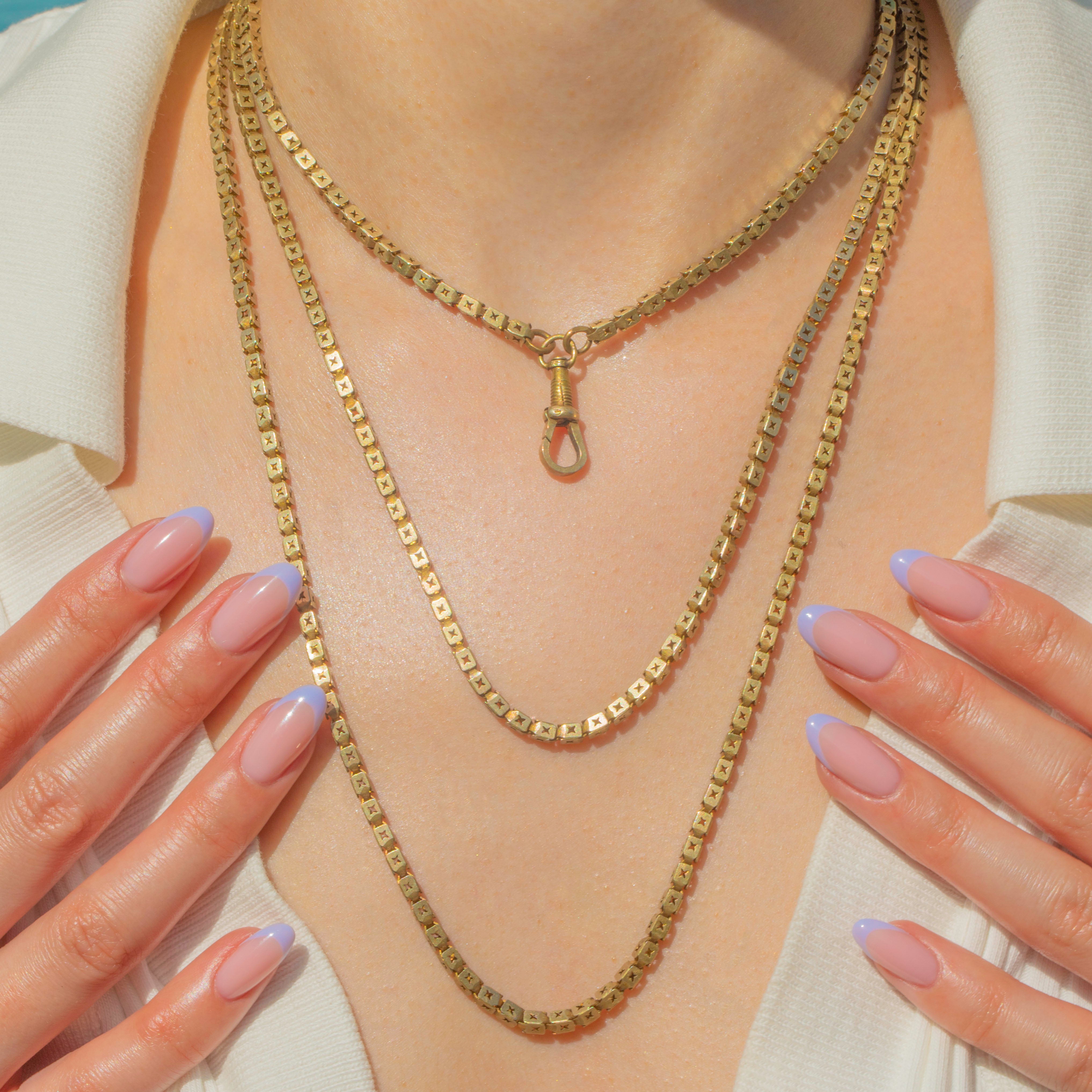 VERY GOOD: This Victorian Gold toned pierced star link chain is in very good condition. The links are all securely connected and have held their form remarkably well over the years. There is some mild discolouration to the Gold-toned metal, most notably on the dog-clip, but this does not distract from the overall impact of the chain. With plenty of styling opportunities, don't hesitate to add this striking antique box chain to your collection!