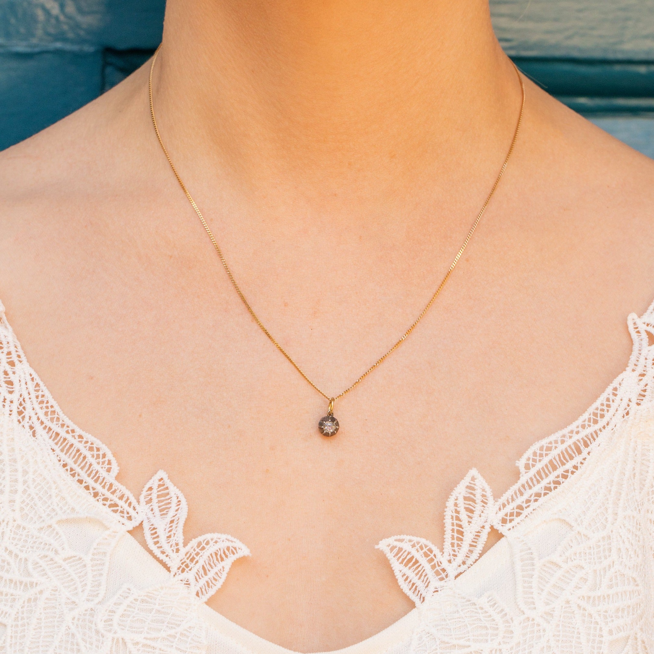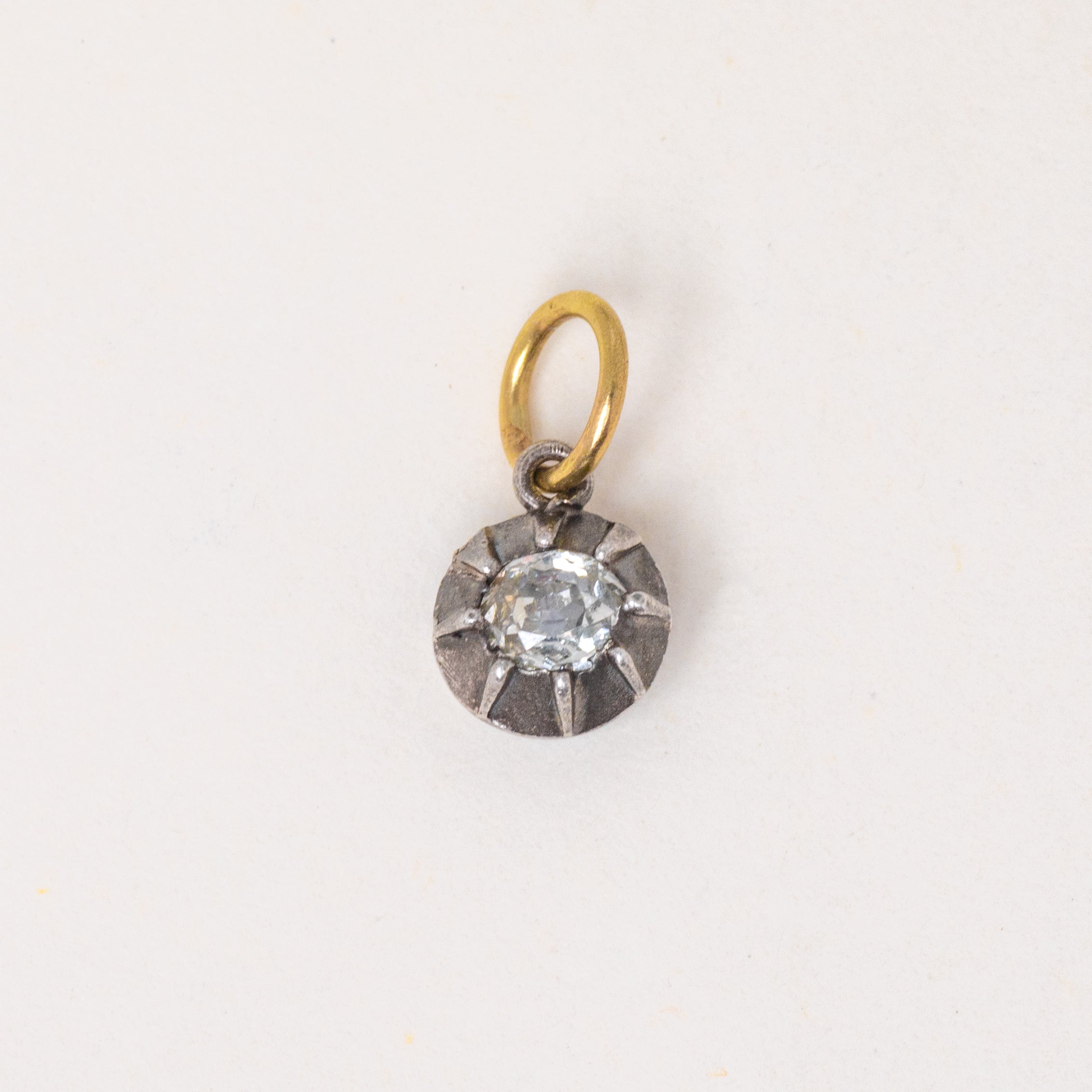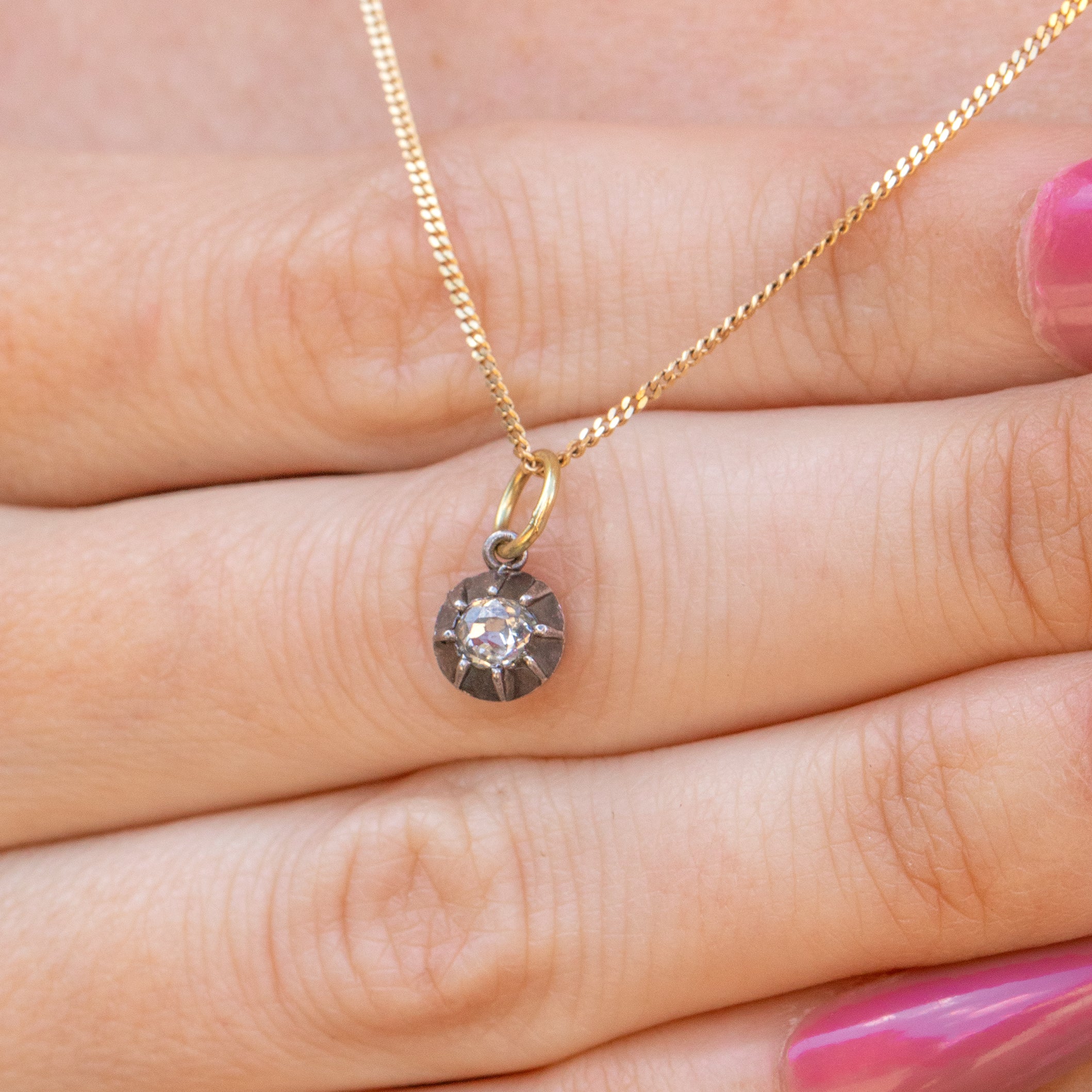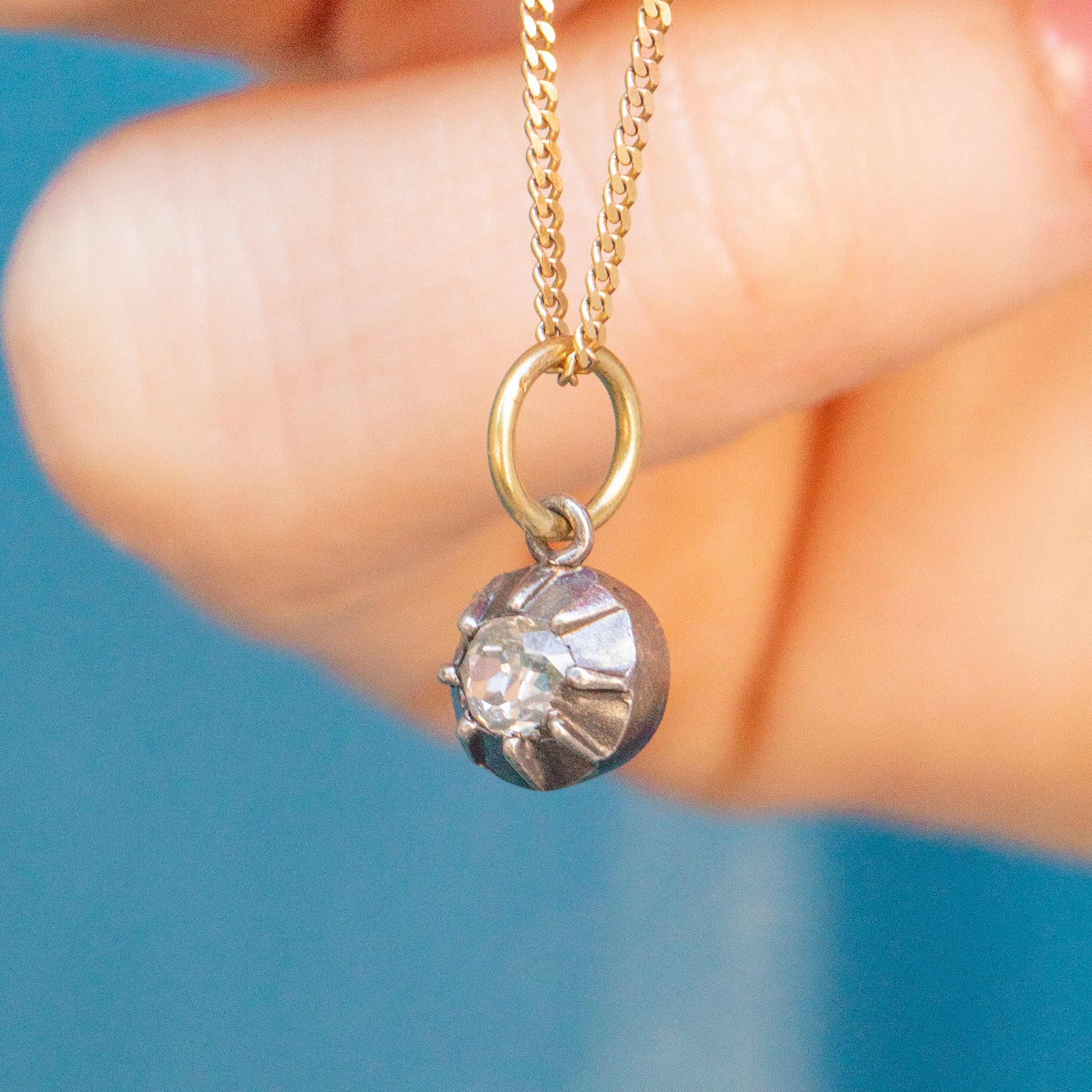 Bring a splash of 19th-century glam into your repertoire with this Victorian old-mine-cut Diamond charm! Nestled within a Sterling Silver pie crust setting sits a scintillating 0.22ct Diamond, effortlessly glinting beneath the light.