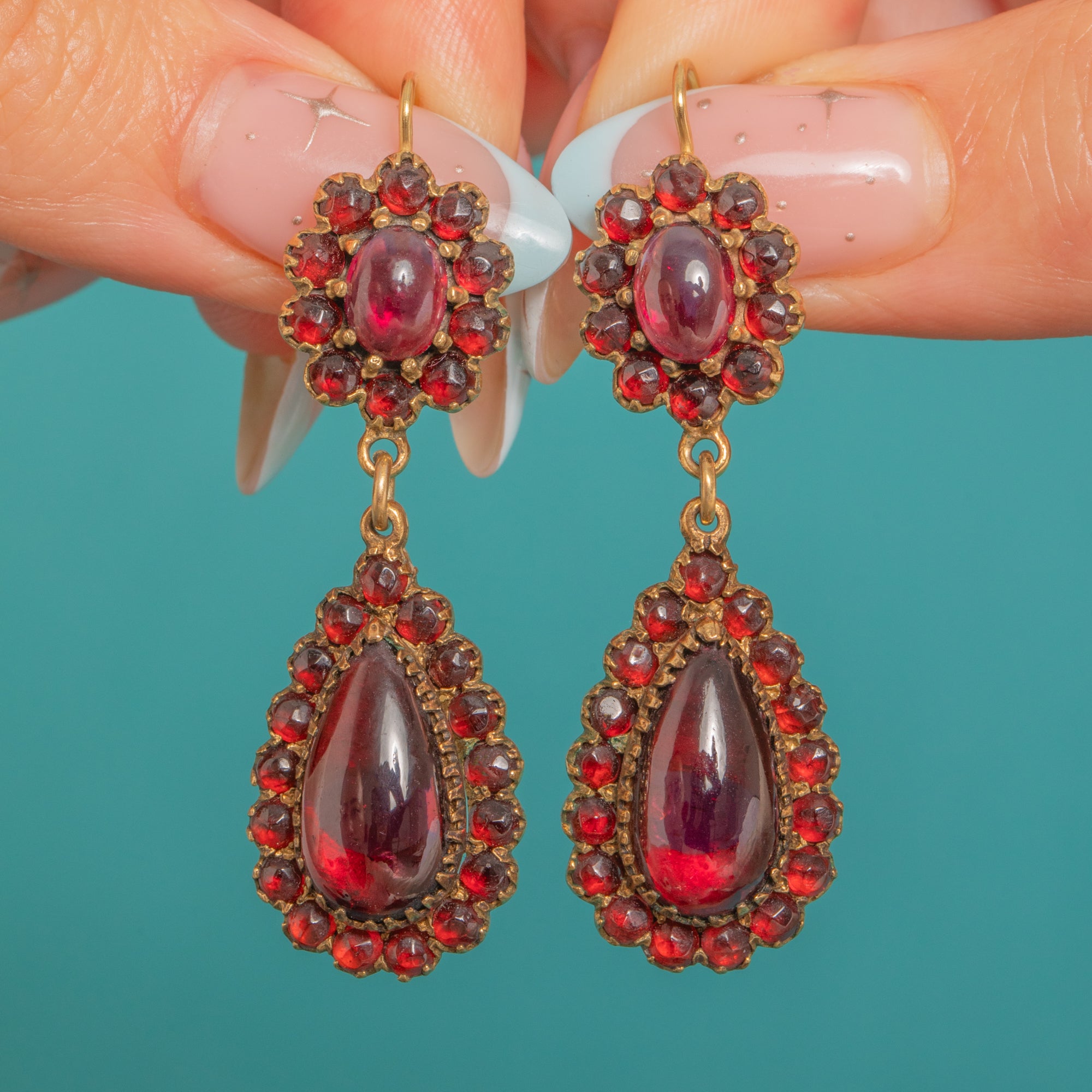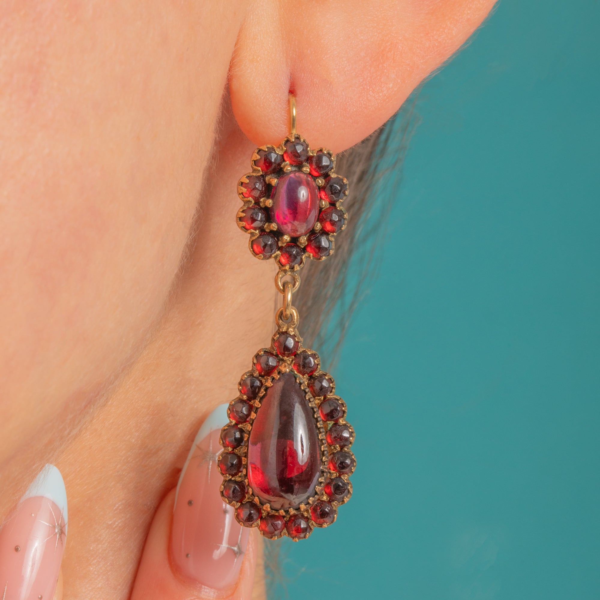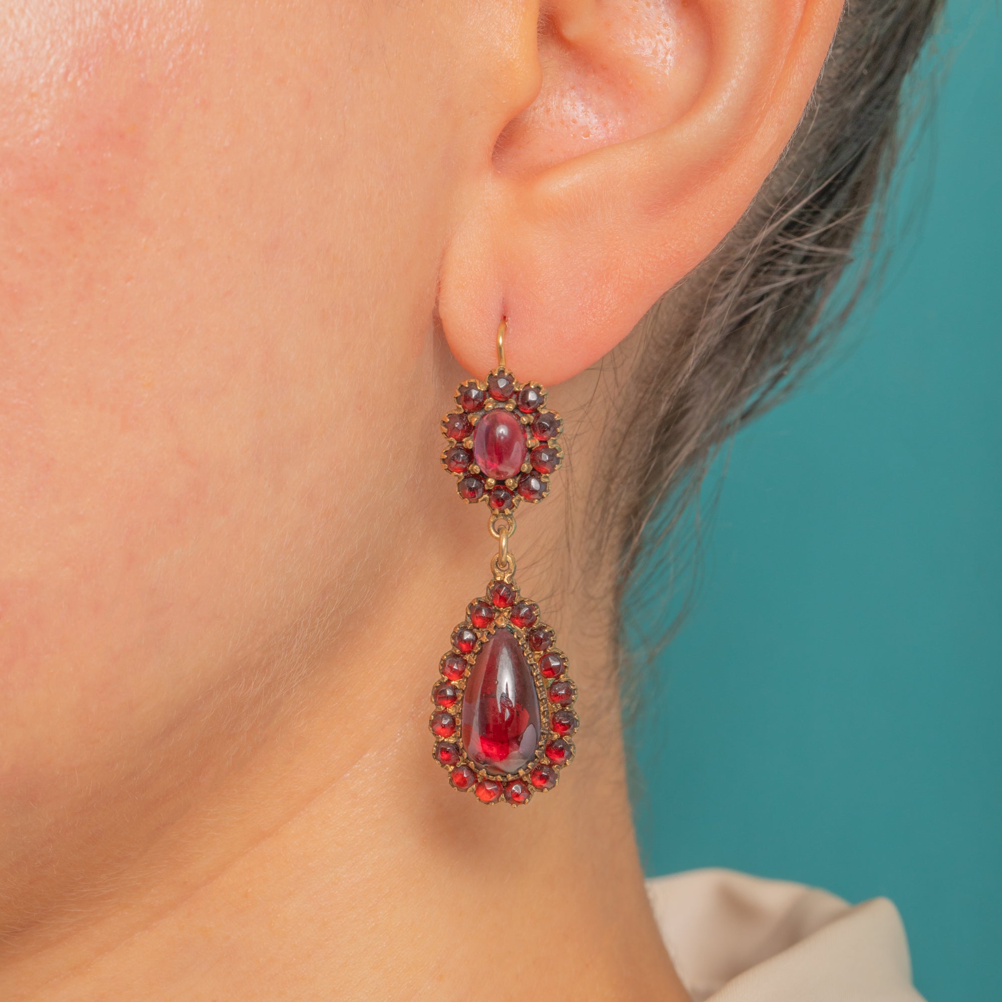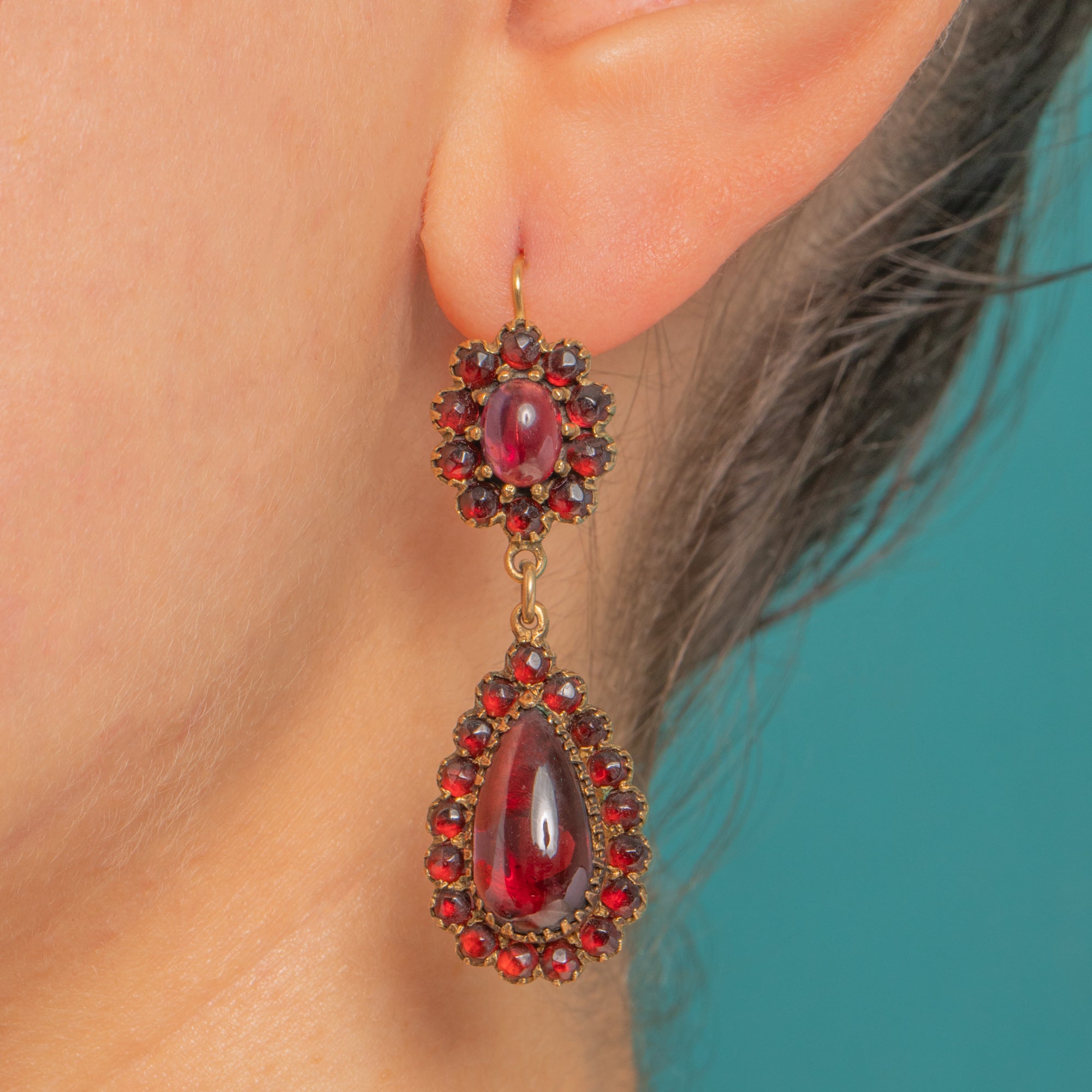 Sumptuous Victorian Garnet drops with all the romance of the era. Each earring marries a rosette at the lobe with a larger pear-shaped drop below, the domed Garnet cabochons framed by tightly packed halos of glowing rose-cut Garnets. The scalloped, pie-crust collet settings add beautiful texture, while the articulated construction brings graceful movement with every turn.