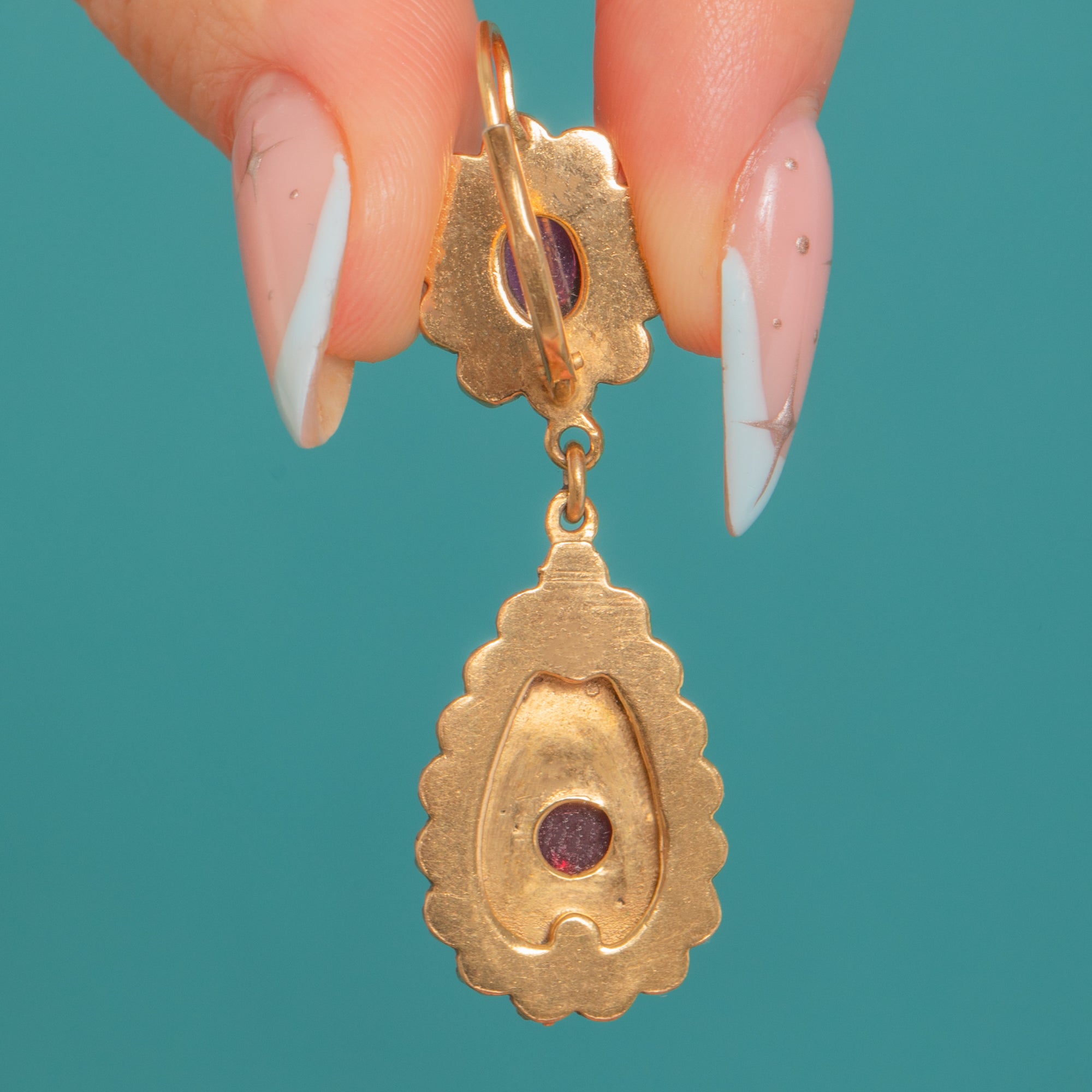 Crafted with shepherd-hook fittings that test as 9ct Gold and settings that test as Garnet Gold, these earrings deliver that coveted antique warmth and depth of colour. Rich wine-red cabochons and lively rose-cuts create a refined, dressy silhouette perfect for evening elegance or a decadent daytime flourish.
