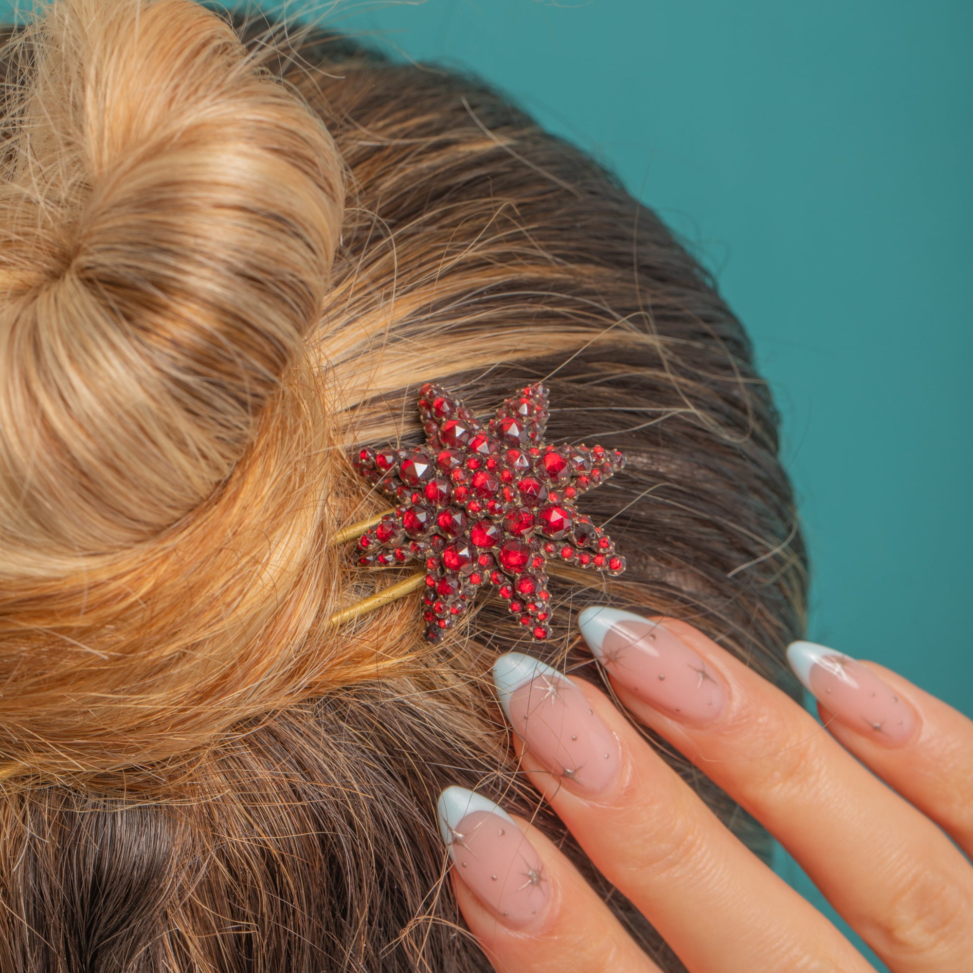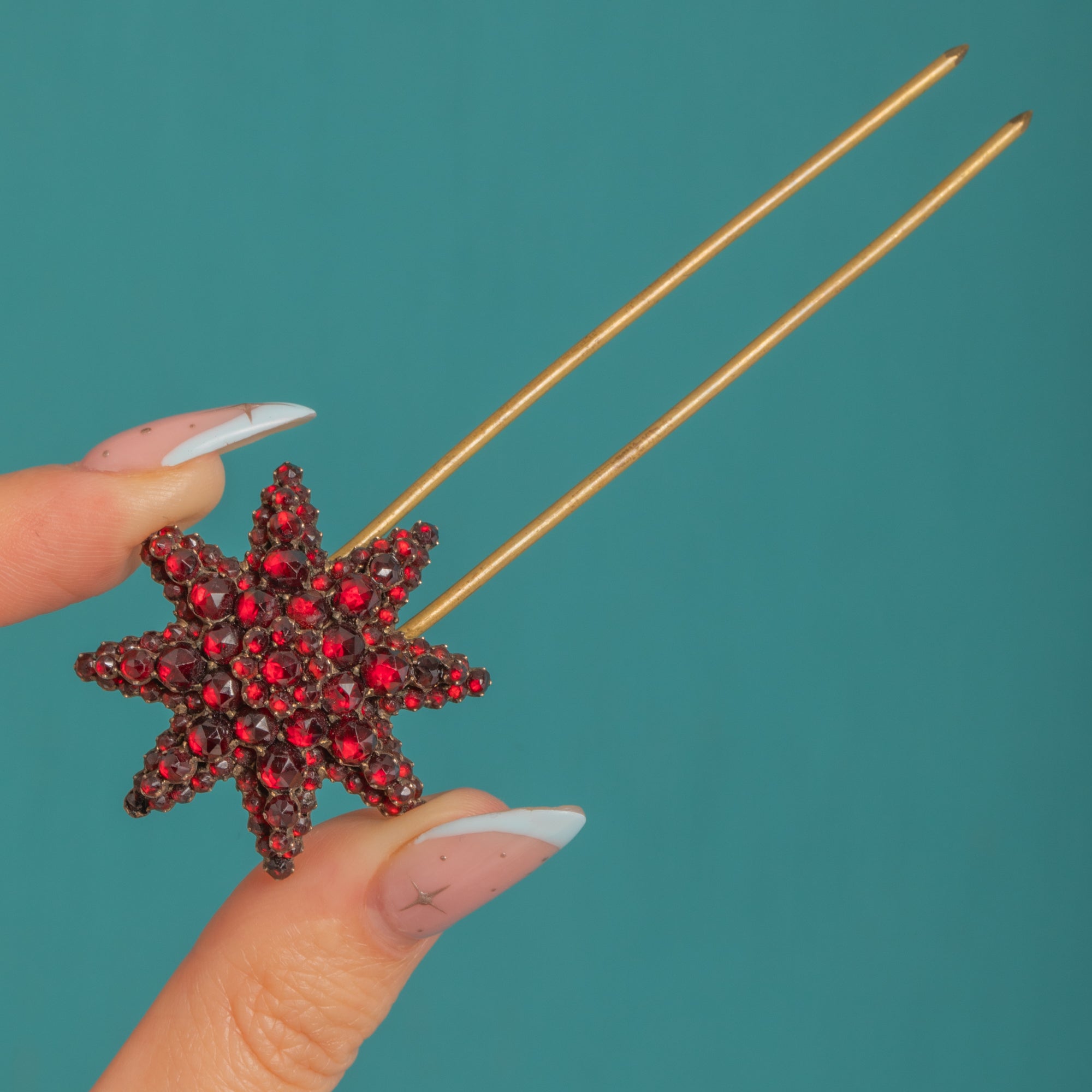 A heavenly Victorian treasure, this two‑prong hairpin crowns the coiffure with a radiant starburst of rose‑cut Garnets. The rich, deep‑red stones are tightly pavé‑set and graduate beautifully to a larger central gem, creating a bold celestial bloom that shimmers with every turn.