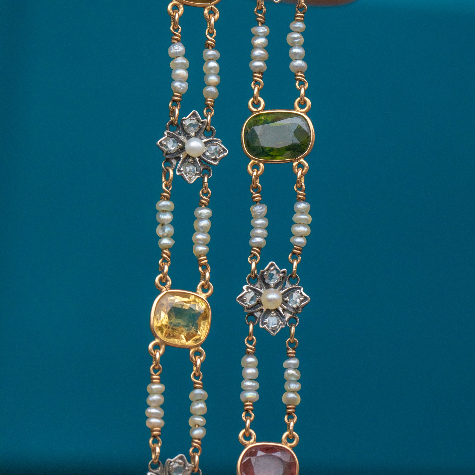 This antique Victorian Seed Pearl Harlequin multi-gemstone necklace features a cacophony of gems...from Tourmalines, Golden Topaz, multi-coloured natural Garnets and a perfect peach-coloured Imperial Topaz.