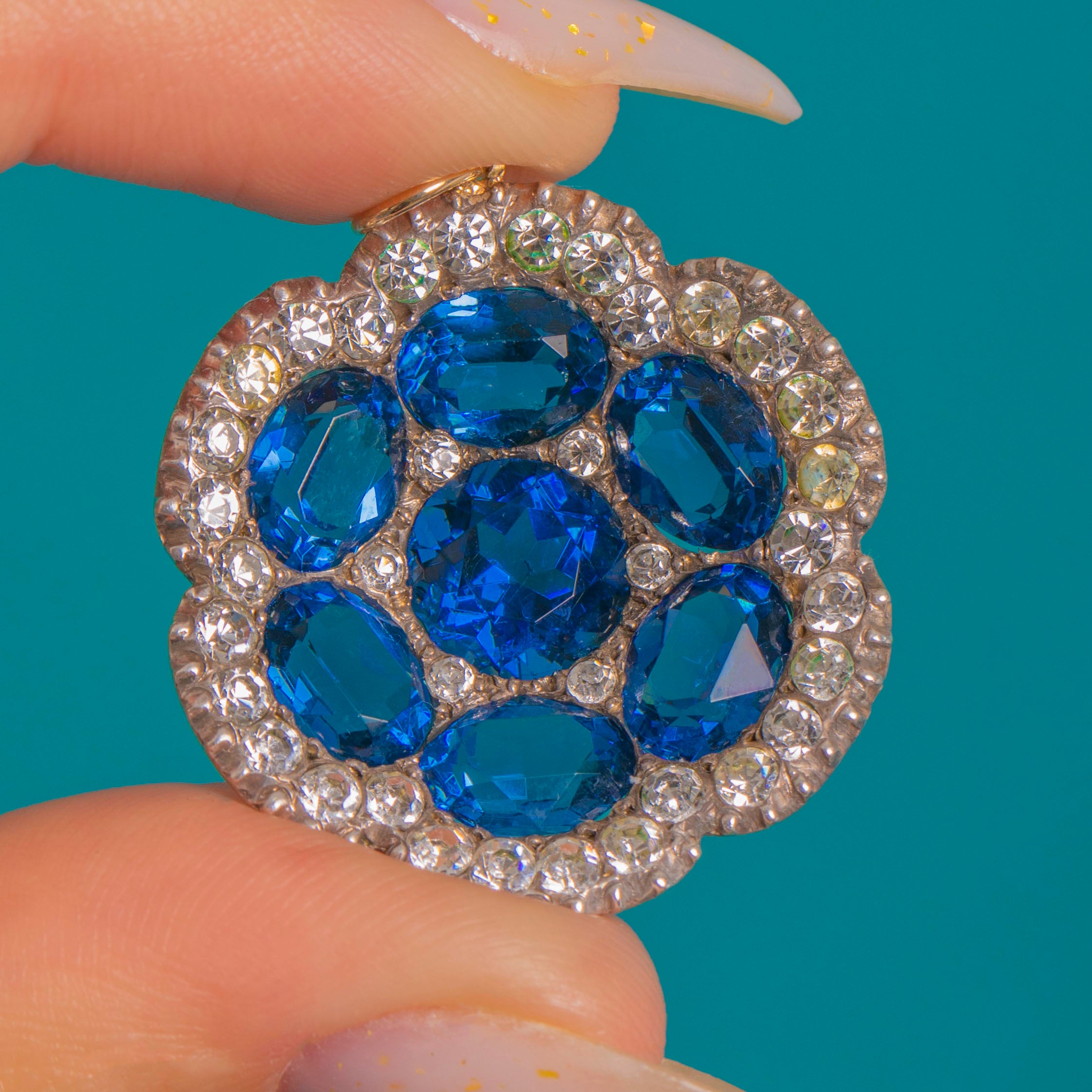 EXCELLENT: Paste stones are bright and lively with only light facet wear; a few of the small White Paste display slight tint variation/cloudiness on close inspection. The Silver setting shows gentle surface wear and a soft patina commensurate with age, and the 9ct Gold jump ring is secure. No missing stones and no visible repairs.