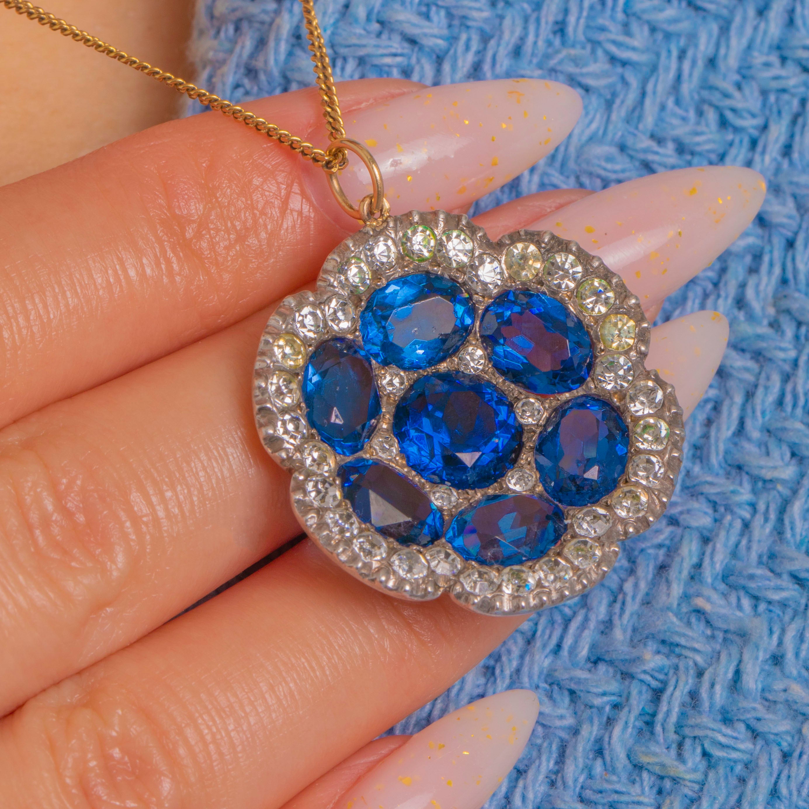 Alive with antique sparkle, this Victorian Silver flowerhead pendant blooms with seven deep royal‑blue Paste stones framed by a scalloped halo of bright White Paste. The saturated blue stones are beautifully contrasted by the crisp, halo for that classic rosette silhouette, framed by a pie crust border for a classic Victorian finishing touch.