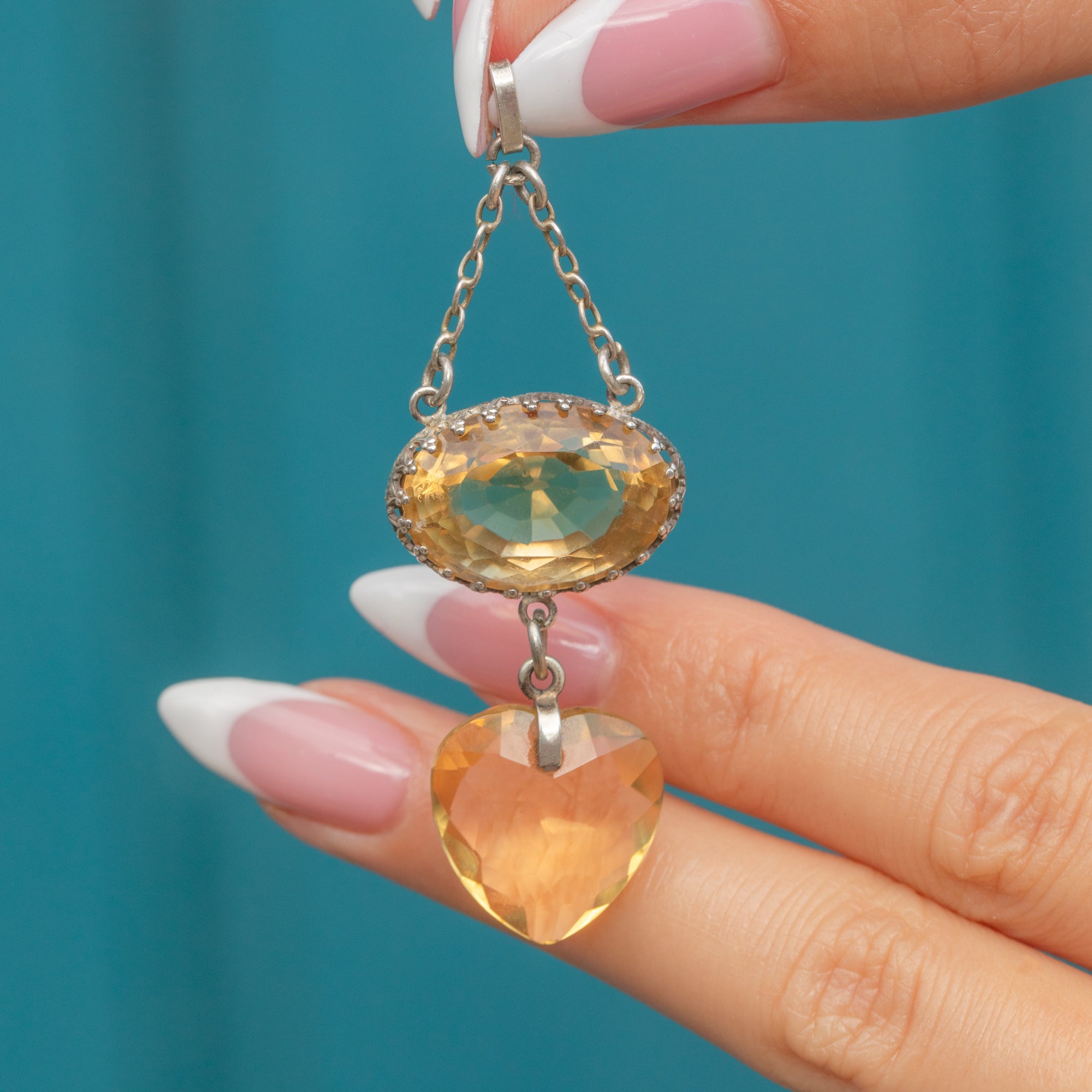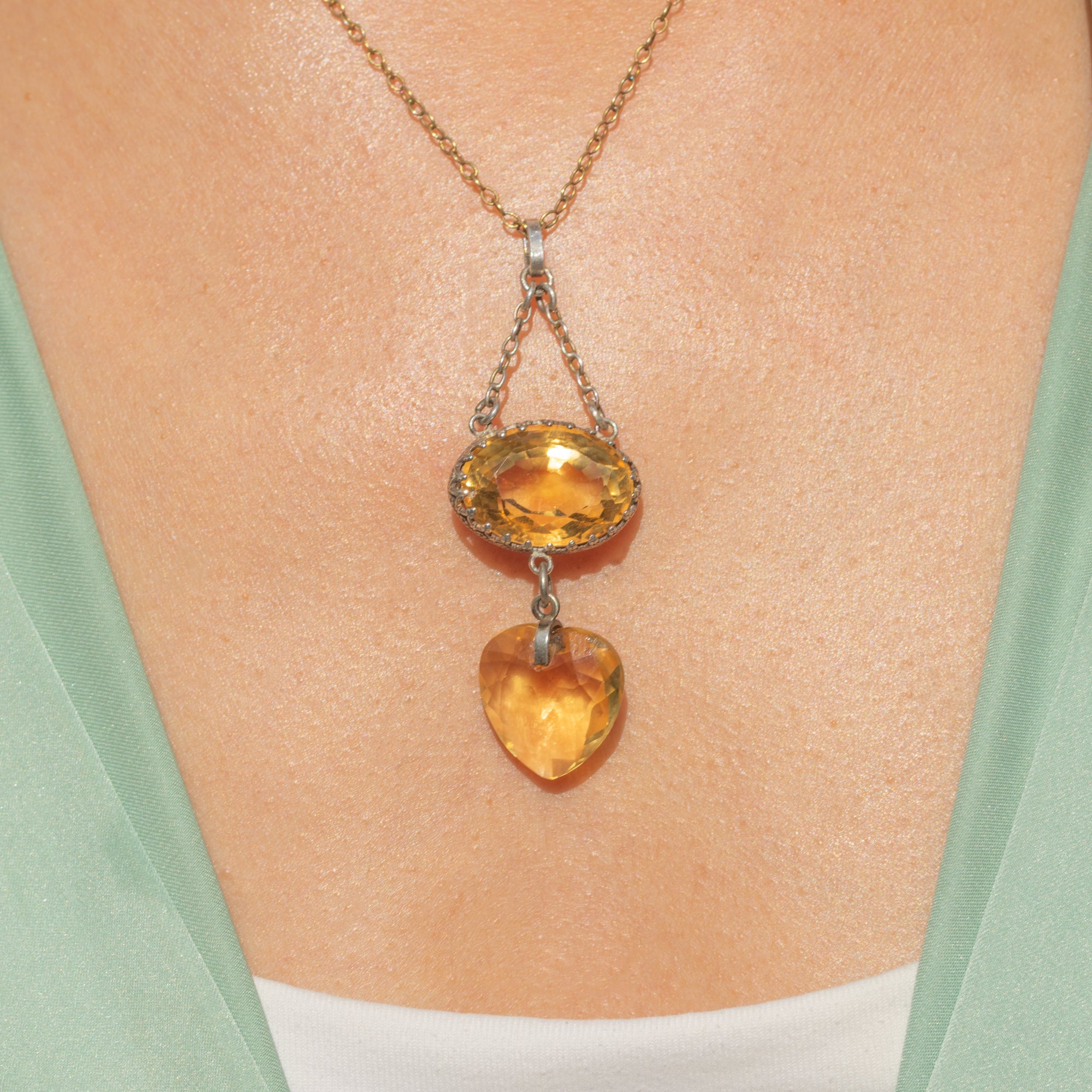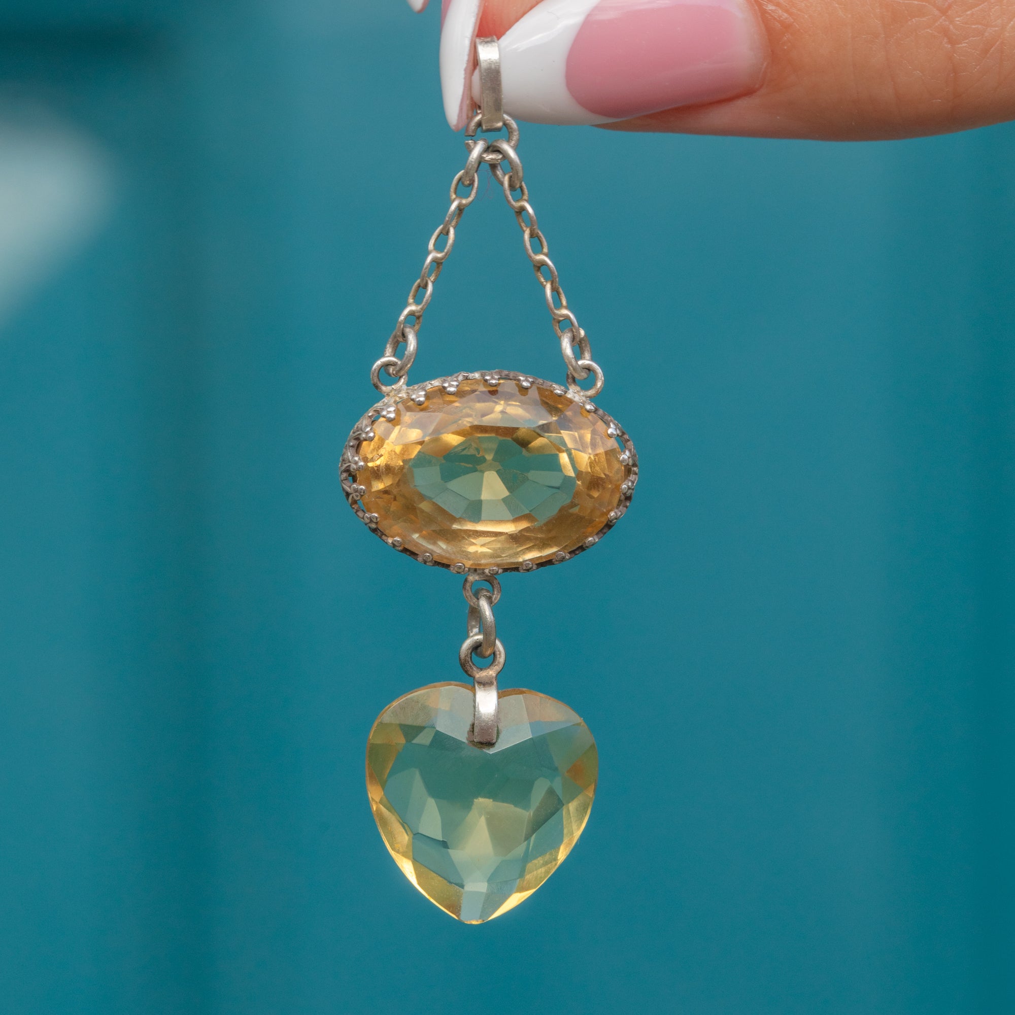 Both gemstones, an elegant oval and adorable heart shape, are faceted beautifully and shimmer with golden honey hues as they catch the light. The Citrines are set in ornate Silver settings with heart details and, providing exceptional coverage across your décolletage, this large drop pendant radiates Victorian charm!