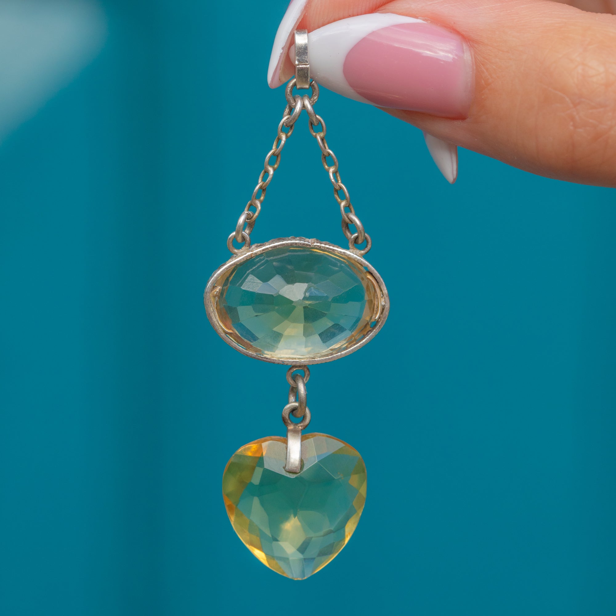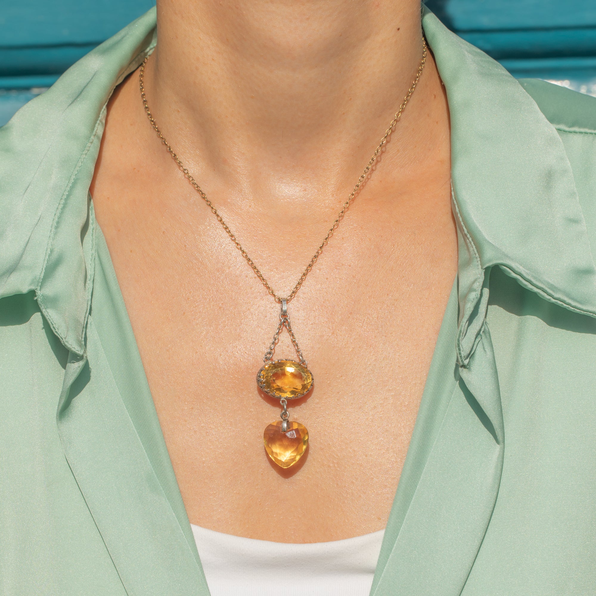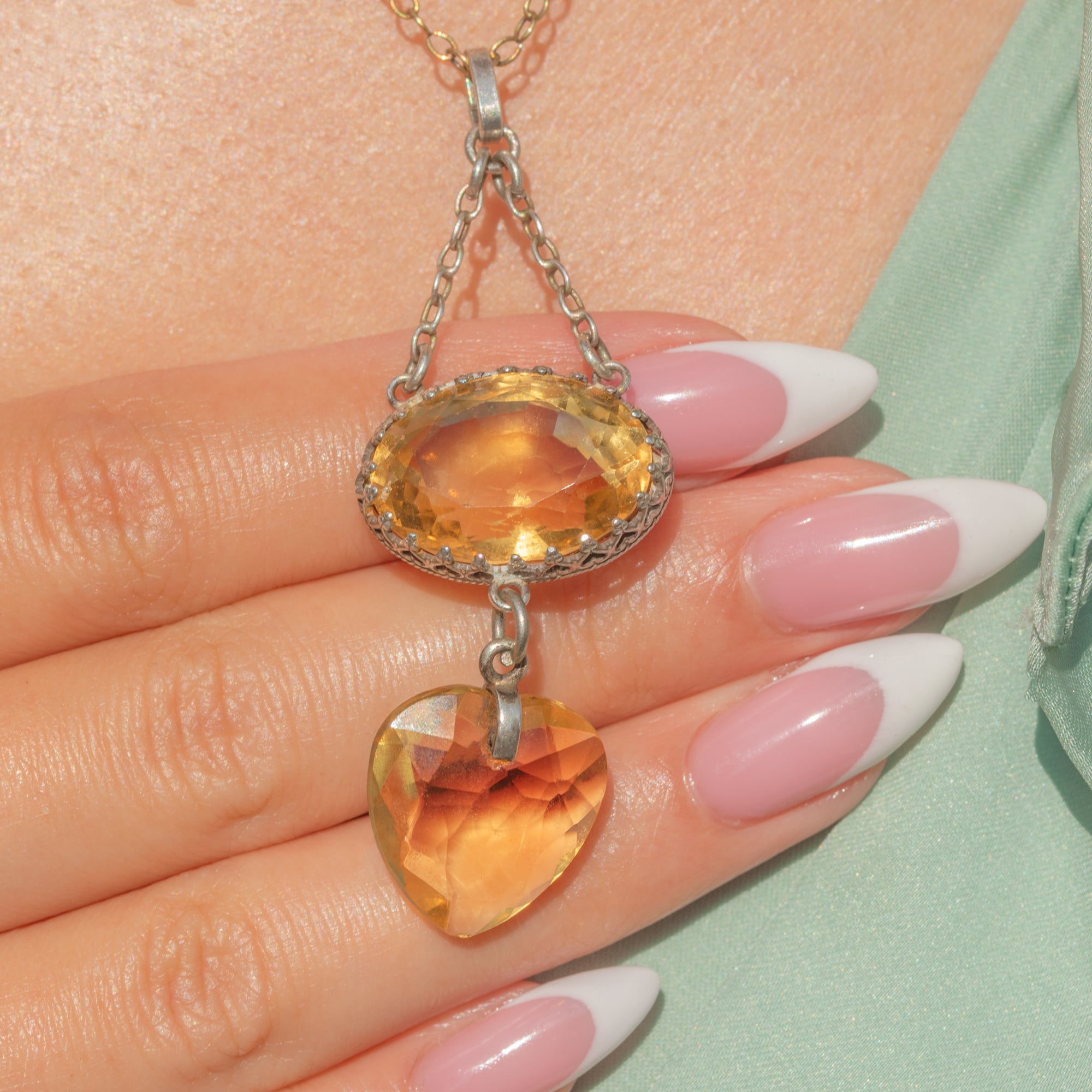 Both gemstones, an elegant oval and adorable heart shape, are faceted beautifully and shimmer with golden honey hues as they catch the light. The Citrines are set in ornate Silver settings with heart details and, providing exceptional coverage across your décolletage, this large drop pendant radiates Victorian charm!