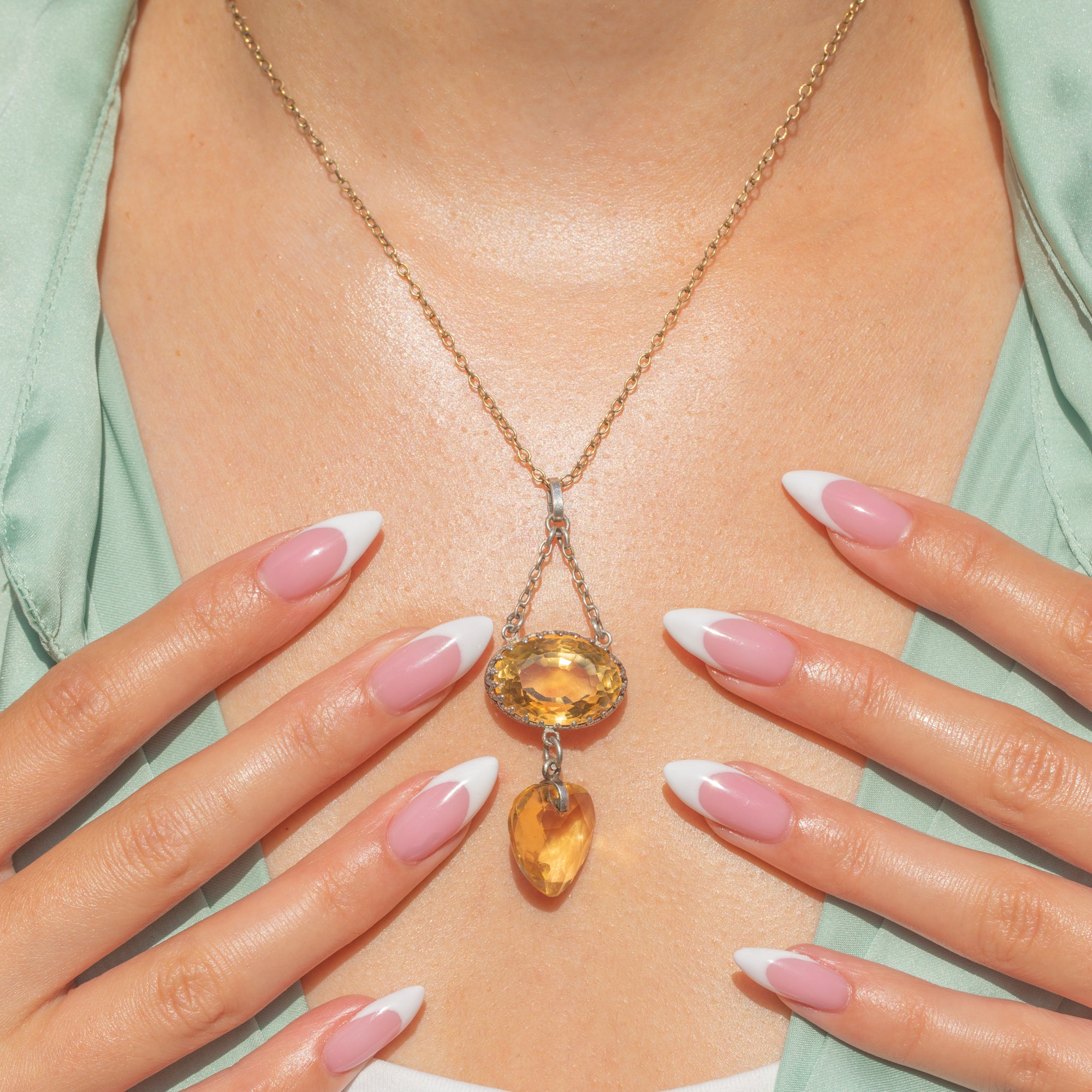 Crafted from glossy Sterling Silver, this Victorian drop pendant suspends two plump Citrine stones boasting a generous 17.90ct combined.