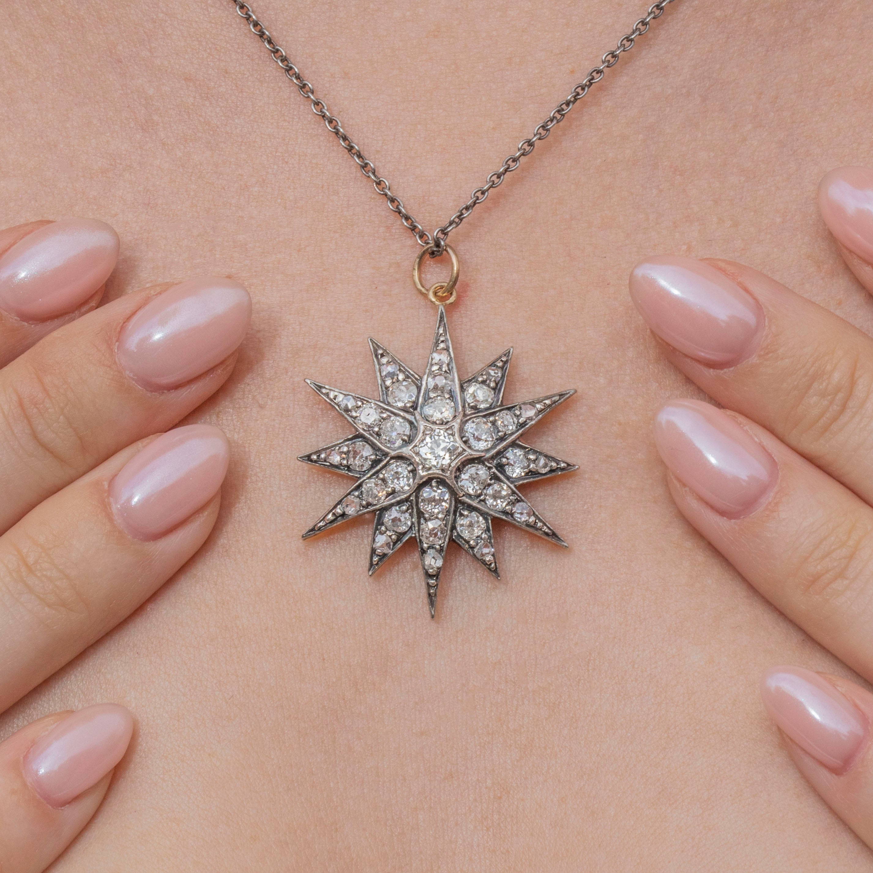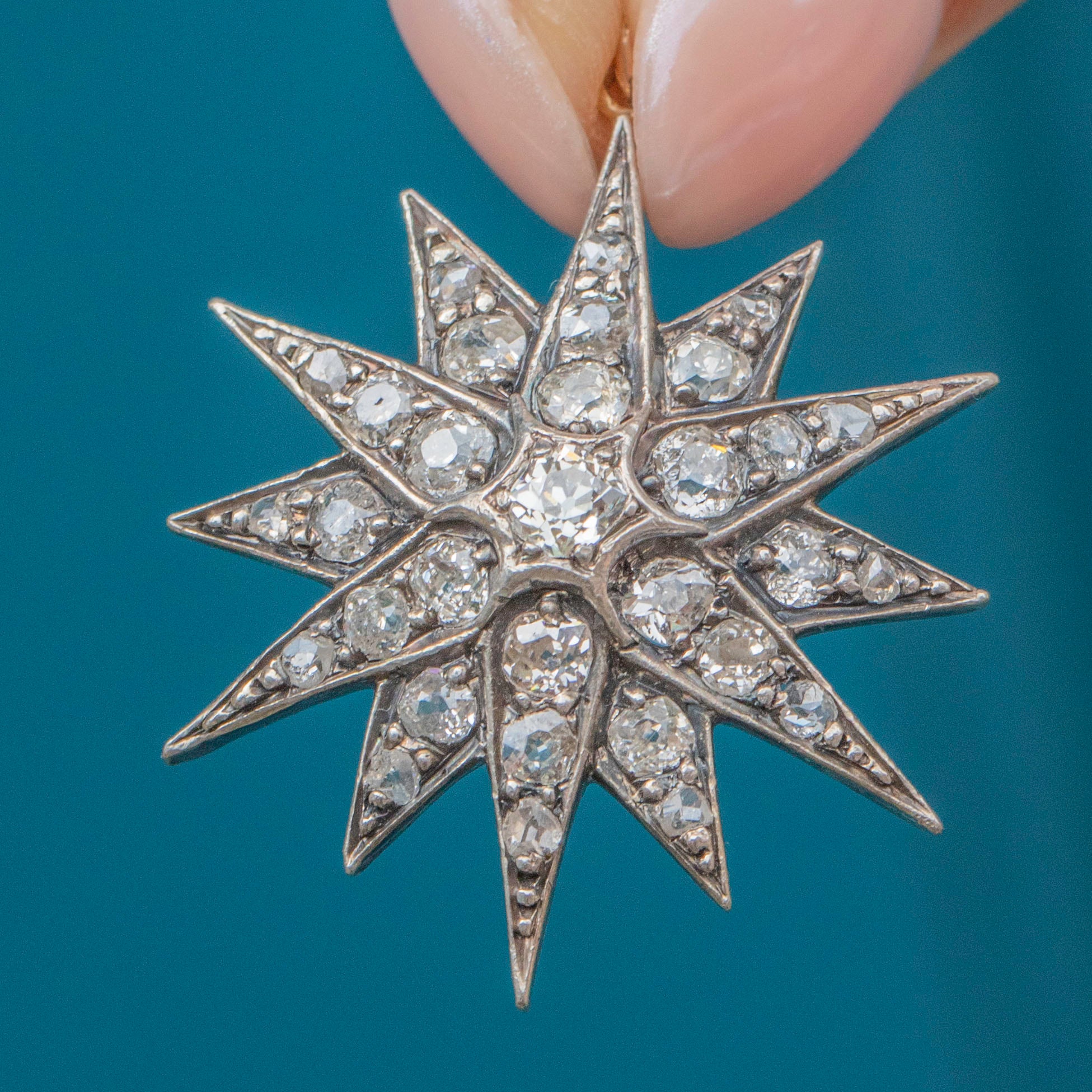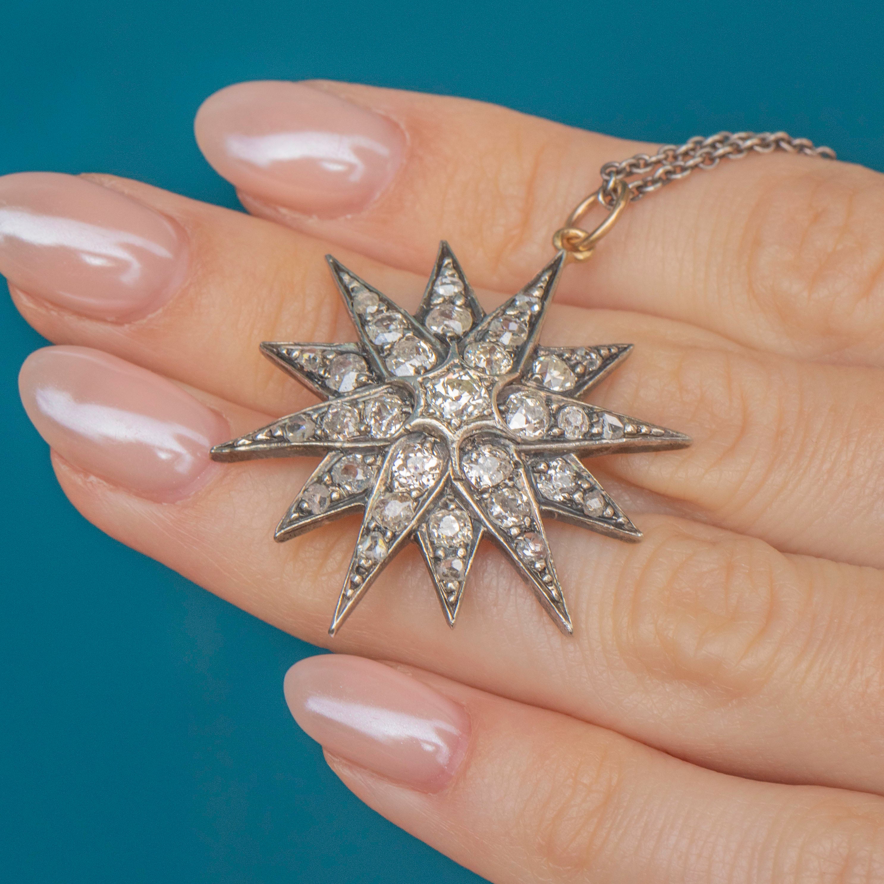 This phenomenal Victorian Silver Diamond starburst pendant is a dreamy treasure from the Victorian era, full of charm and elegance. The bold star design is crafted from Sterling Silver and backed with 9ct Gold, encrusted with scintiallting Diamonds with a combined weight of 1.82ct that catch the light magnificently - the central Diamond alone is 0.14ct!
