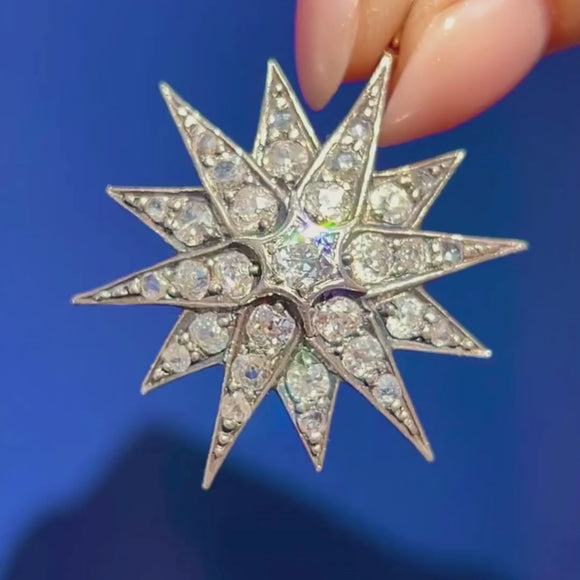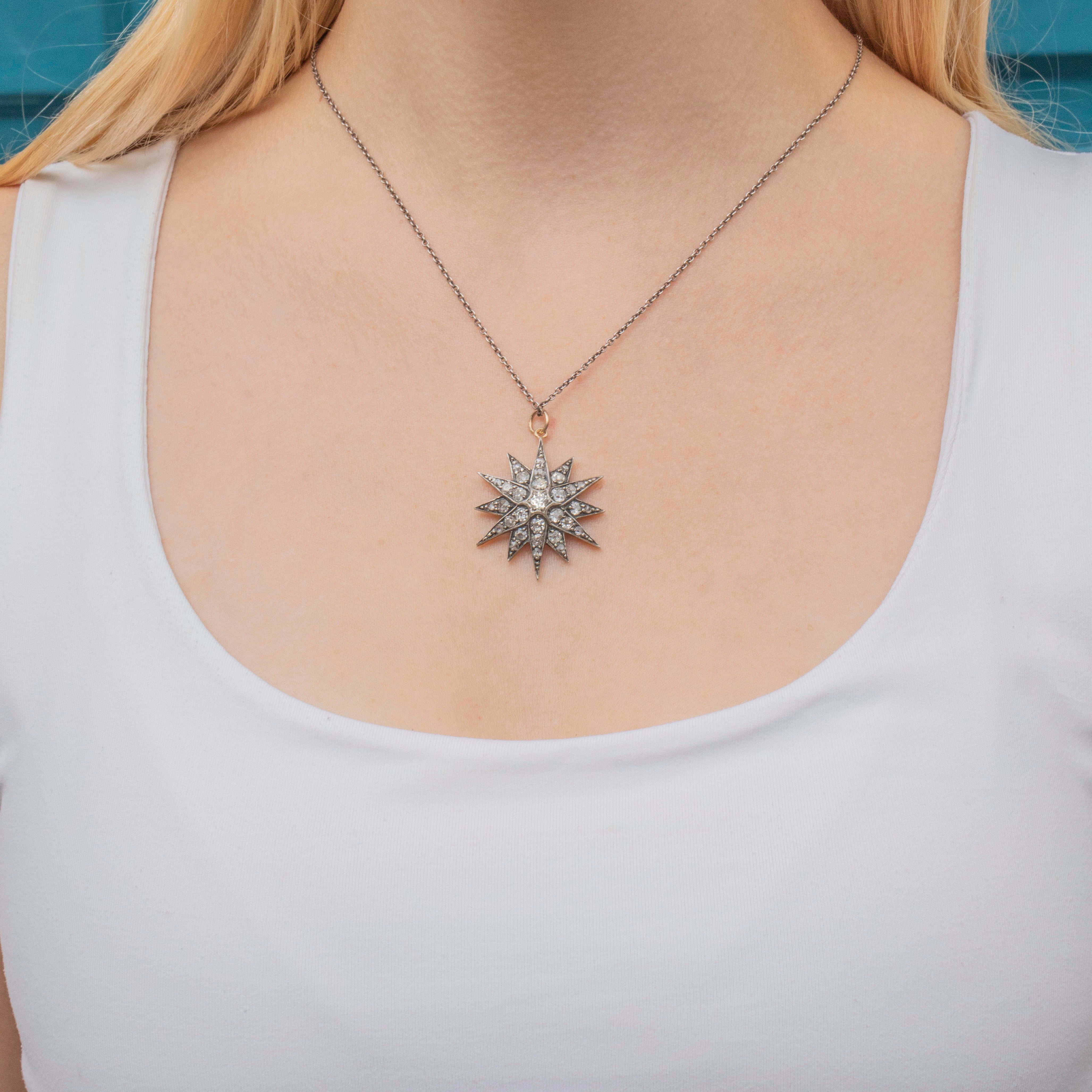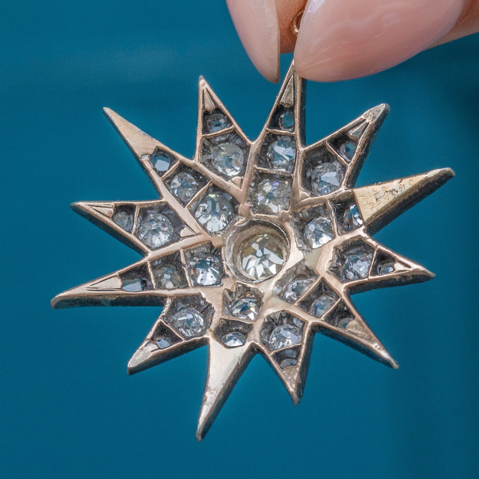 This phenomenal Victorian Silver Diamond starburst pendant is a dreamy treasure from the Victorian era, full of charm and elegance. The bold star design is crafted from Sterling Silver and backed with 9ct Gold, encrusted with scintiallting Diamonds with a combined weight of 1.82ct that catch the light magnificently - the central Diamond alone is 0.14ct!