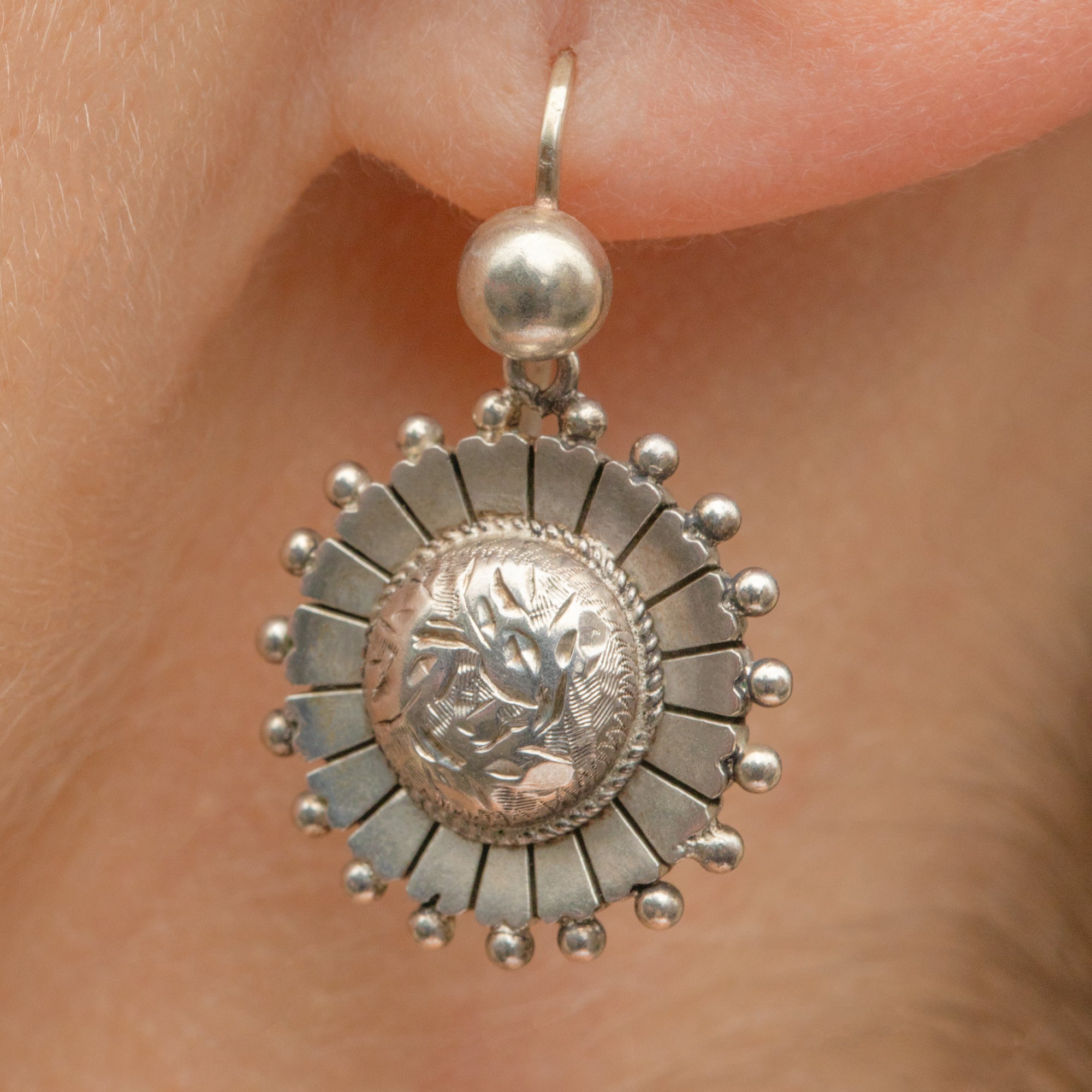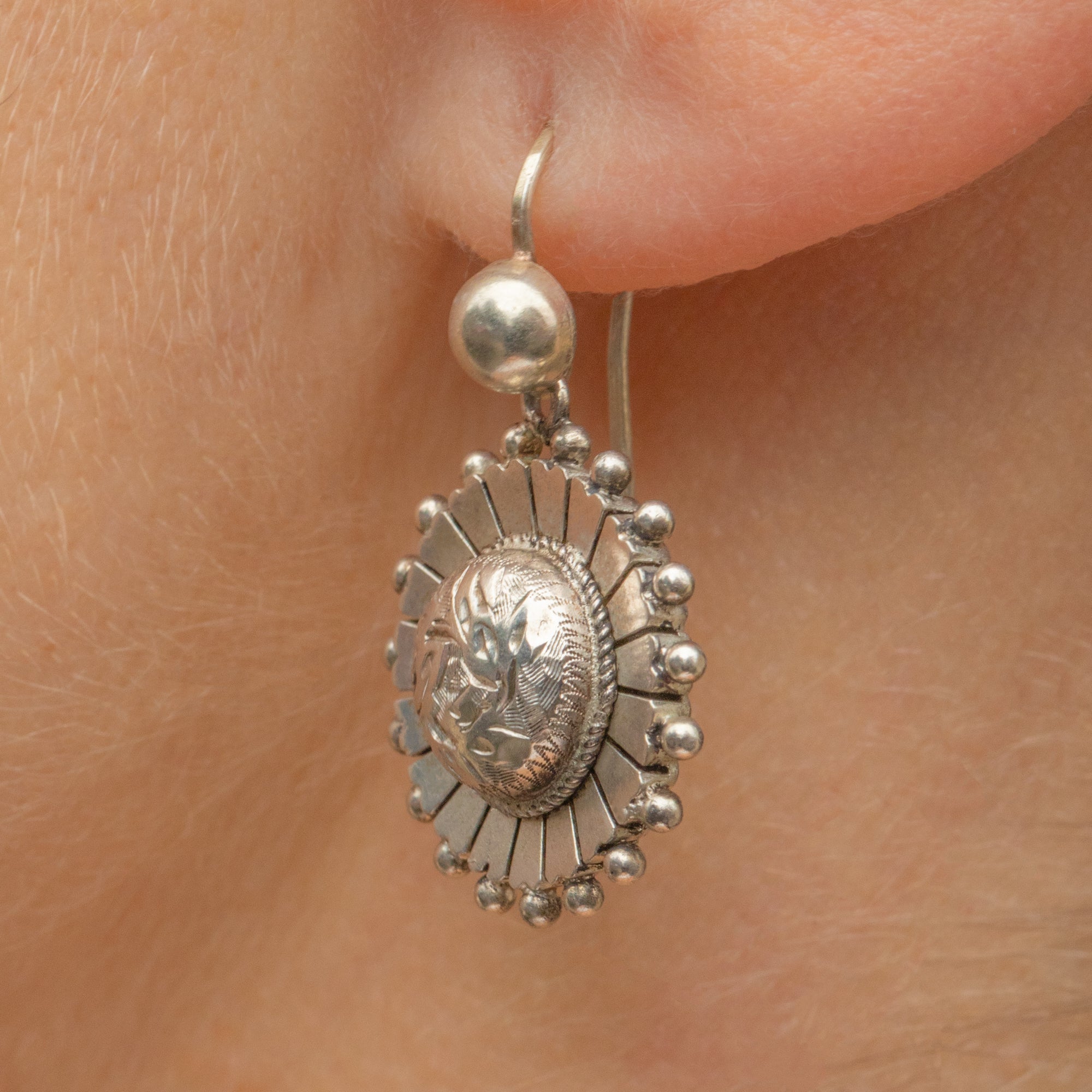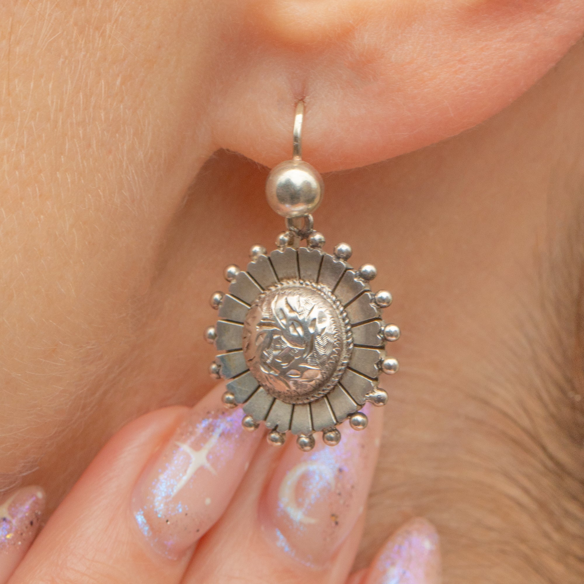 ビクトリアン シルバー 彫刻入りイヤリング ビーズエッジ付き