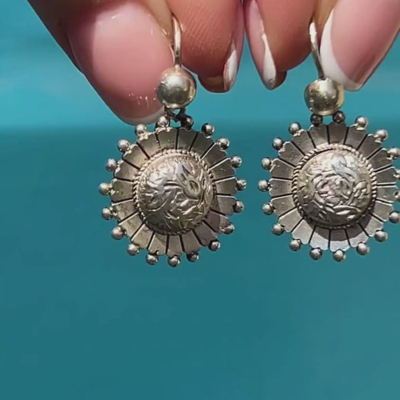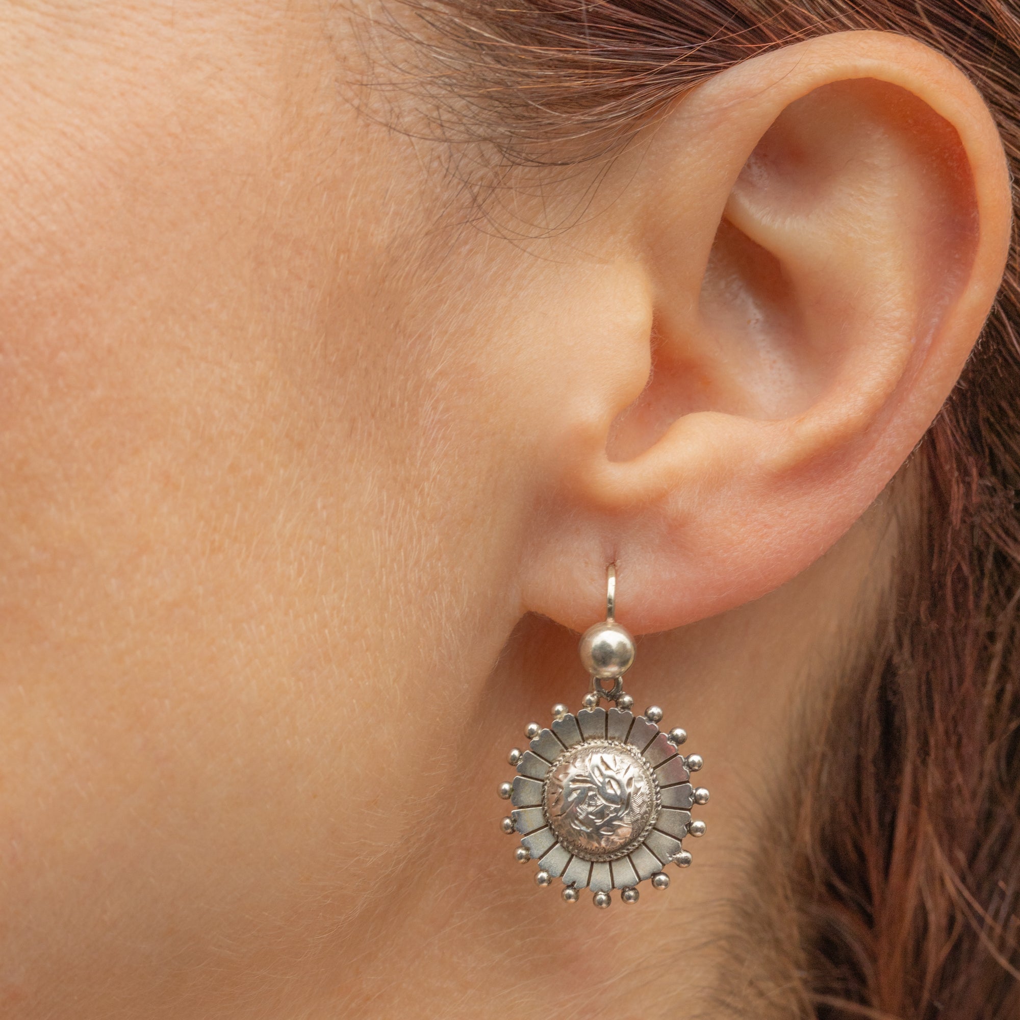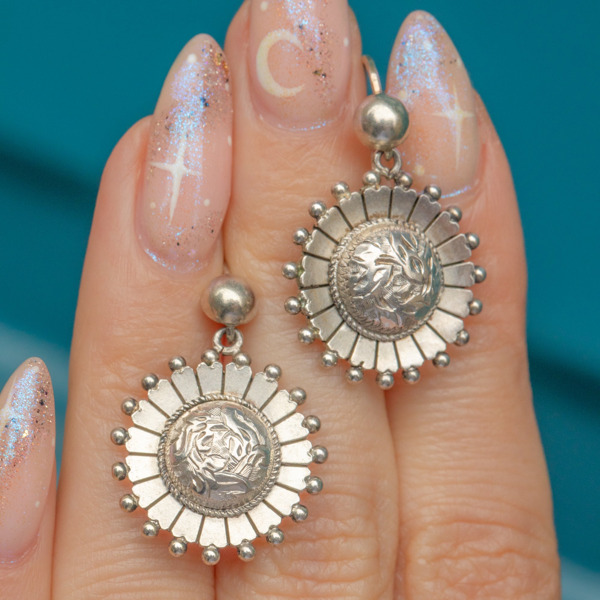 ビクトリアン シルバー 彫刻入りイヤリング ビーズエッジ付き