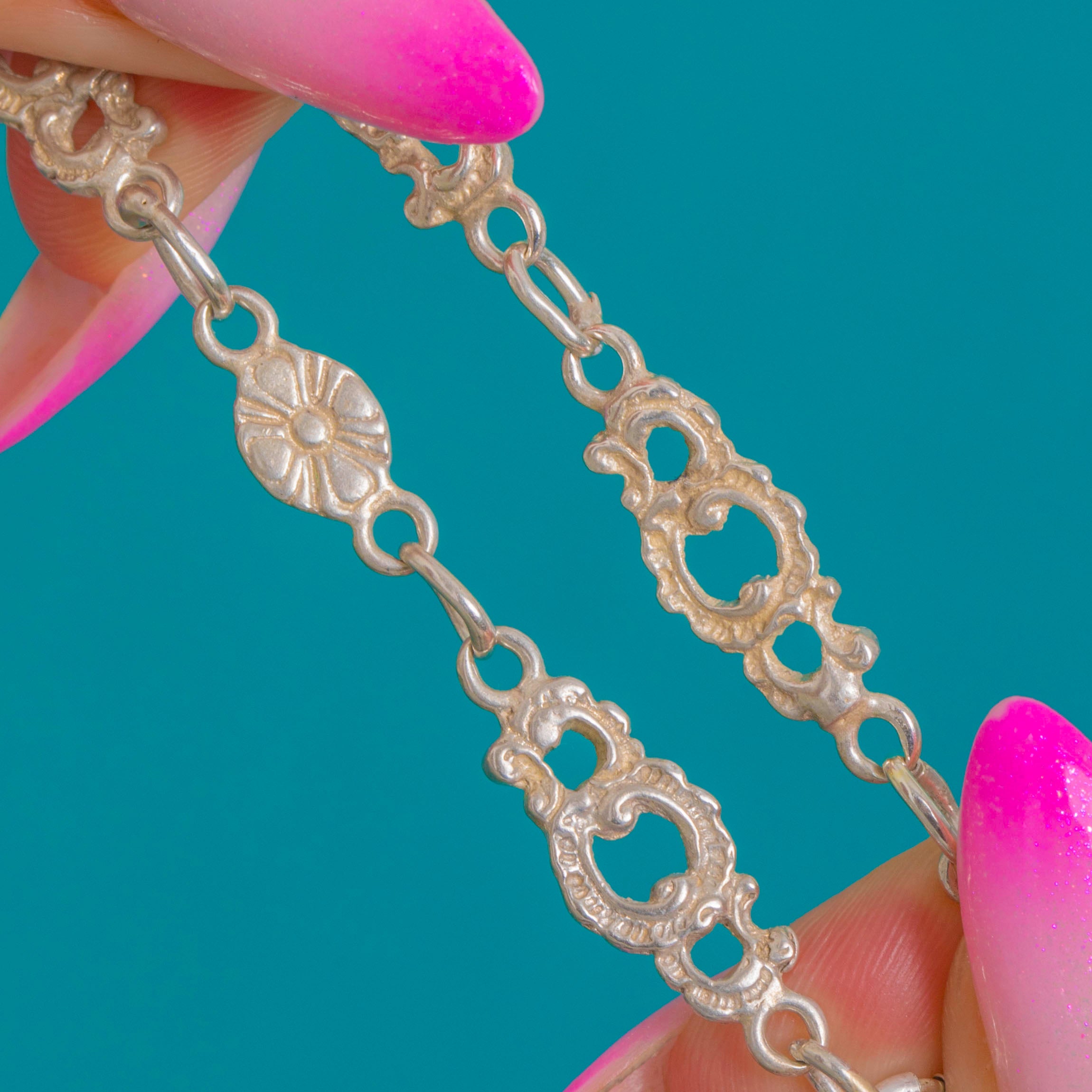 繊細で装飾的なこのVictorian期の銀製ブレスレットは、花のロゼット文様の円形パーツと透かし細工の曲線リンクが交互に連なっています。可憐な可動式のデザインは光を美しく反射し、窪み部分のほのかな酸化が愛らしい意匠を際立たせています。