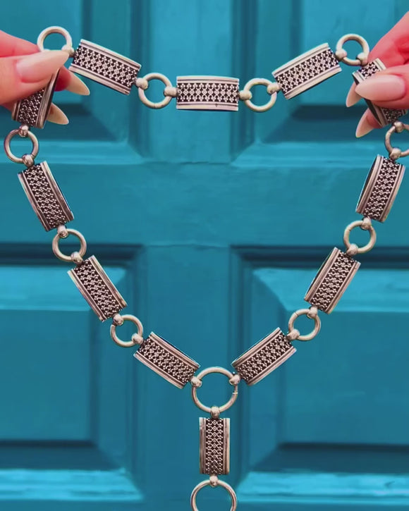 力強く美しい建築的な造形が際立つこのVictorian期のブックチェーンネックレスは、長方形の飾り板と重厚な丸型コネクターが交互に連なり、印象的で鎖骨に沿う優雅なシルエットを描きます。各飾り板には、立体的な粒状の格子模様が鮮やかな筋彫りの縁取りで囲まれ、燻し仕上げの窪みが銀の輝きに奥行きと趣を添えています。二つの大きなボルトリングが全体を引き締め、一つは留め具として、もう一つは前面に配され、装飾的な垂れ飾りやペンダント、ロケットの実用的な吊り下げとしてもお使いいただけます。