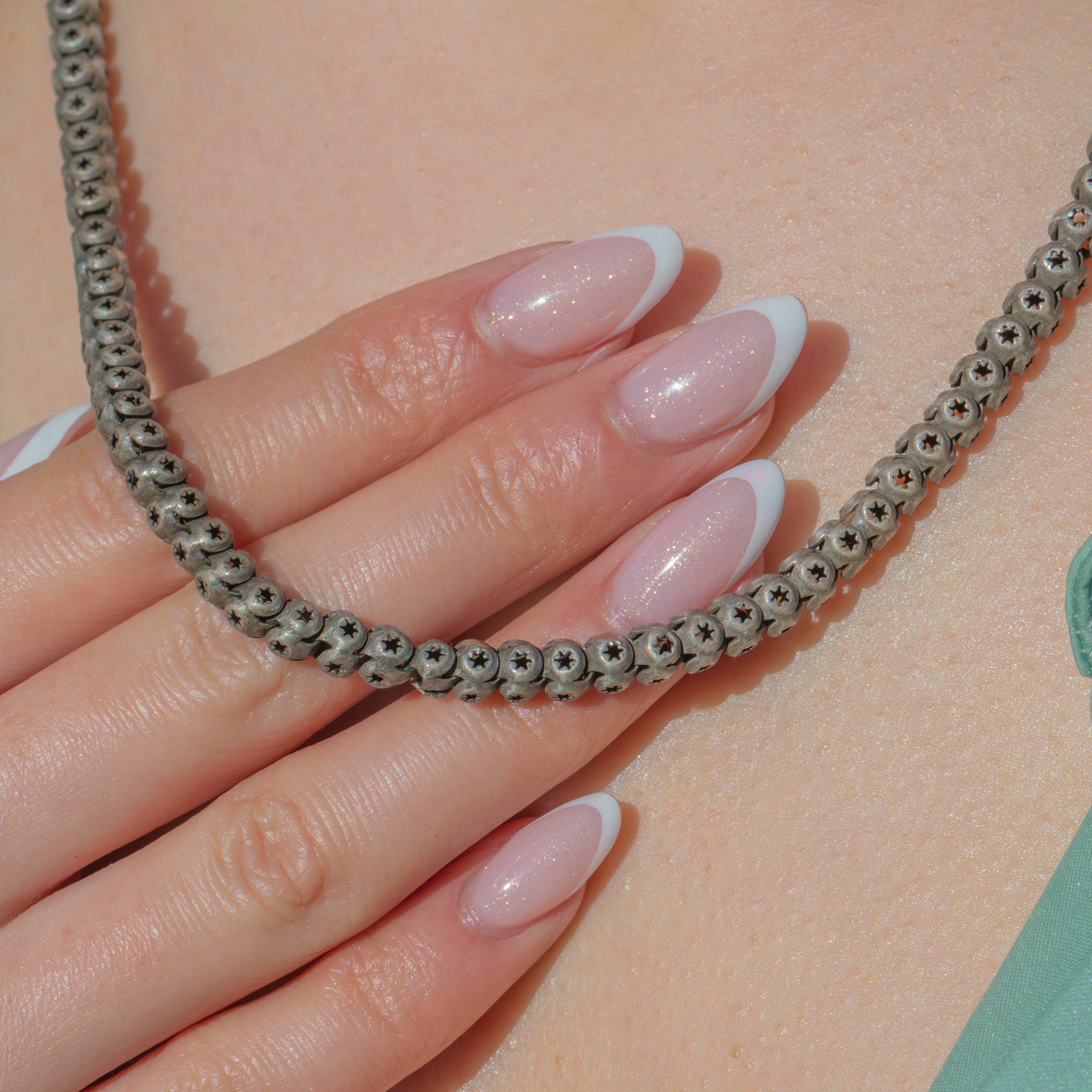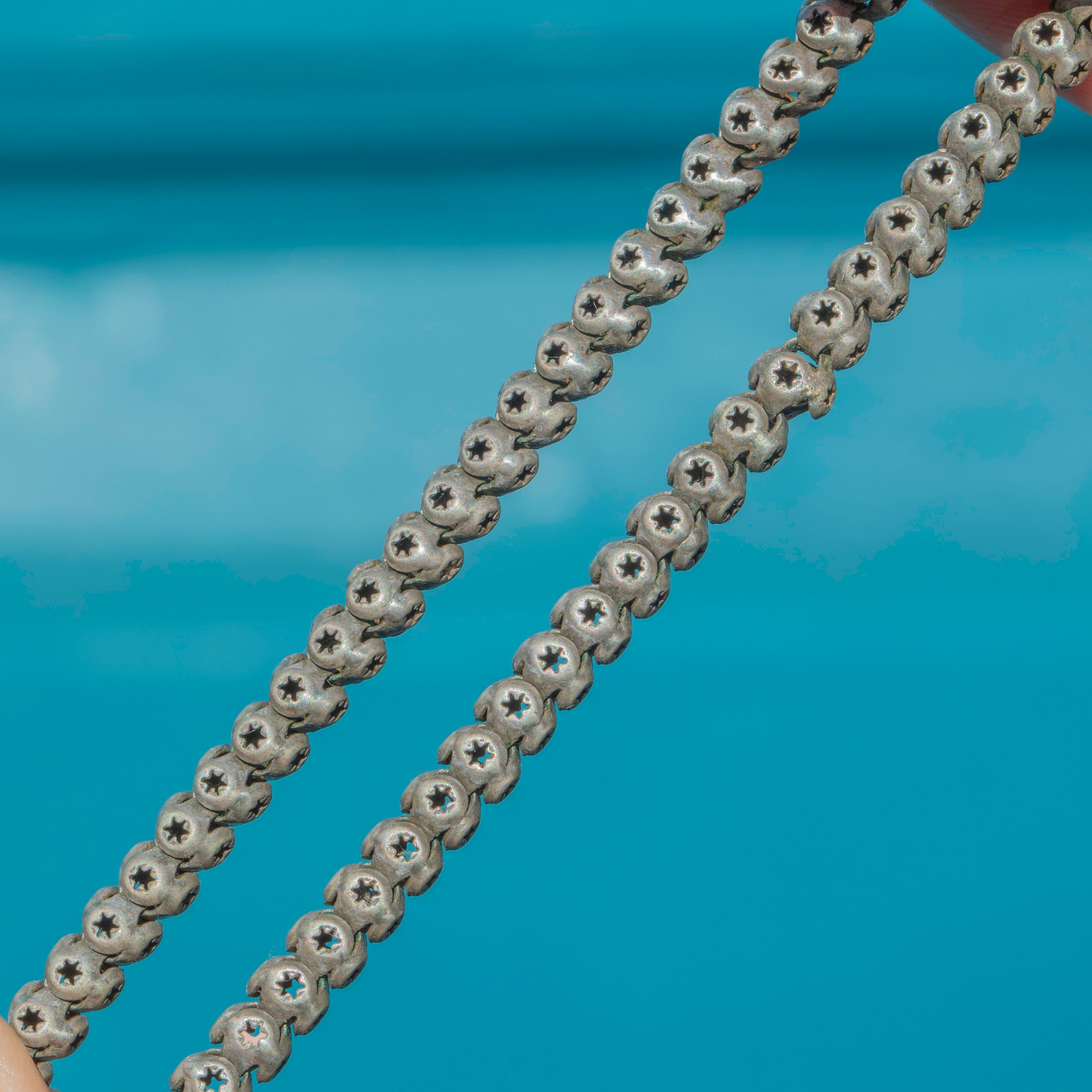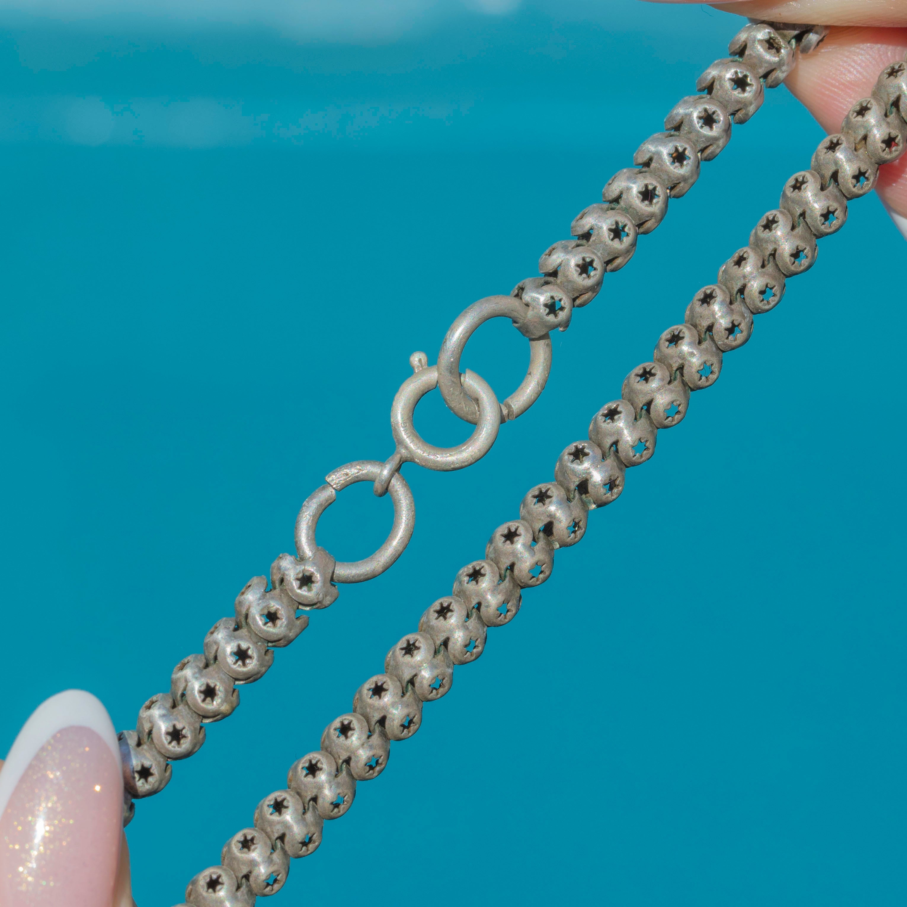 GOOD: This Victorian Silver pierced star link chain is in good condition. The links are securely connected, and although some of them have sustained some damage, including distortion and dings, this does not detract from the overall impact of the piece. The Silver has accrued an admirable patina over the years, adding to her antique charm. The pierced star details have remained defined and stand out against the darkened Silver. Closing securely with the use of its bolt ring, you can enjoy wearing this statement Victorian chain with absolute confidence!