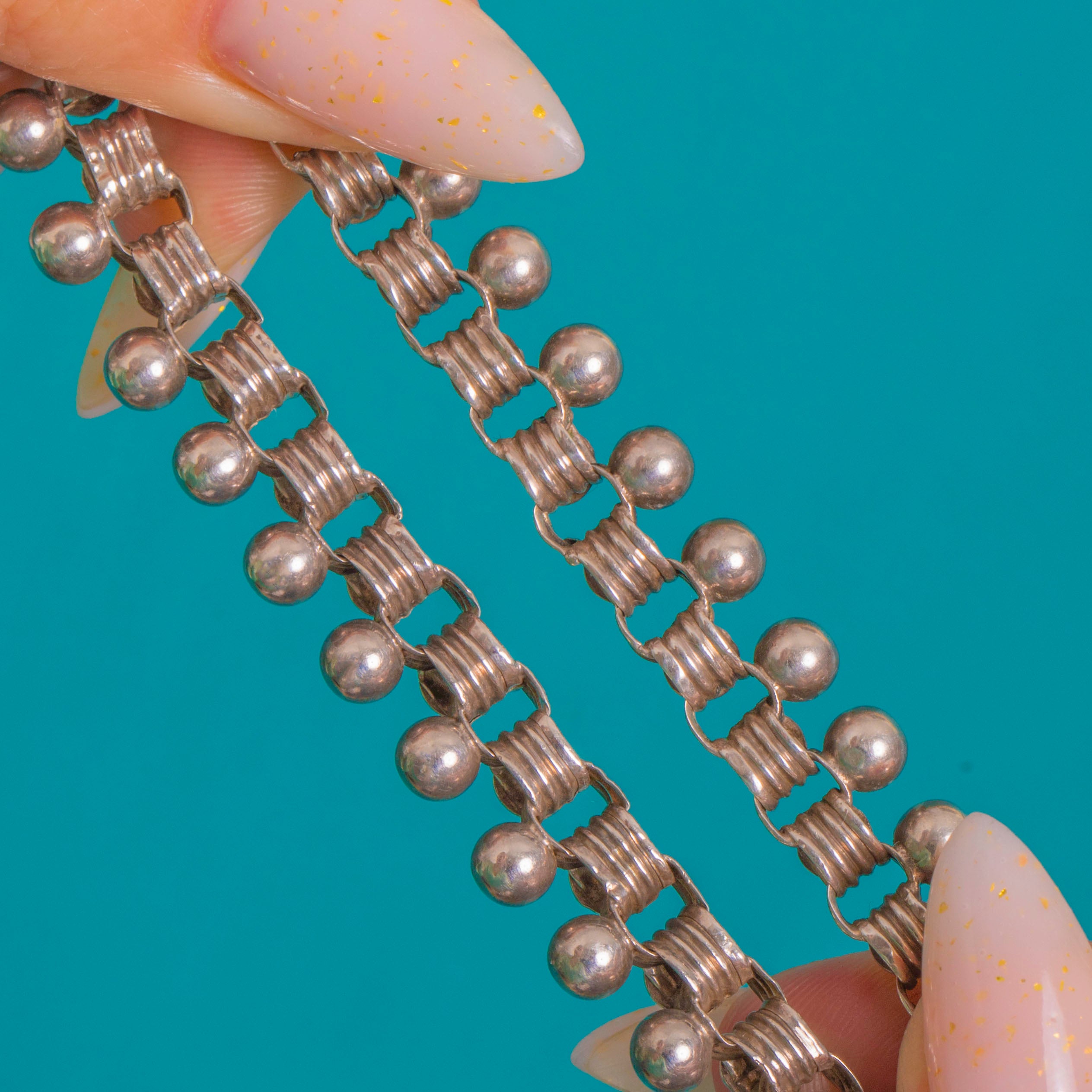 A bold Victorian book-chain collar with rhythmic presence, this necklace is composed of articulated links with pierced star motifs and finished with a continuous fringe of smooth beads. The broad, structured construction sits close to the neck, giving a refined yet statement silhouette with elegant movement.