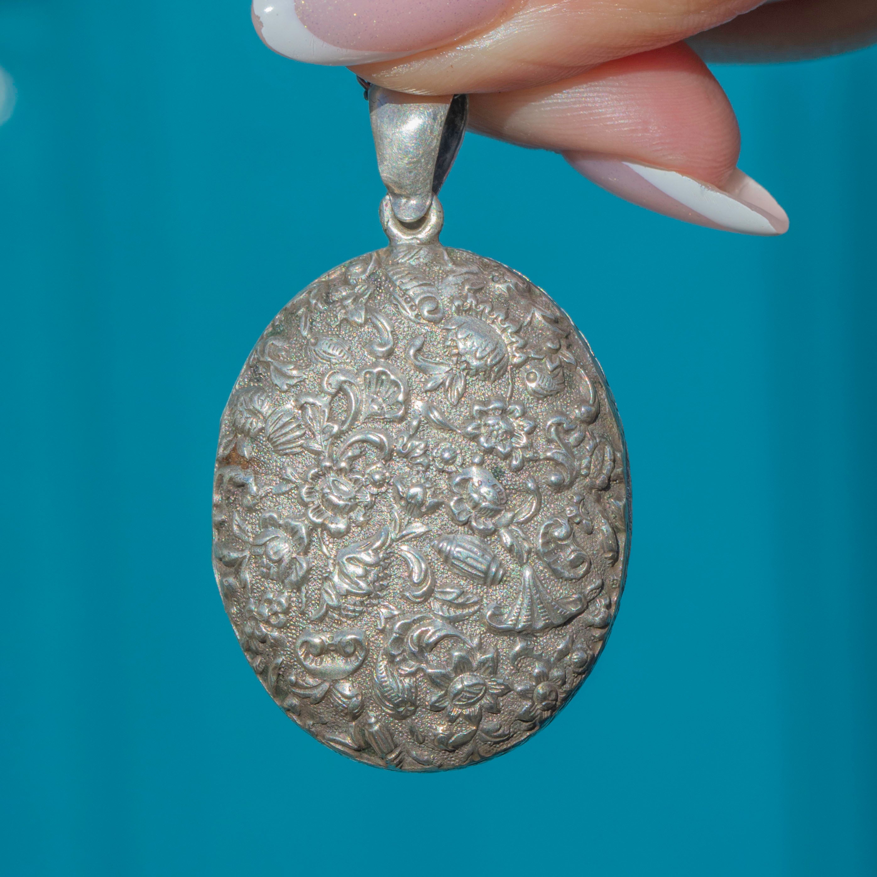 From thistles to forget-me-nots and dainty shells, this Victorian Silver locket is steeped in romantic sentiment! The impressive size of this repoussé locket makes it the ultimate statement piece, and with space for you to place a cherished photograph inside, she will make a sentimental addition to your collection.