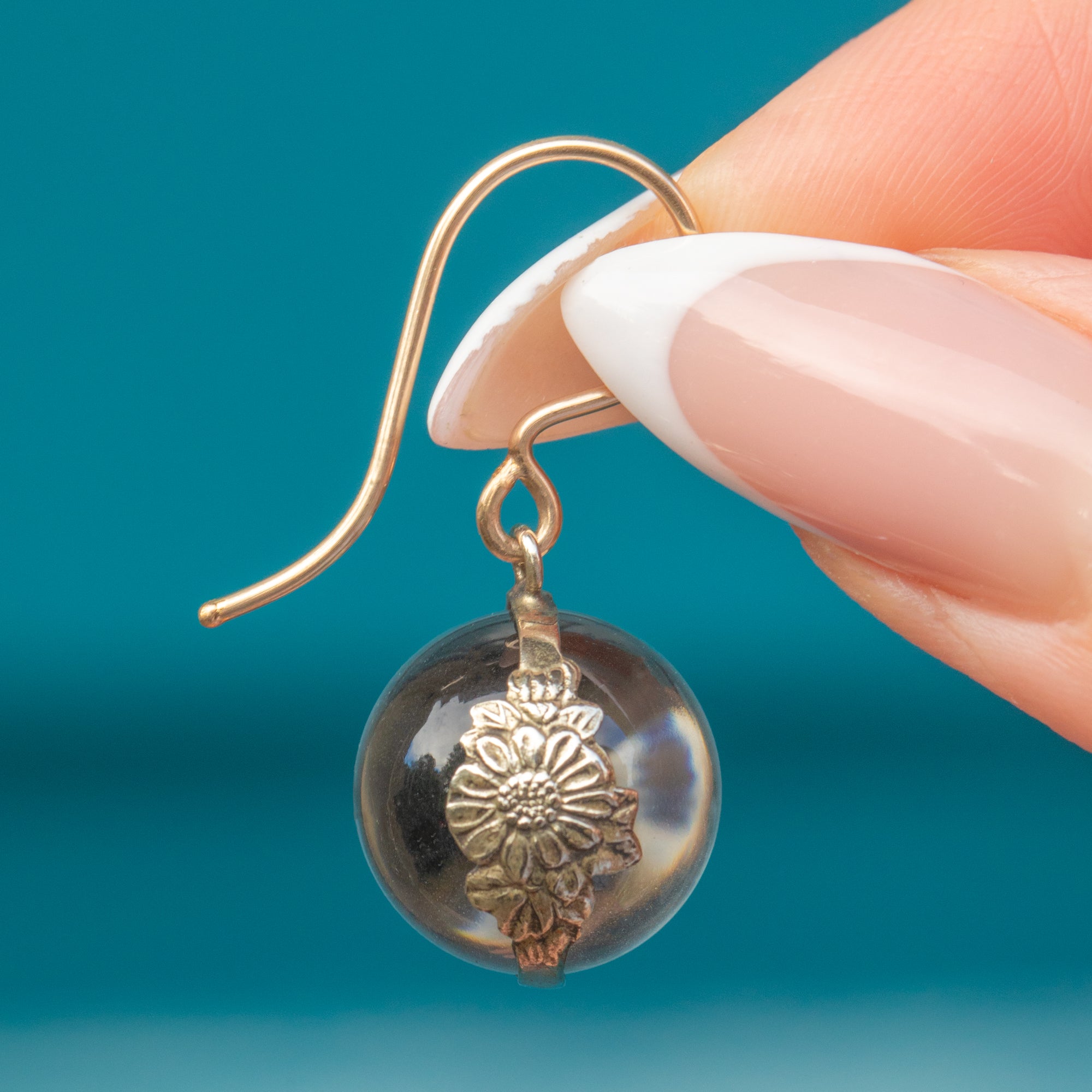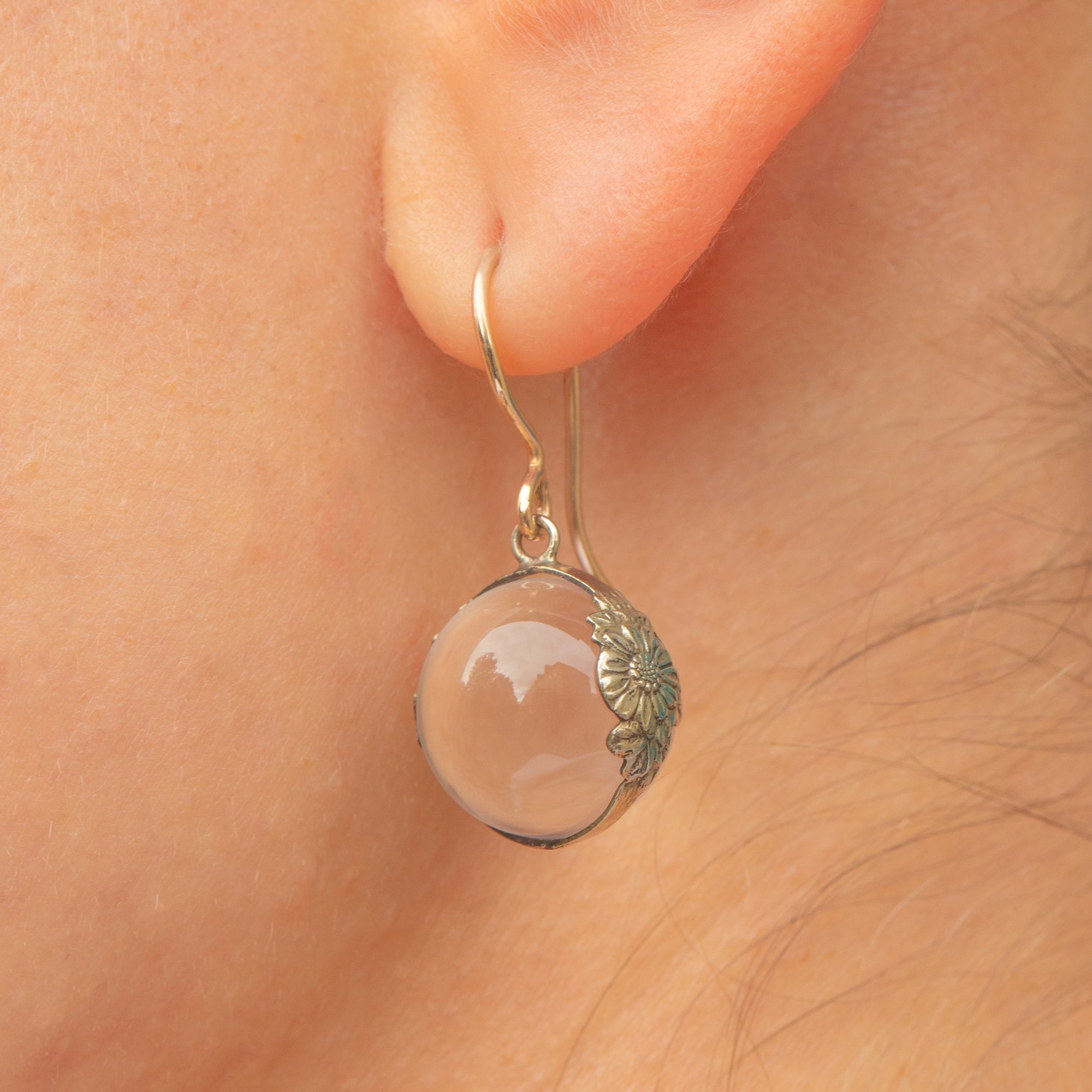 A dreamy pair of Victorian “Pools of Light” earrings, featuring luminous Rock Crystal orbs that seem to capture and magnify the world within them. The clear, spherical crystals have a mesmerising quality, appearing almost to glow from the inside as they catch the light with every movement. They are beautifully mounted in Sterling Silver with delicate floral motifs, and finished with 9ct Gold hooks for comfort and elegance.