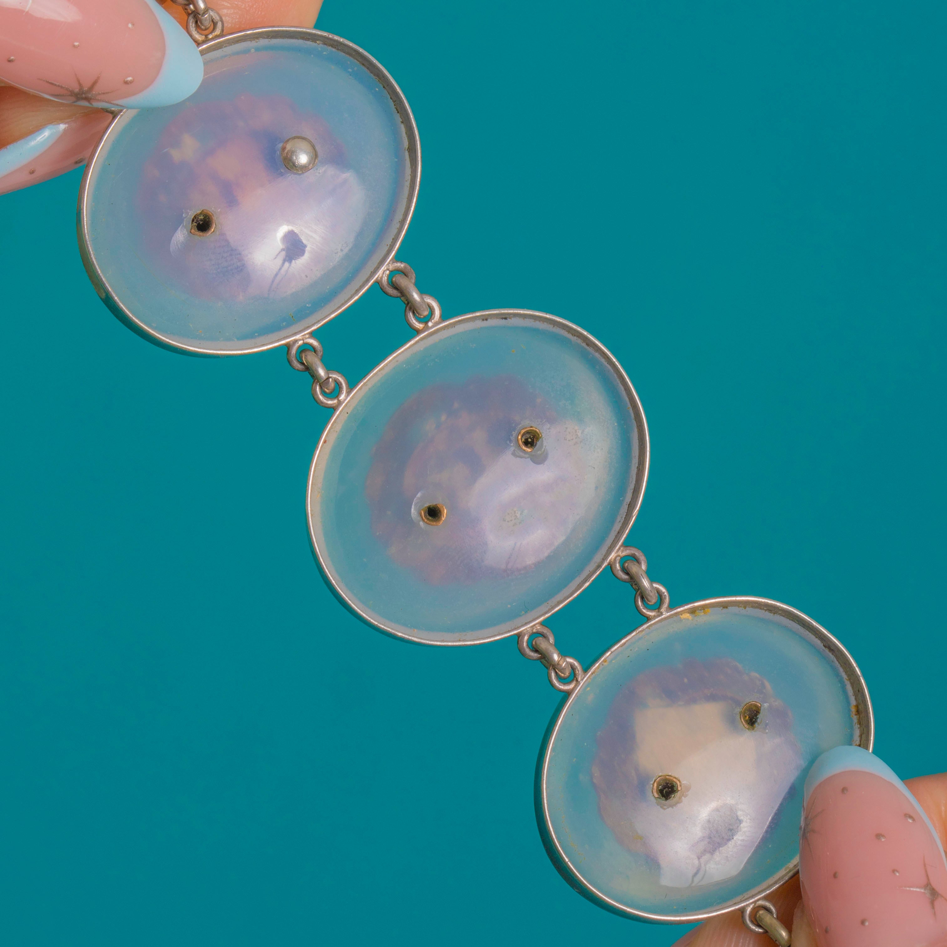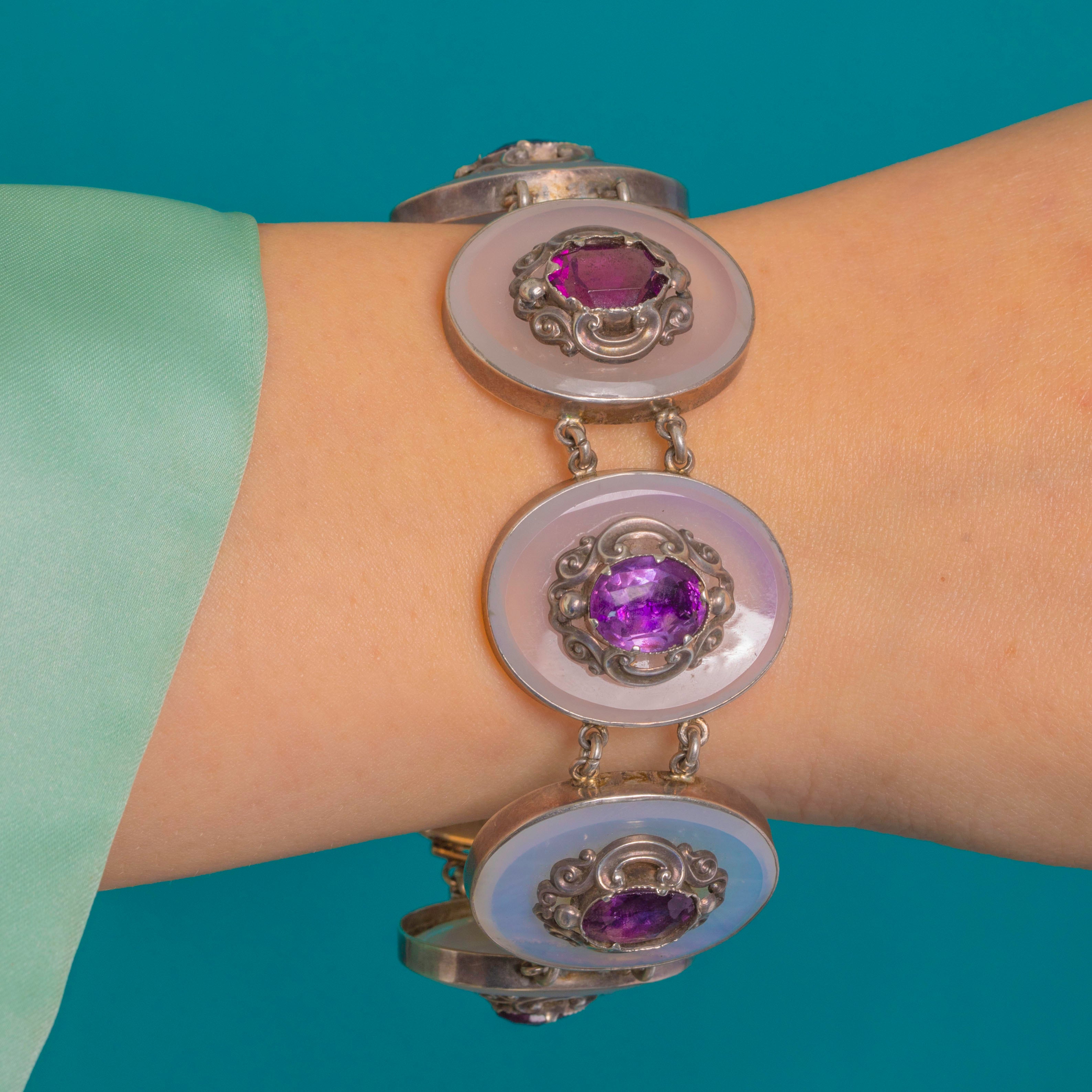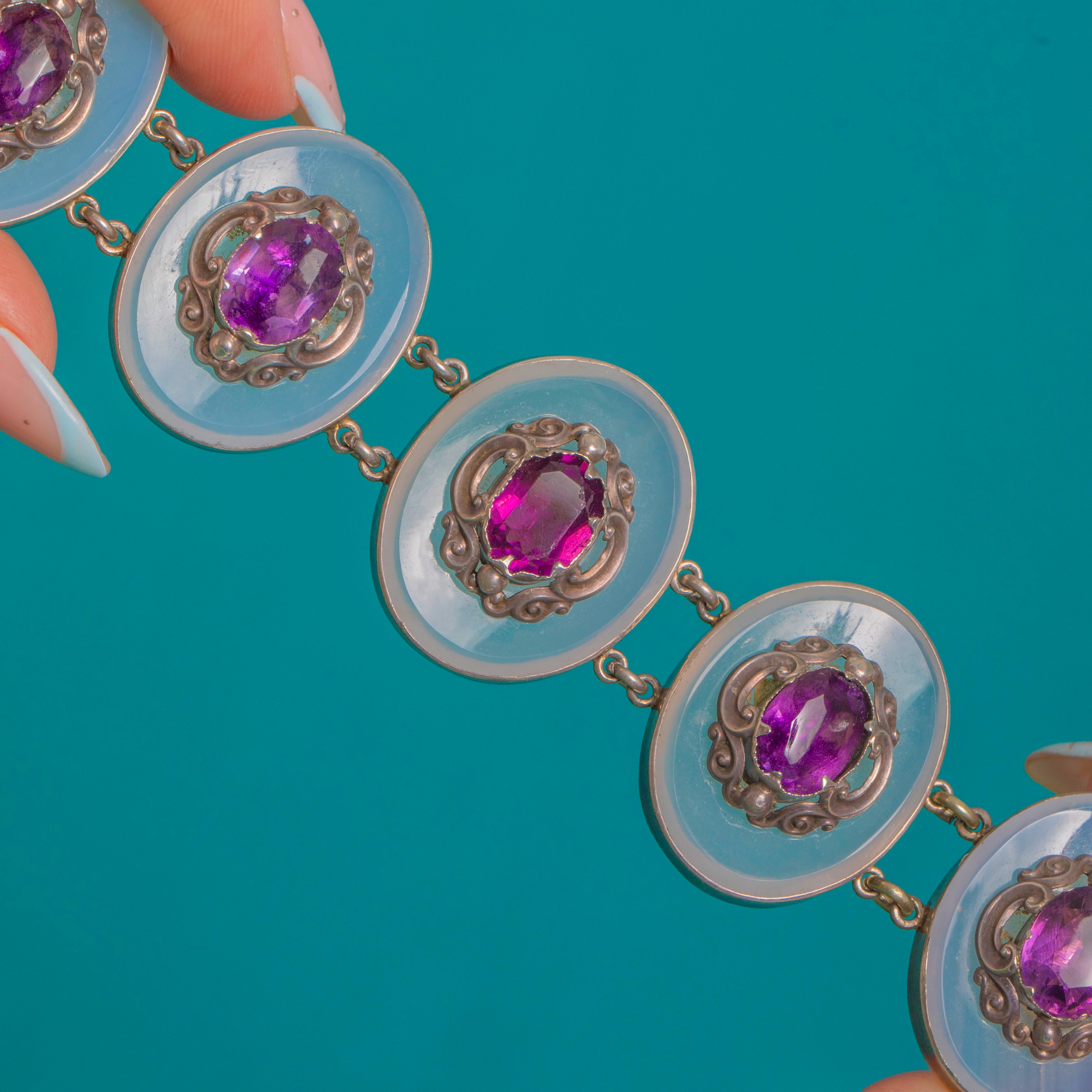 VERY GOOD: The White Chalcedony discs show light surface abrasions commensurate with age; the purple stones display minor facet and surface wear with bright colour retained. The Sterling Silver panels, articulation, and box clasp with safety chain are secure, with a gentle patina that enhances the detail. Two stones are later Purple Paste replacements (one adjacent to the clasp and one centrally), and some small screws to the backs of certain links are absent; this does not affect the security or wear of the bracelet.