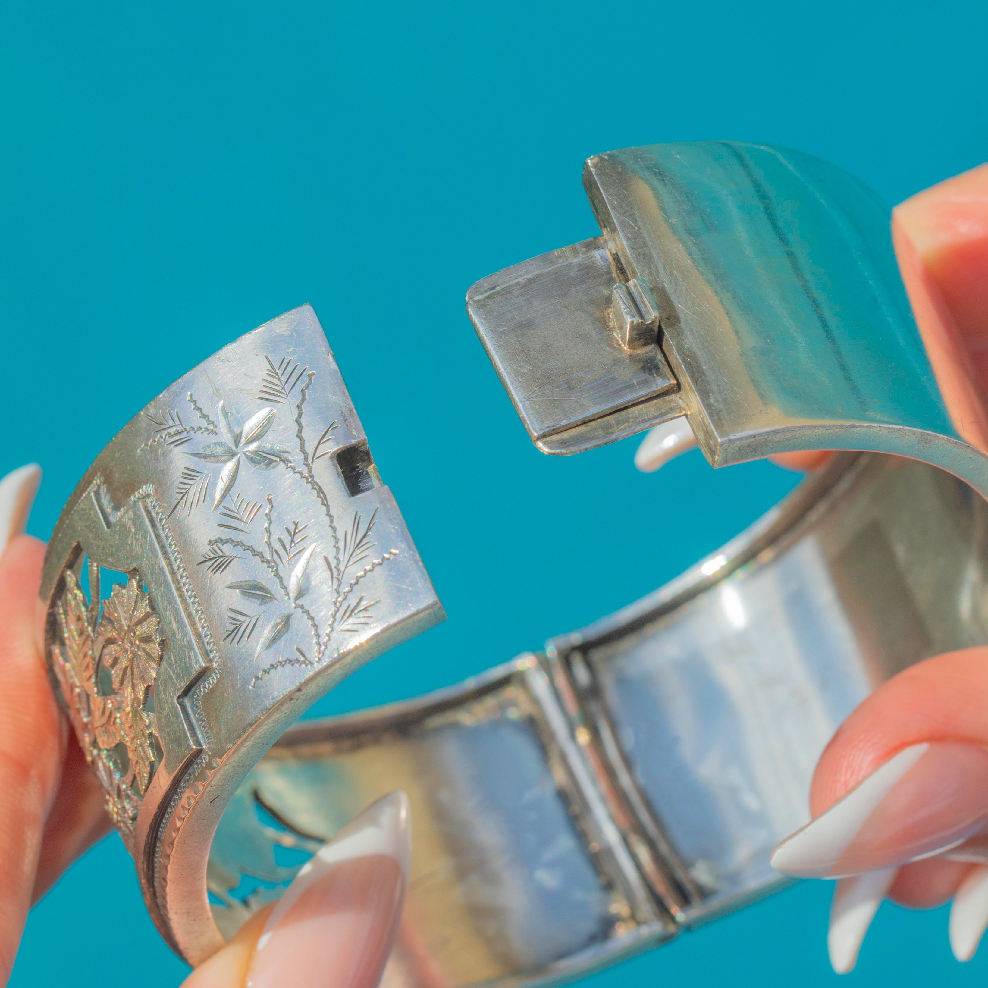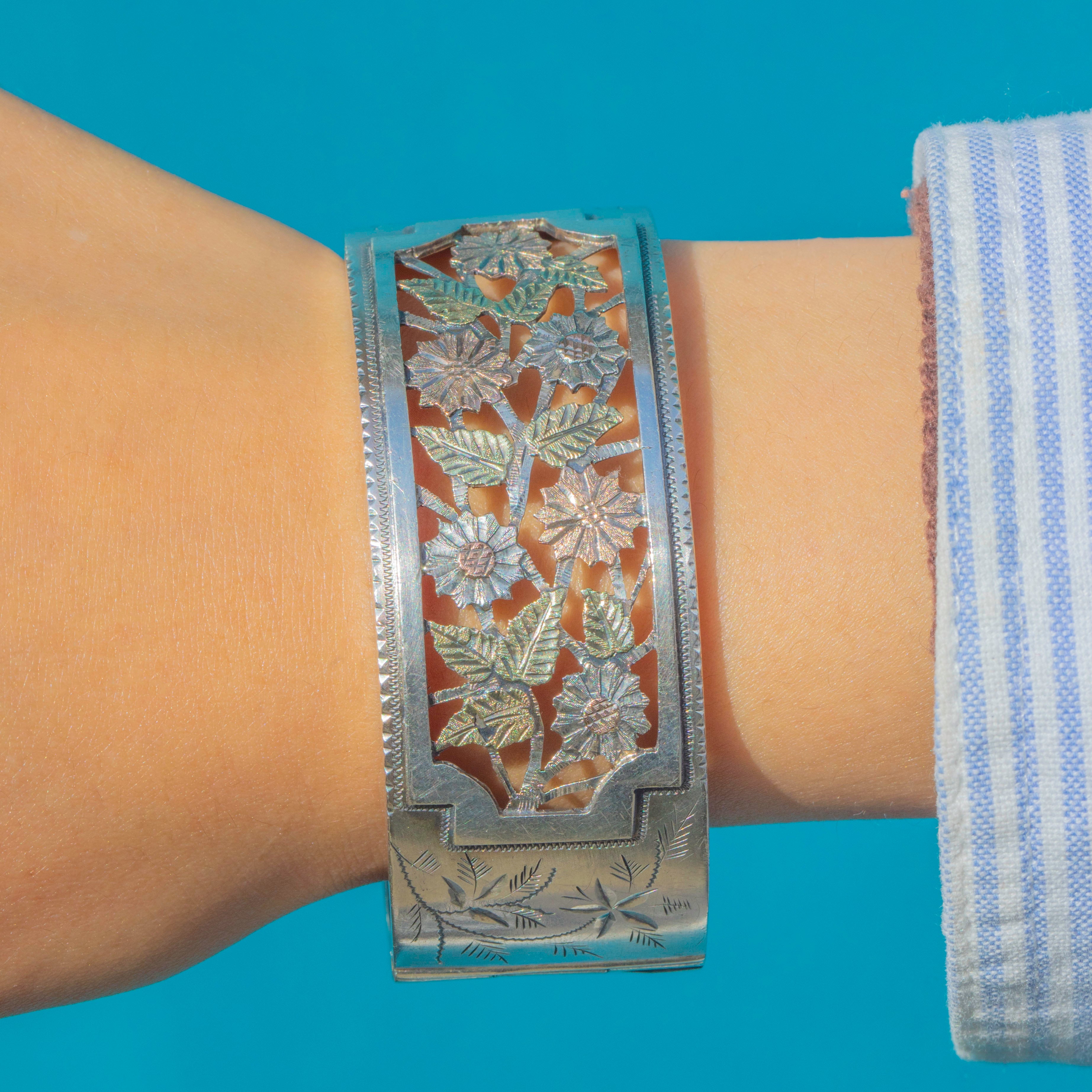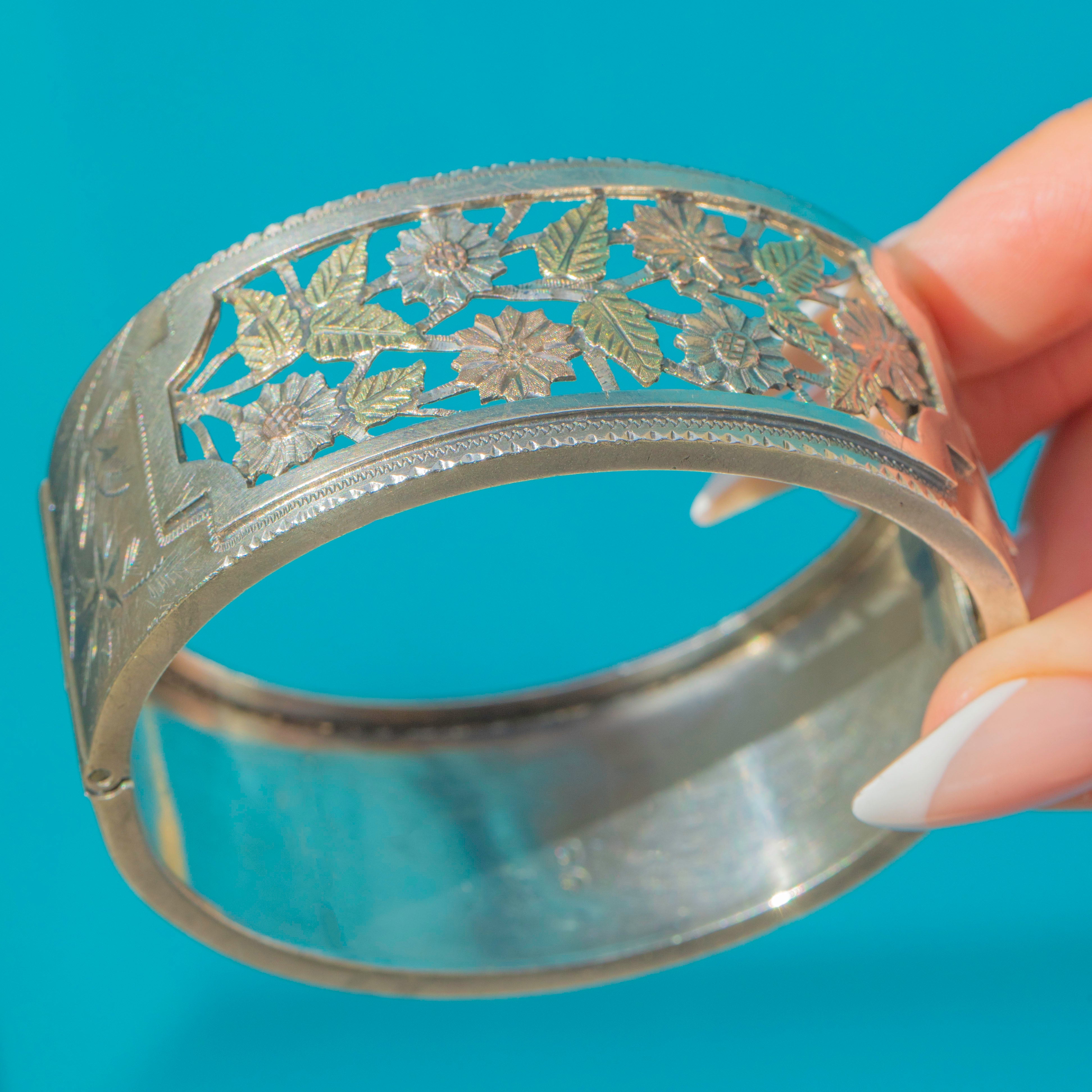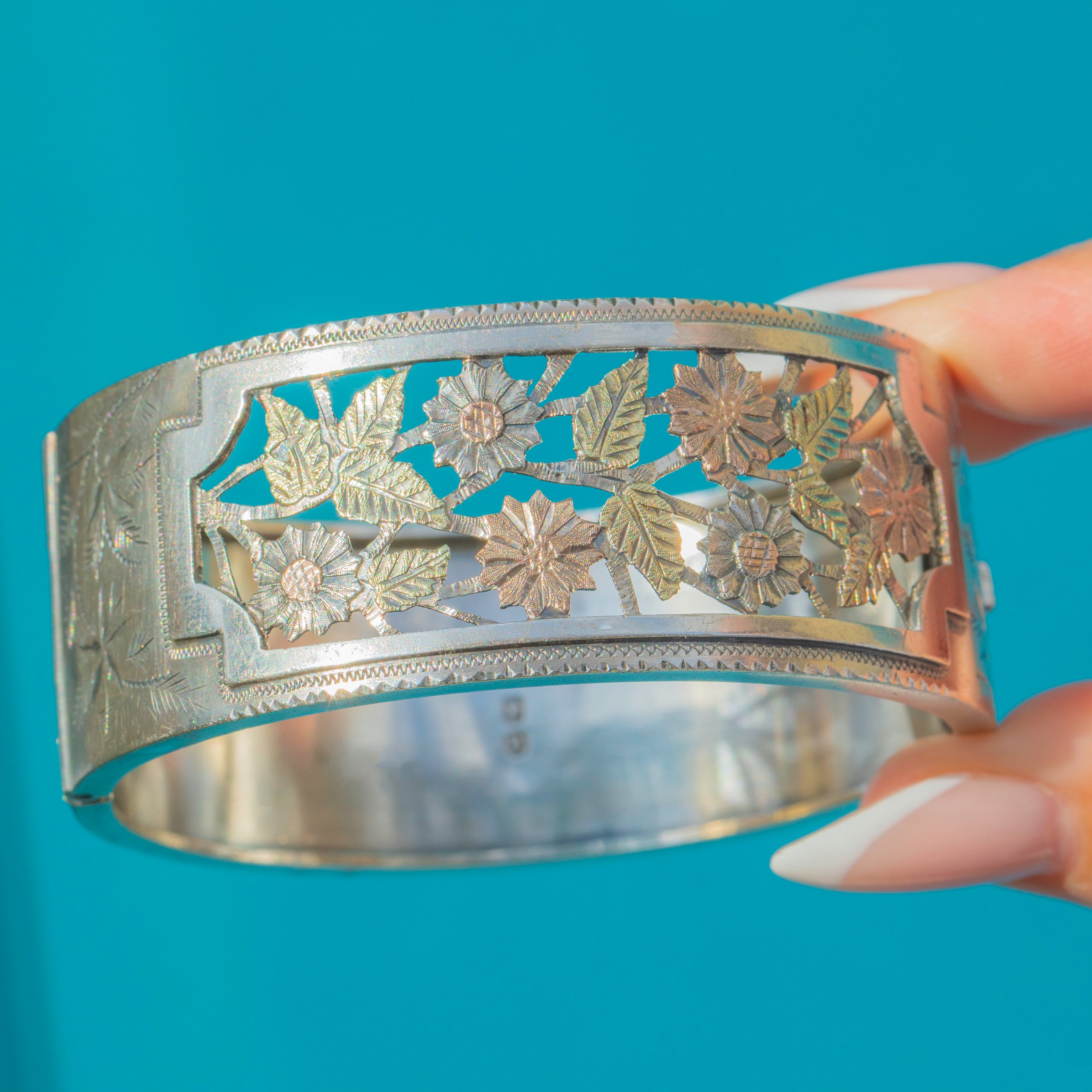 This rare Victorian Aesthetic bangle is an outstanding example of 19th-century craftsmanship. Made in 1884, the wide Sterling Silver form is decorated with hand-cut filigree, its openwork filled with finely wrought daisies in 9ct Rose and Green Gold. The detail is exquisite, with naturalistic petals and leaves brought to life through contrasting Gold tones.