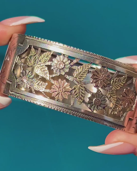 Victorian Sterling Silver 9ct Rose Gold and Green Gold Daisy Filigree Bangle c.1884