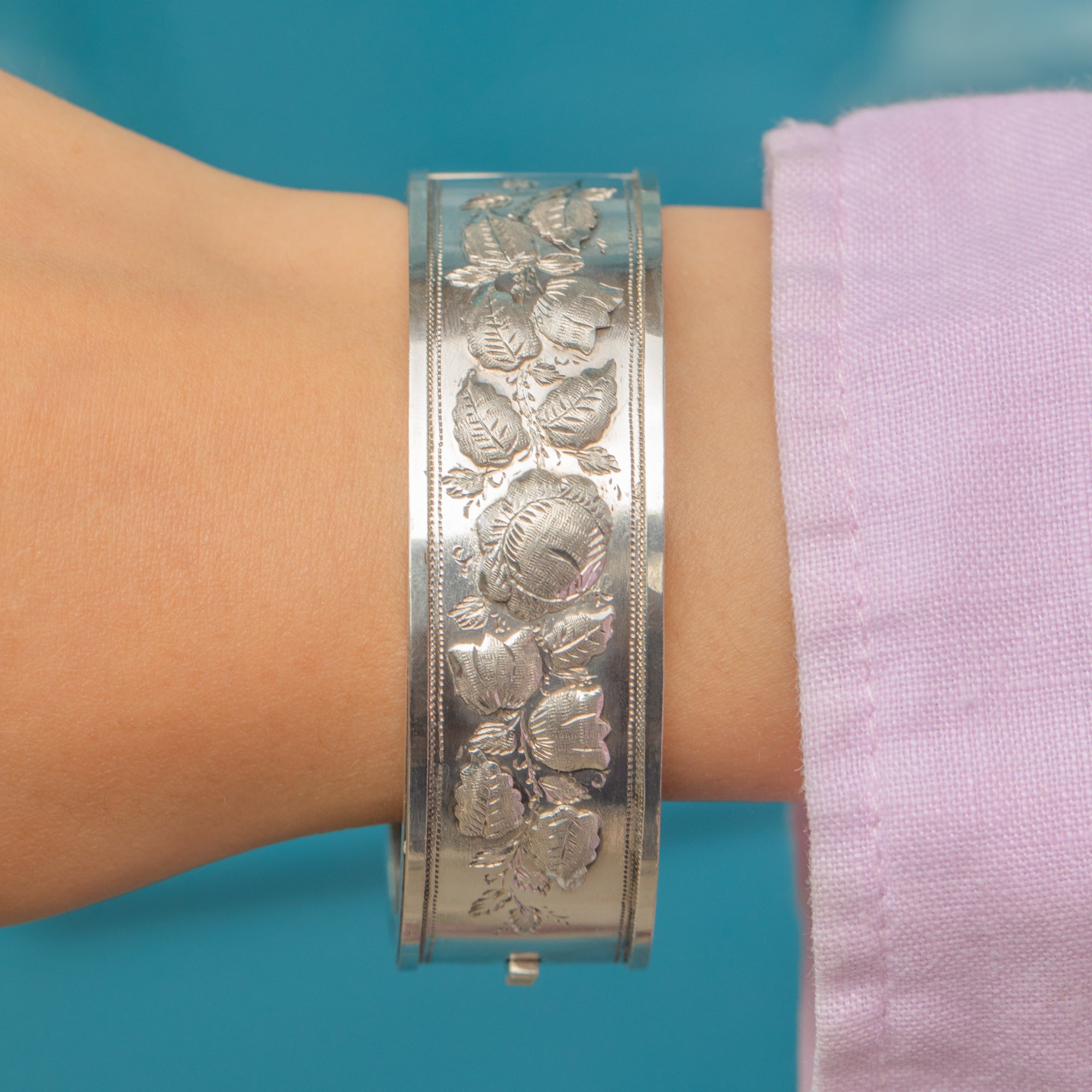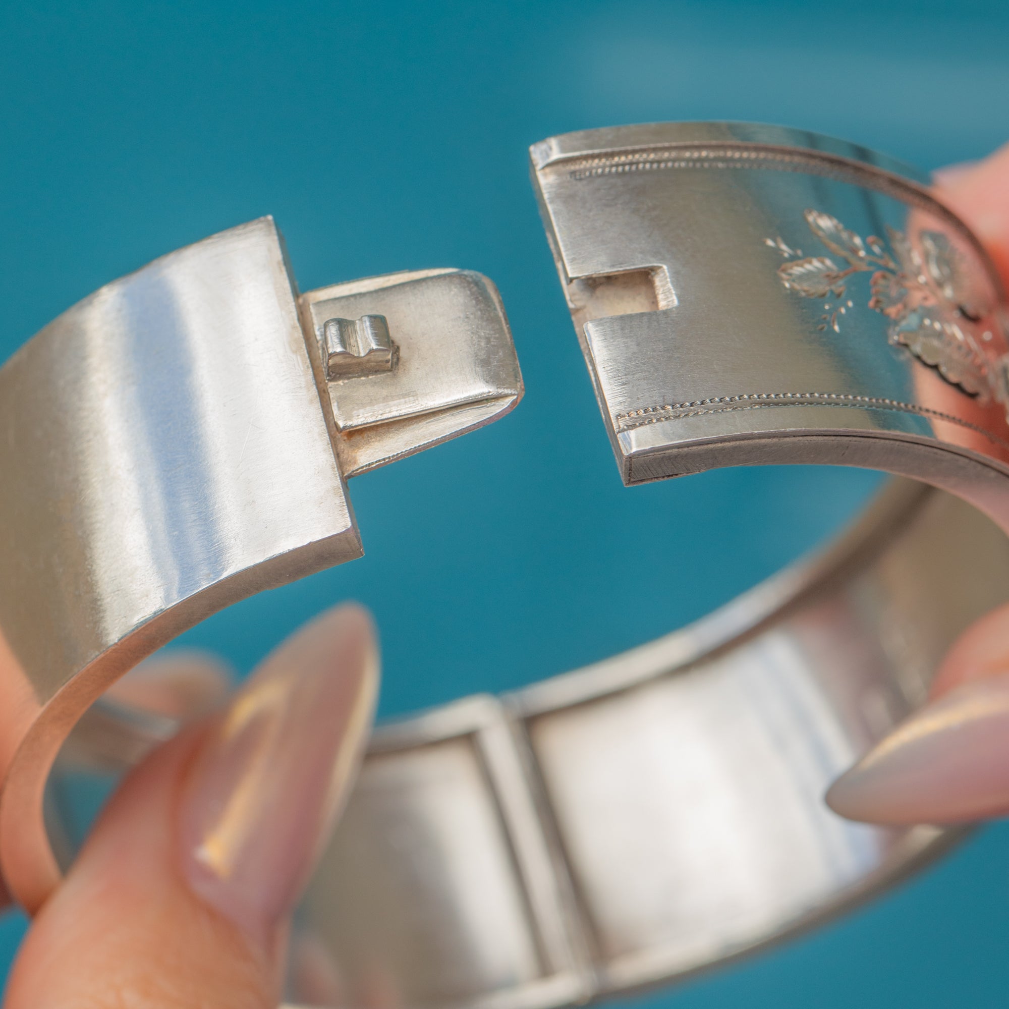 This Victorian Sterling Silver bangle is a beautiful example of the Aesthetic Movement, decorated with repoussé rose and leaf motifs across the front. The finely detailed flowers are framed by neat beaded edging, giving the piece both texture and elegance.