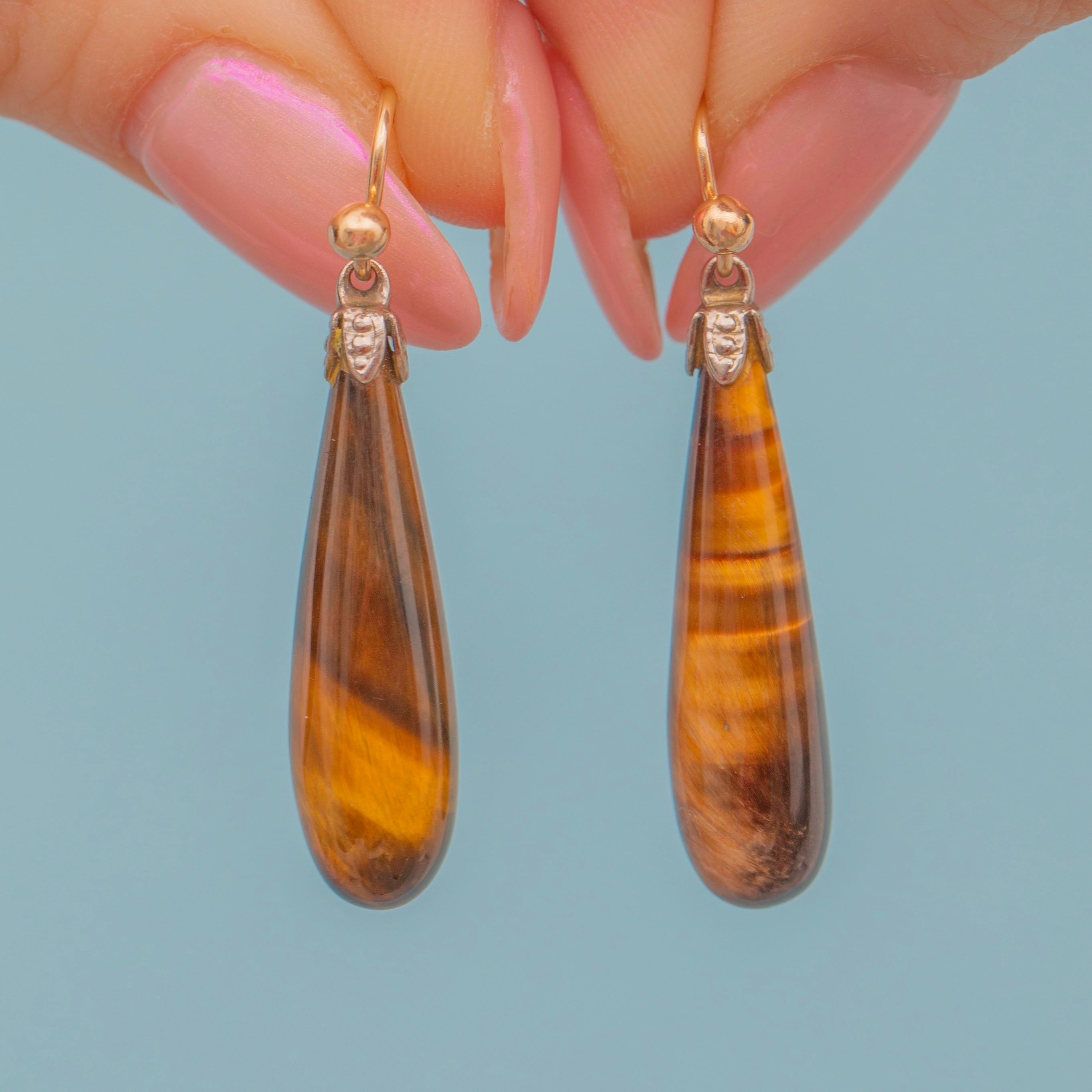 EXCELLENT. These Victorian Tiger's eye torpedo drop earrings are in excellent condition. Each stone has a lovely sheen and is free from visible signs of wear. Her hooks are secure, allowing for confident and comfortable wear.