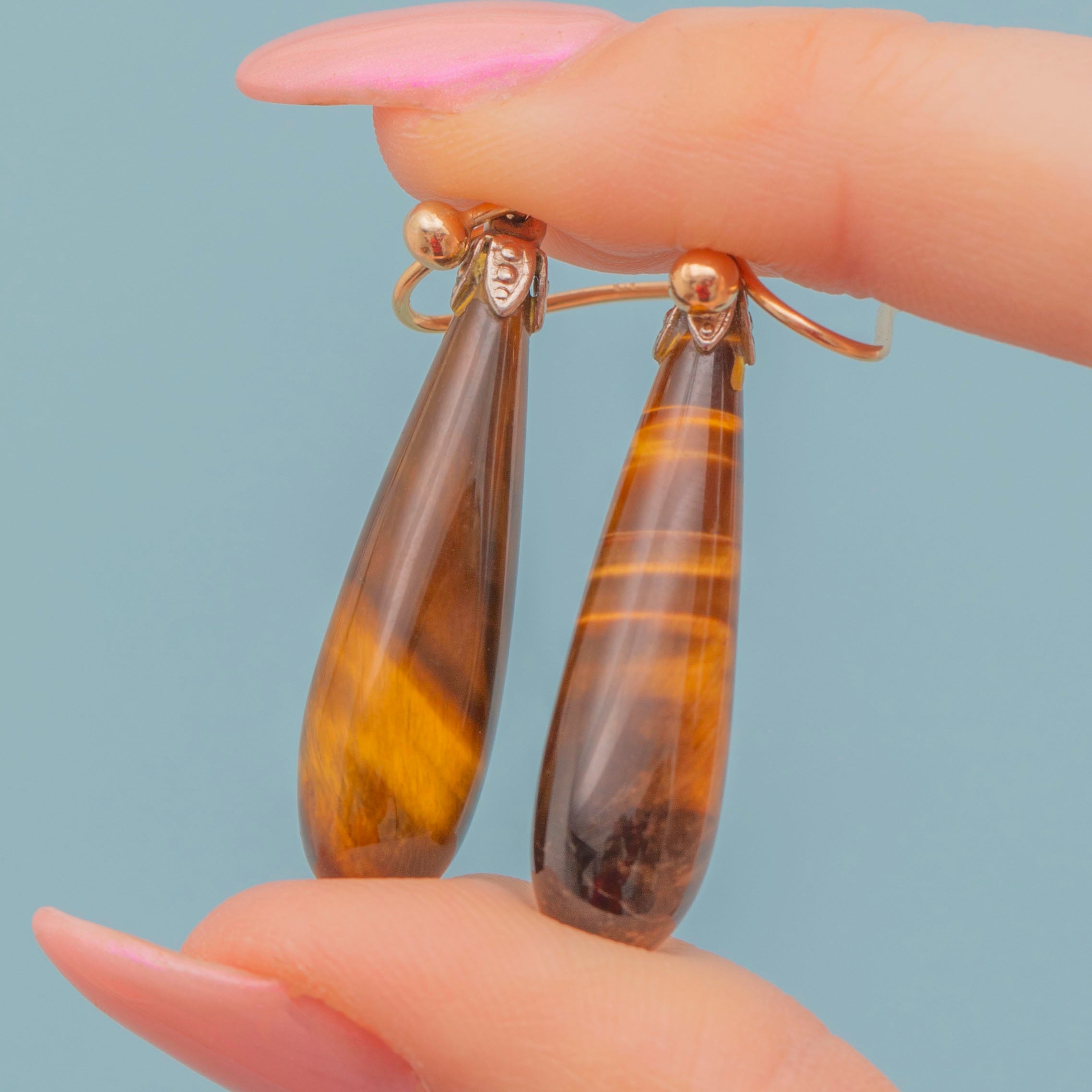 Add a touch of autumnal warmth to your collection with these gorgeous Victorian Tiger's eye torpedo drop earrings!