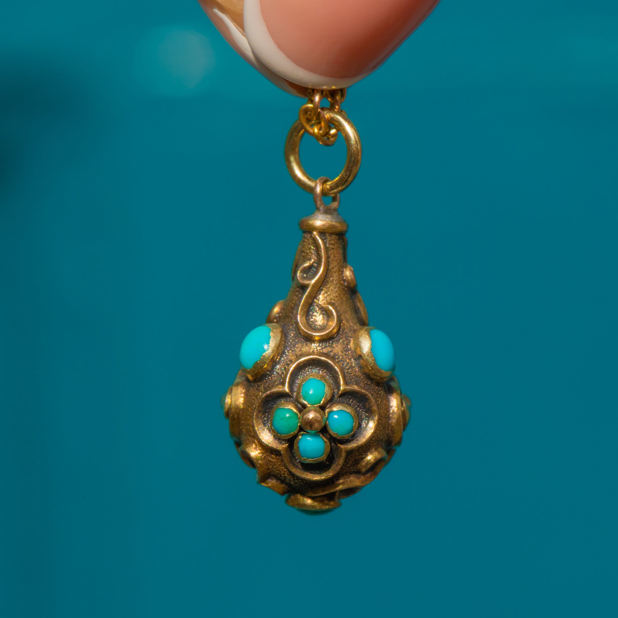How divine is this Victorian Turquoise forget-me-not drop charm?! Formed into the perfect teardrop, her gilded body is adorned with Turquoise cabochons positioned to form delicate forget-me-nots, encompassed by 9ct Gold borders.